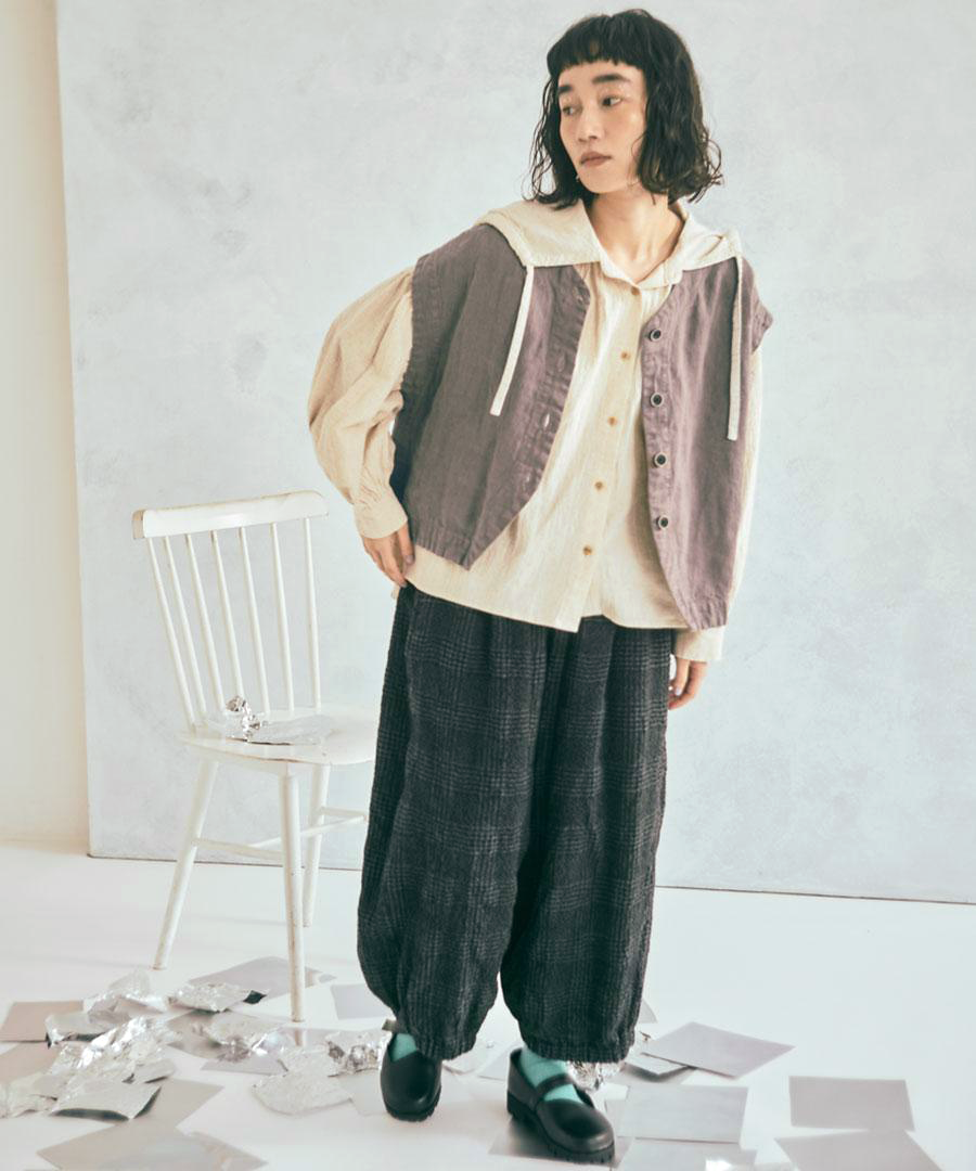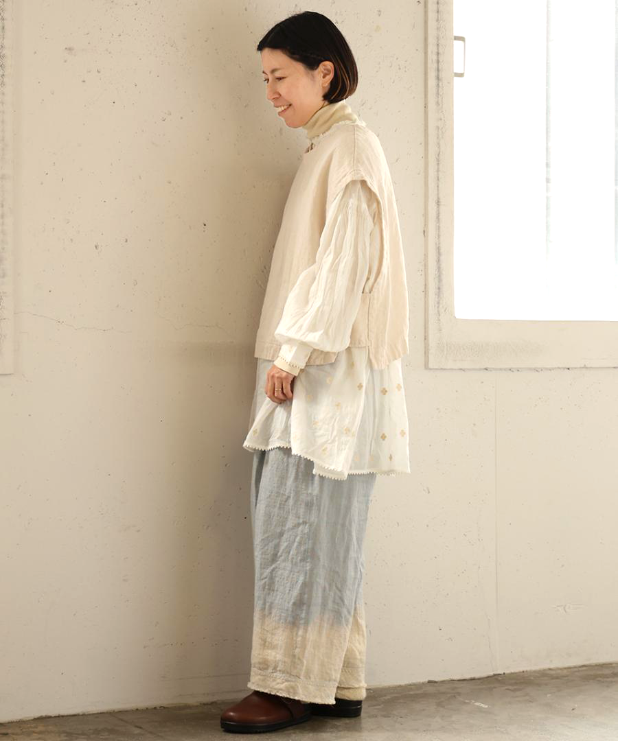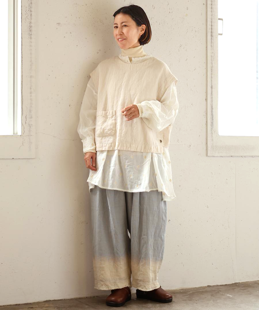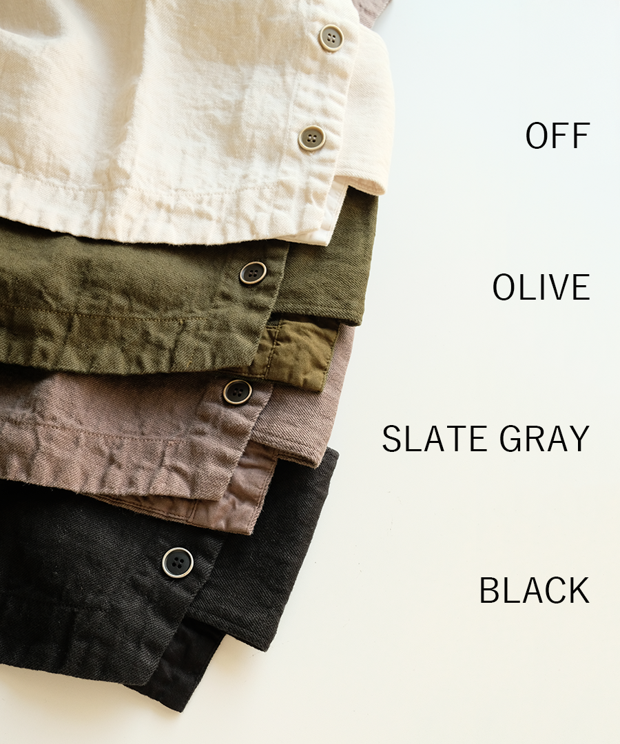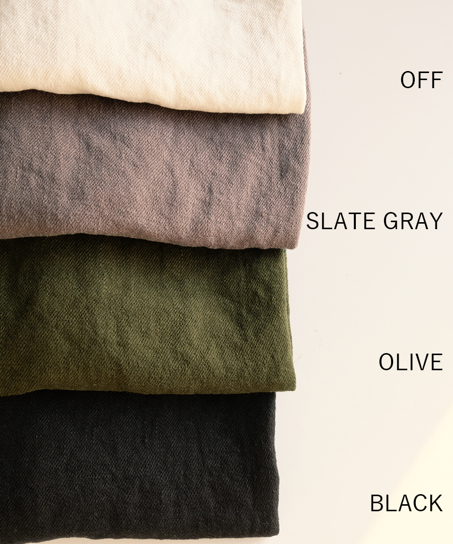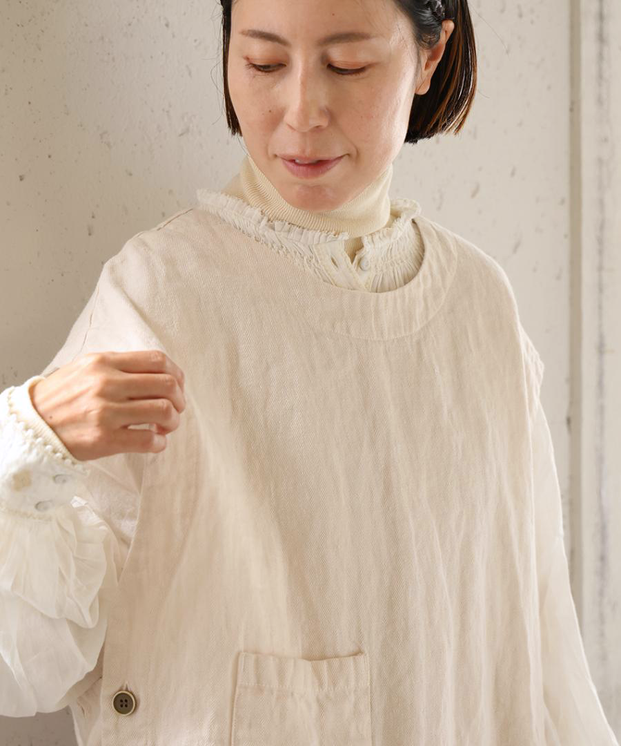 まだ寒さの残る梅春の時期にも対応できるような肉厚のリネンは季節の変わり目に大活躍。くったりと柔らかな風合いで重さは感じません。