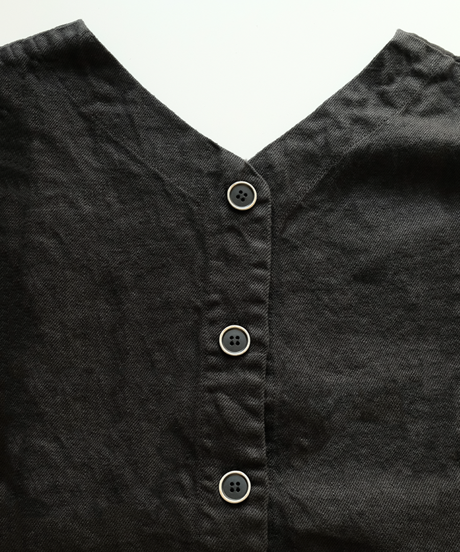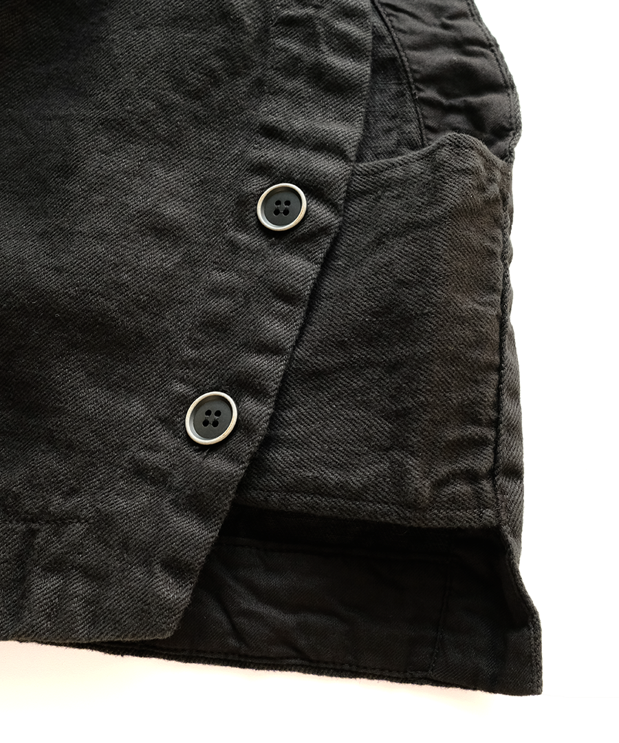 大きく開いたAH(脇周り)と体のラインを拾わないワイドな身幅で、リラックスした着心地が続きます。両サイドのマチとボタンが、シンプルなデザインに程よいアクセントに。前後着用可能でボタンを開けて羽織れるのも嬉しいポイントです。