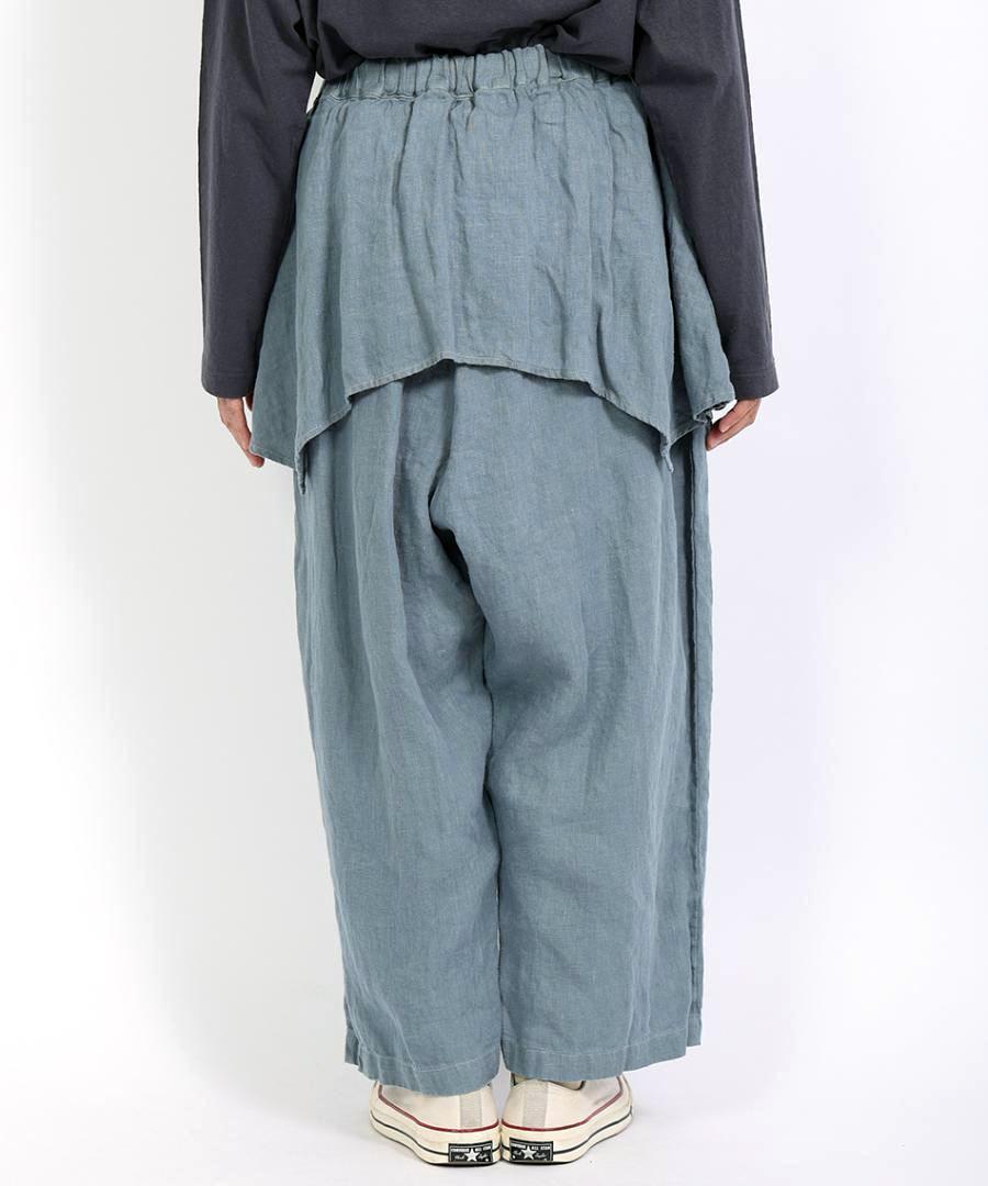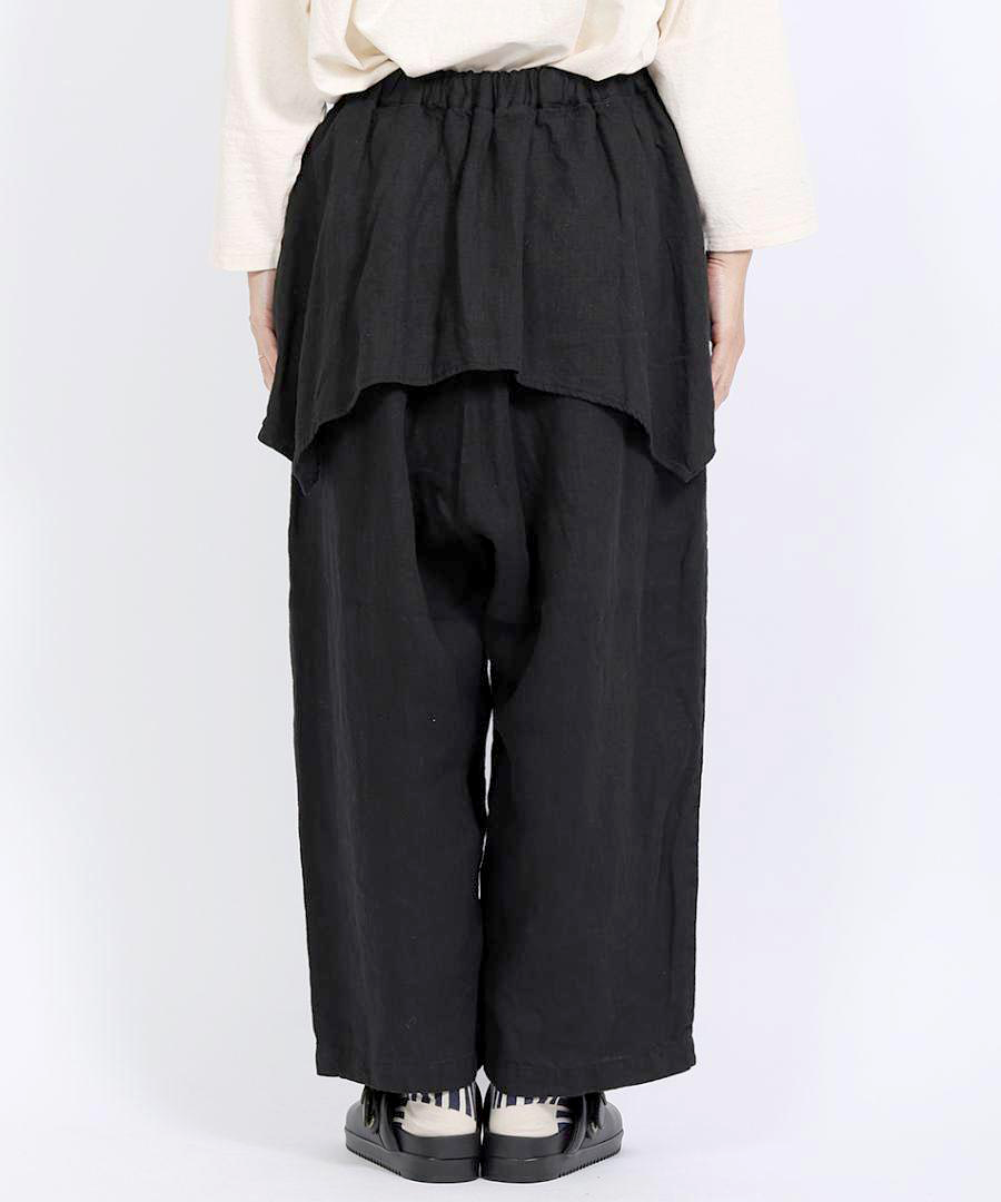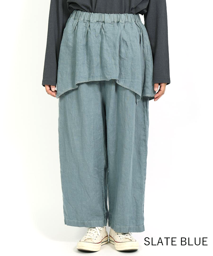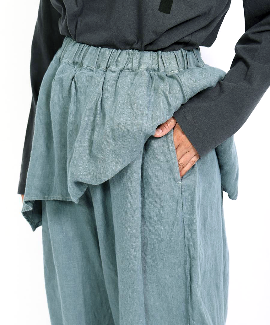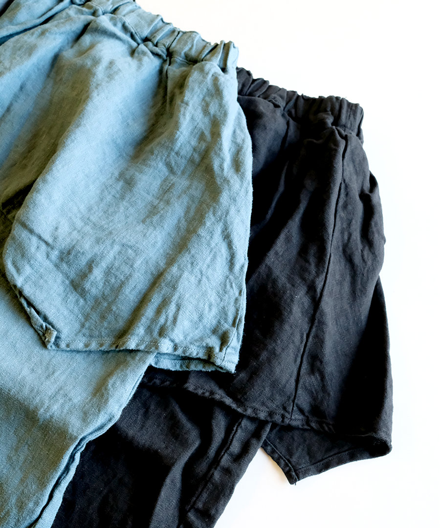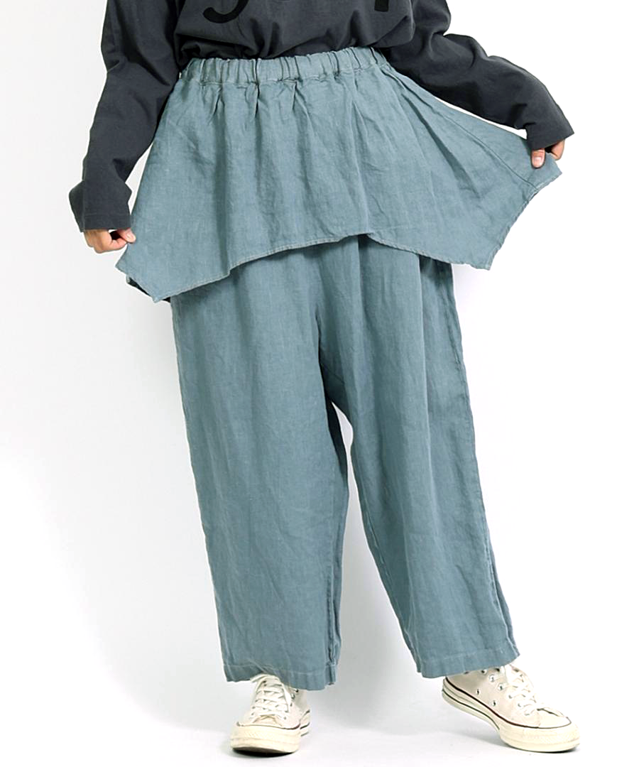 tumugu:定番の「ソリトリネン」シリーズより、遊び心たっぷりのペプラムパンツが登場しました。ウエスト周りに贅沢にあしらわれたペプラムデザインが、さりげなく腰回りをカバーしつつ、装いに独特のリズムを生み出します。