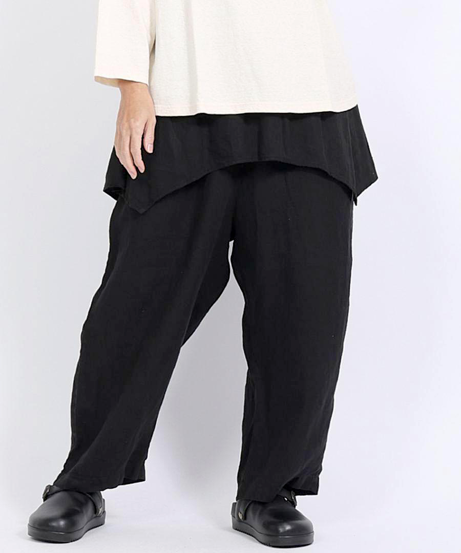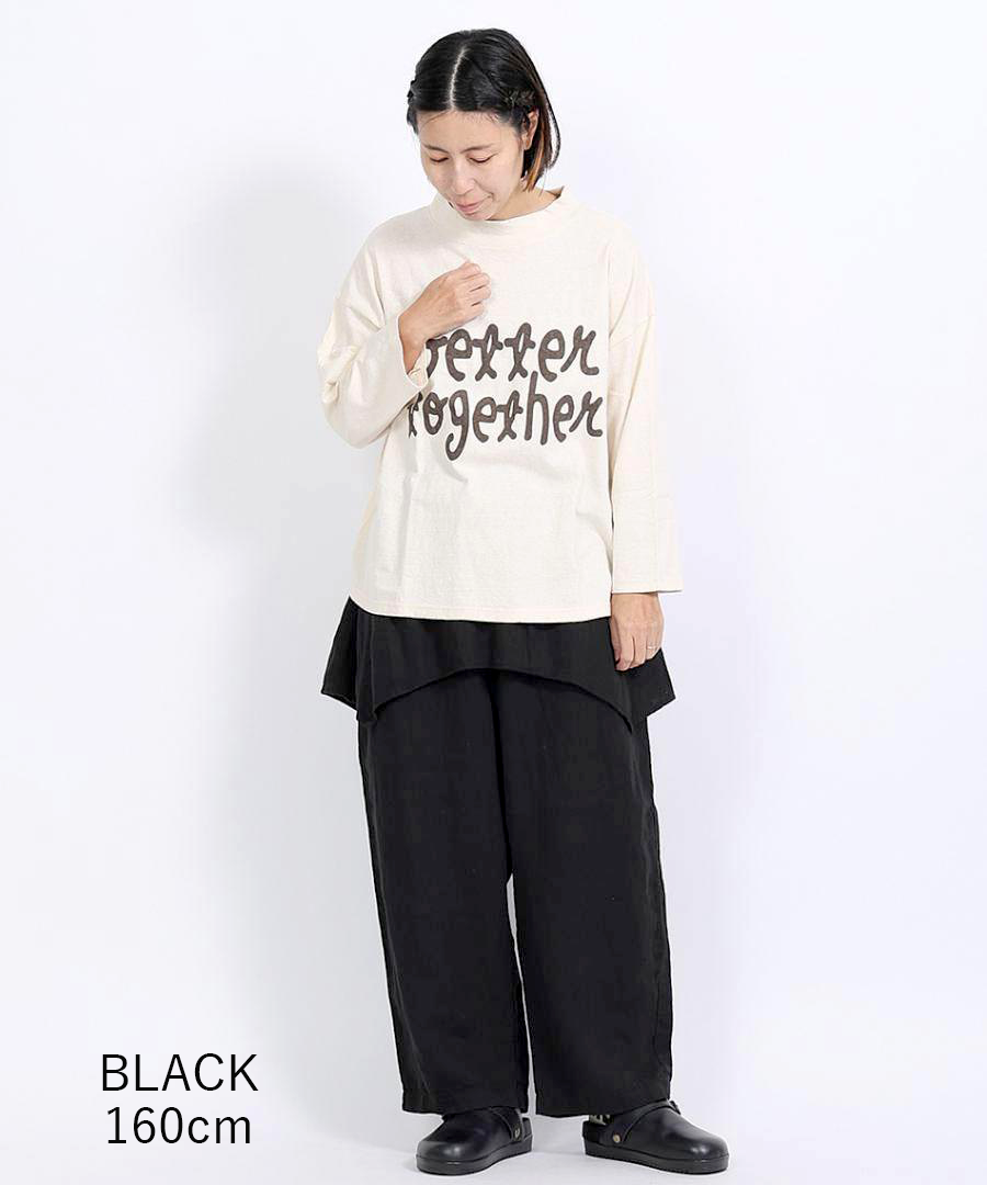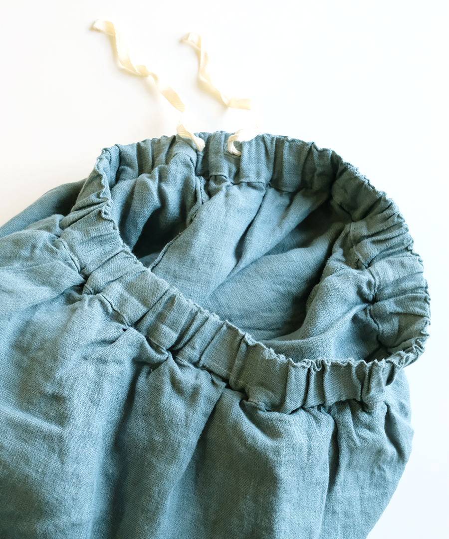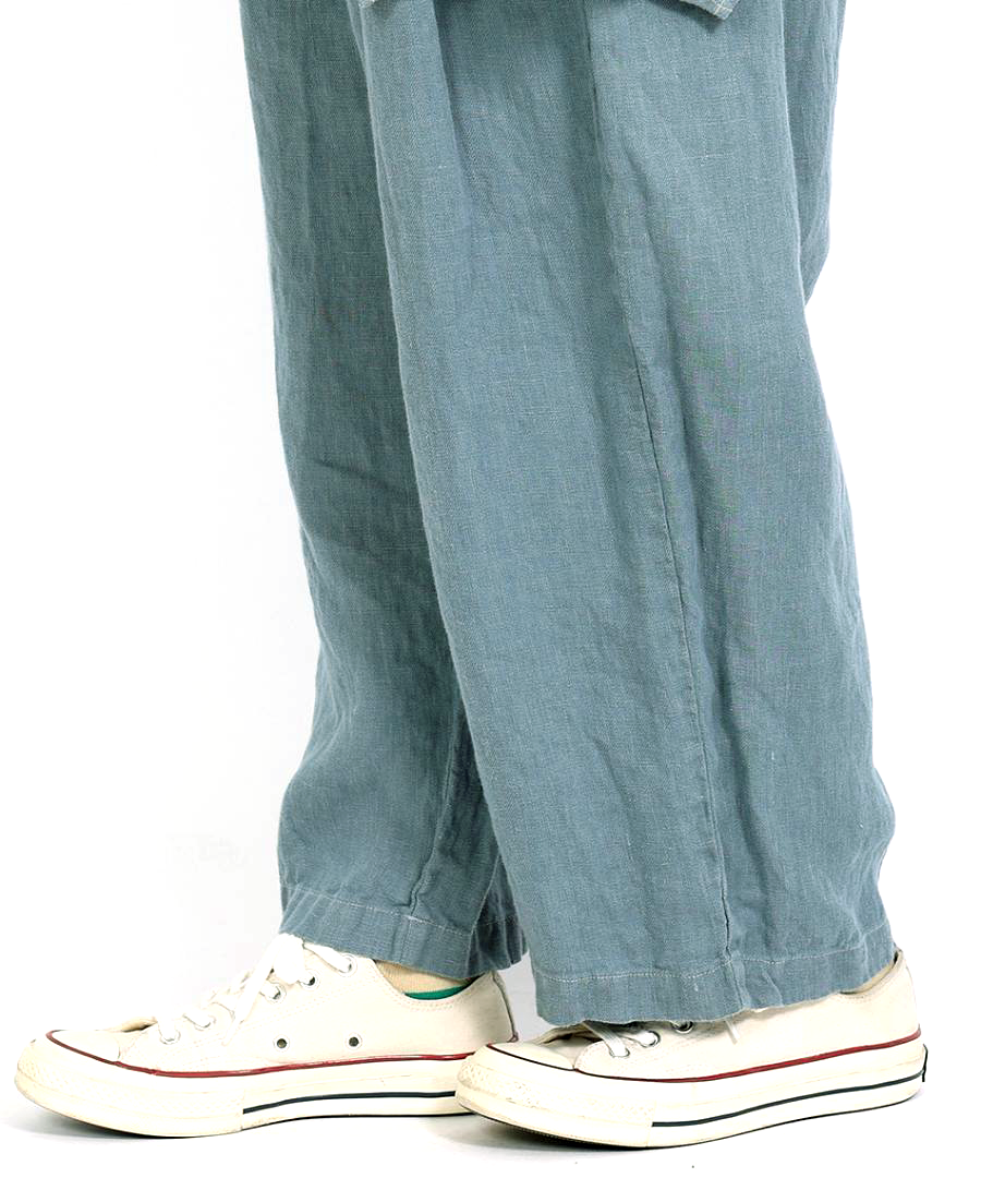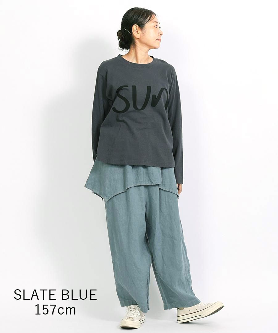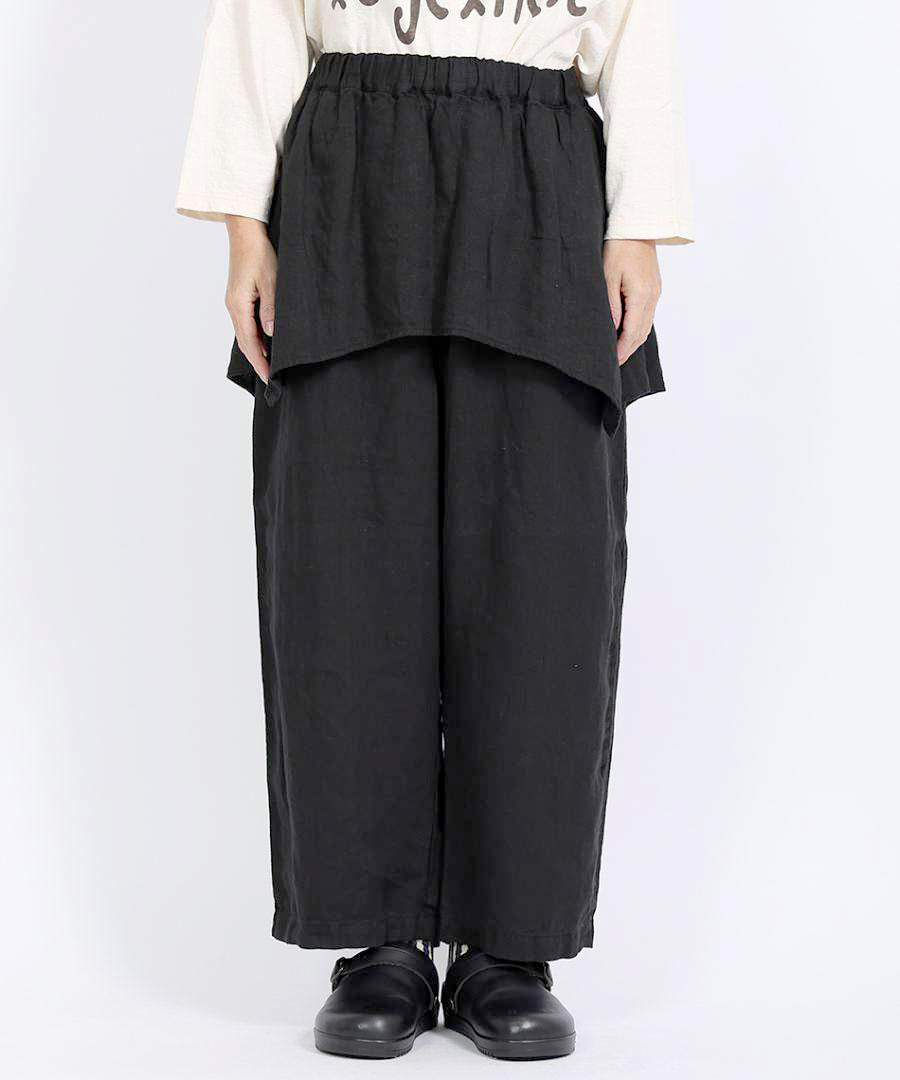 tumugu:定番の「ソリトリネン」シリーズより、遊び心たっぷりのペプラムパンツが登場しました。ウエスト周りに贅沢にあしらわれたペプラムデザインが、さりげなく腰回りをカバーしつつ、装いに独特のリズムを生み出します。