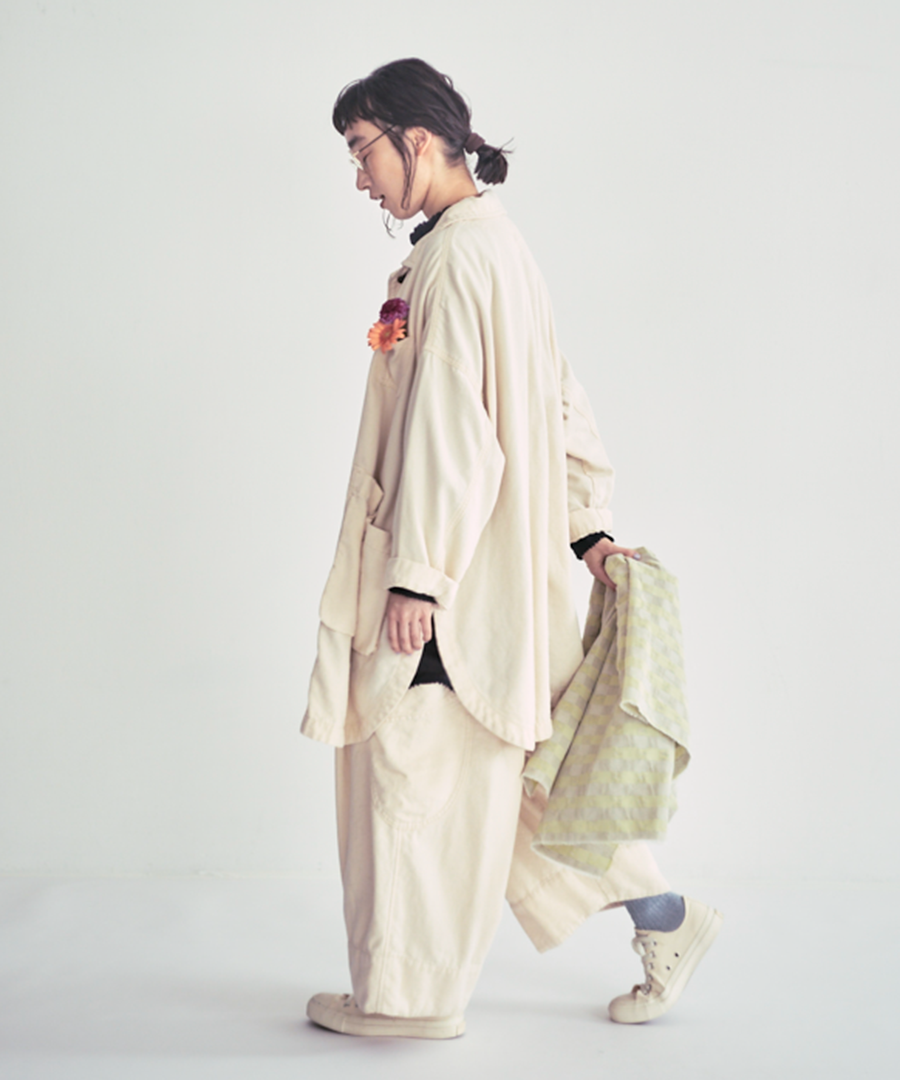ゆったりとした身幅とアームホールは、今の時期なら厚手のニットやインナーダウンを重ねても着膨れしません。