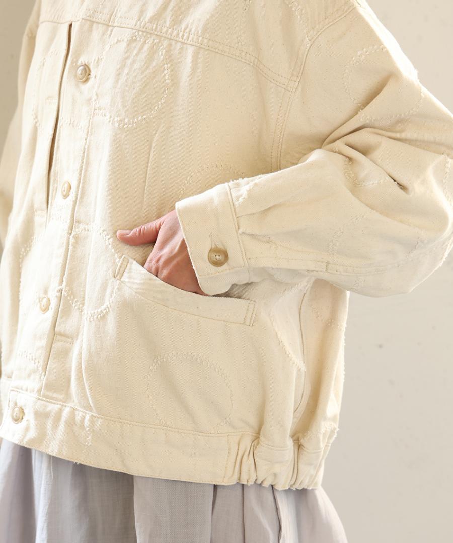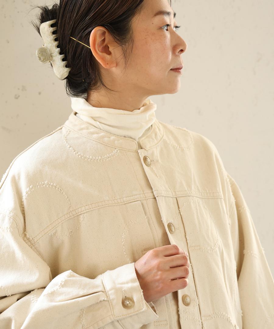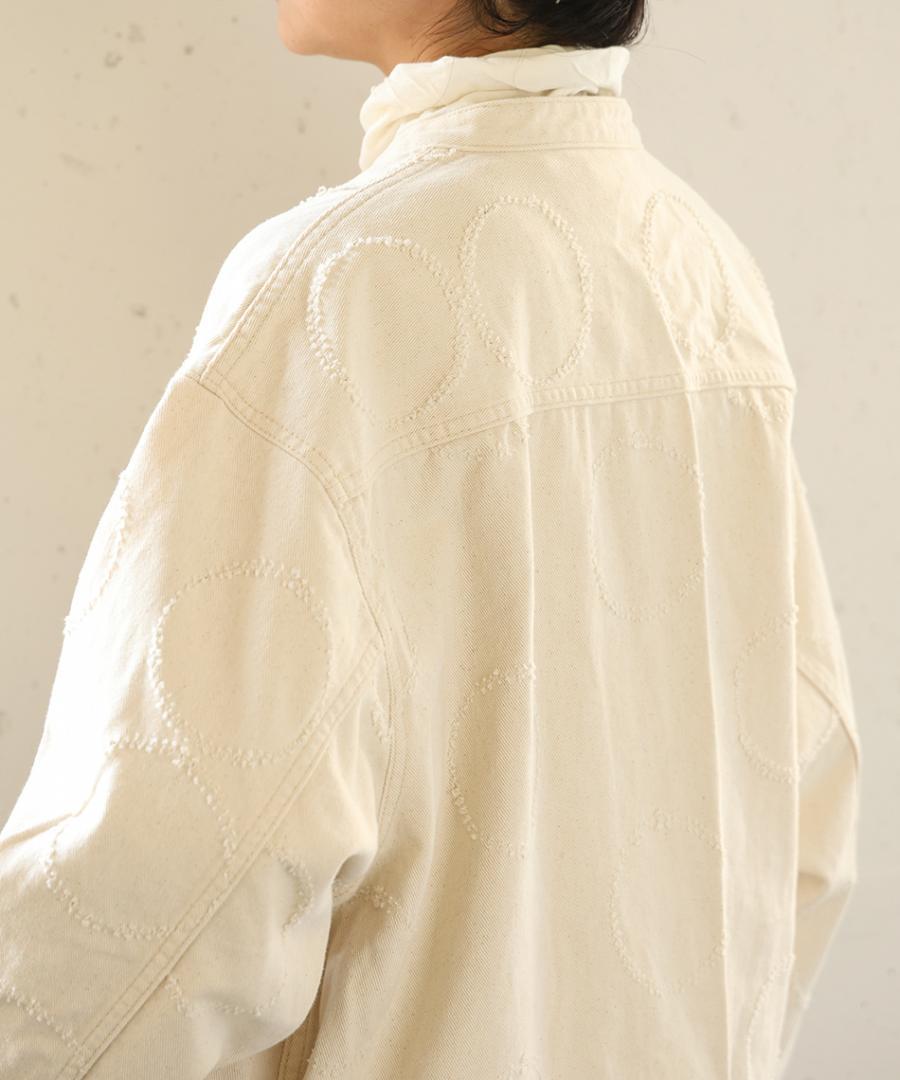 一見、立体的な刺繍のように見えるドット柄はオリジナルファブリック。