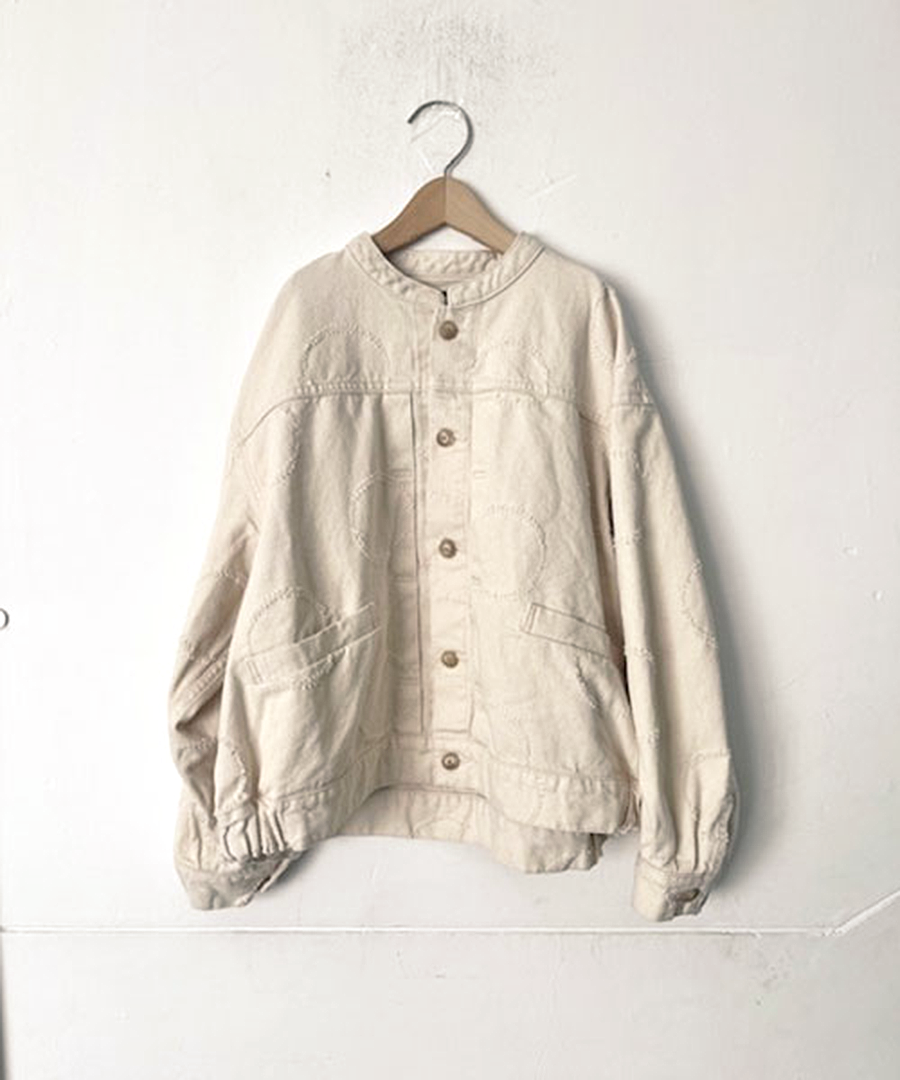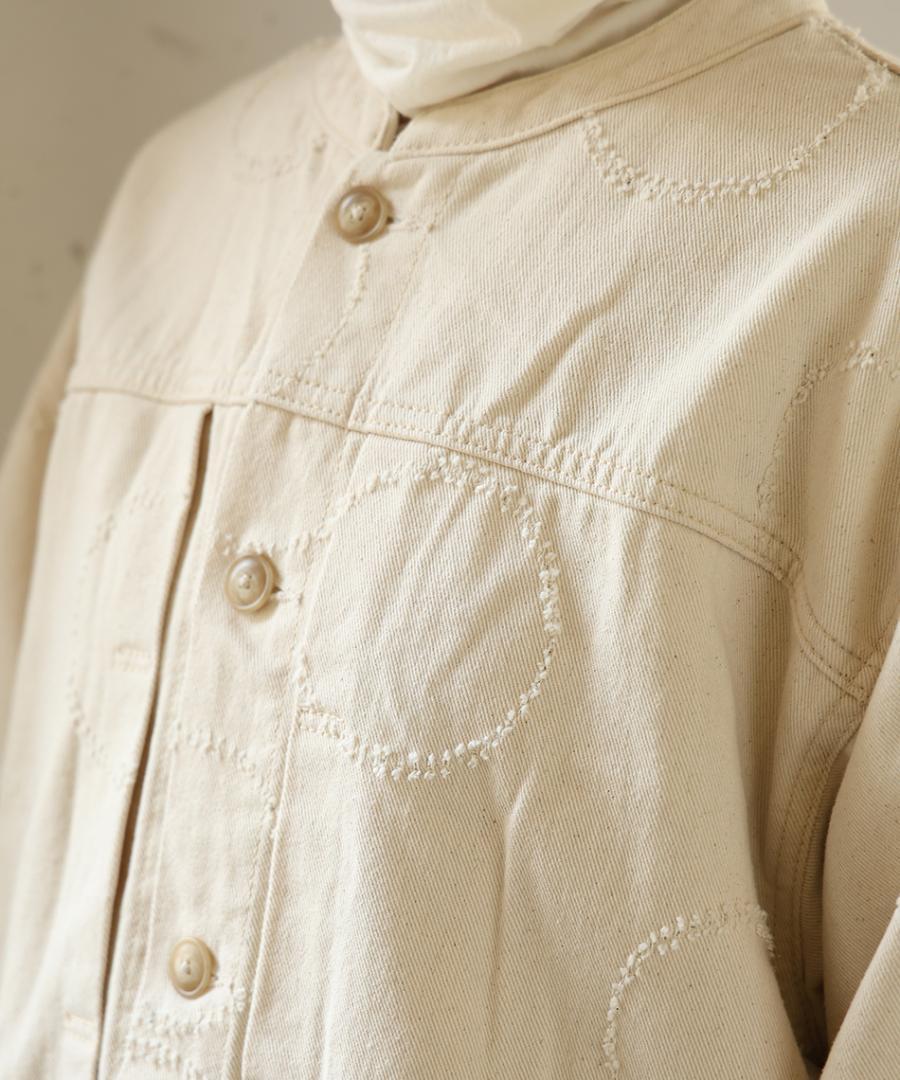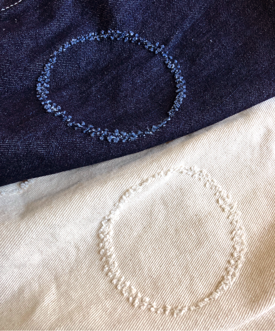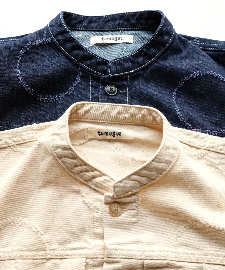一見、立体的な刺繍のように見えるドット柄はオリジナルファブリック。