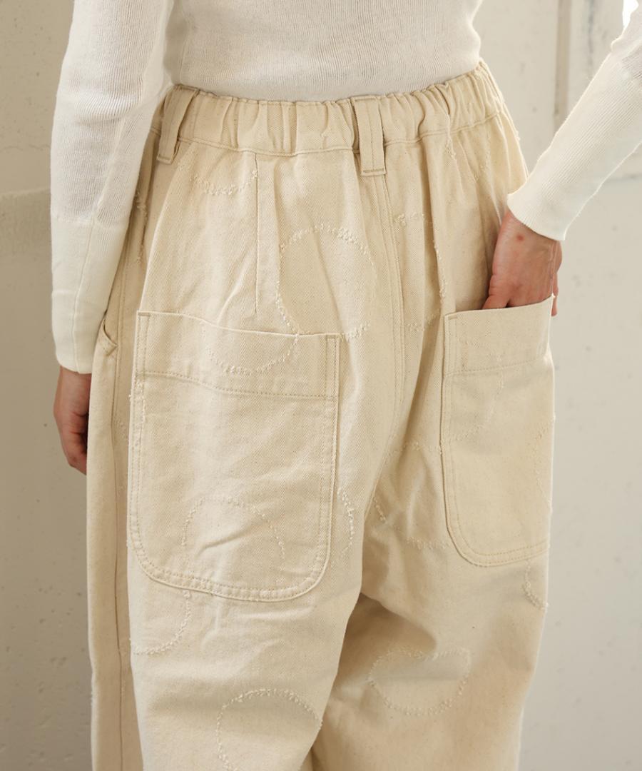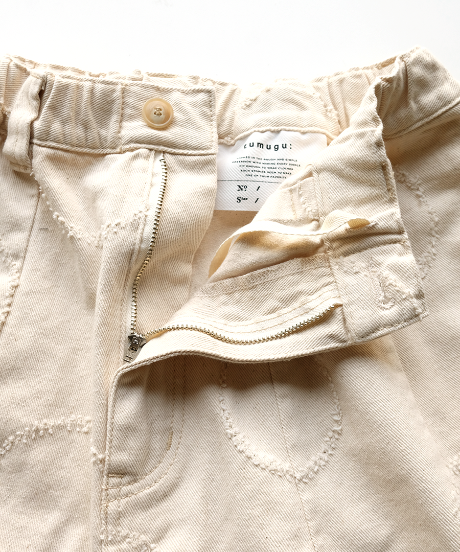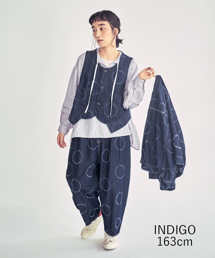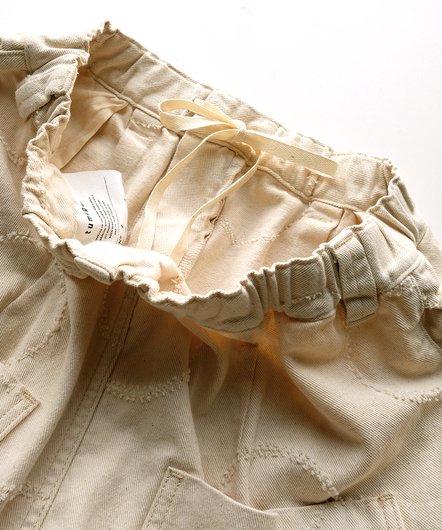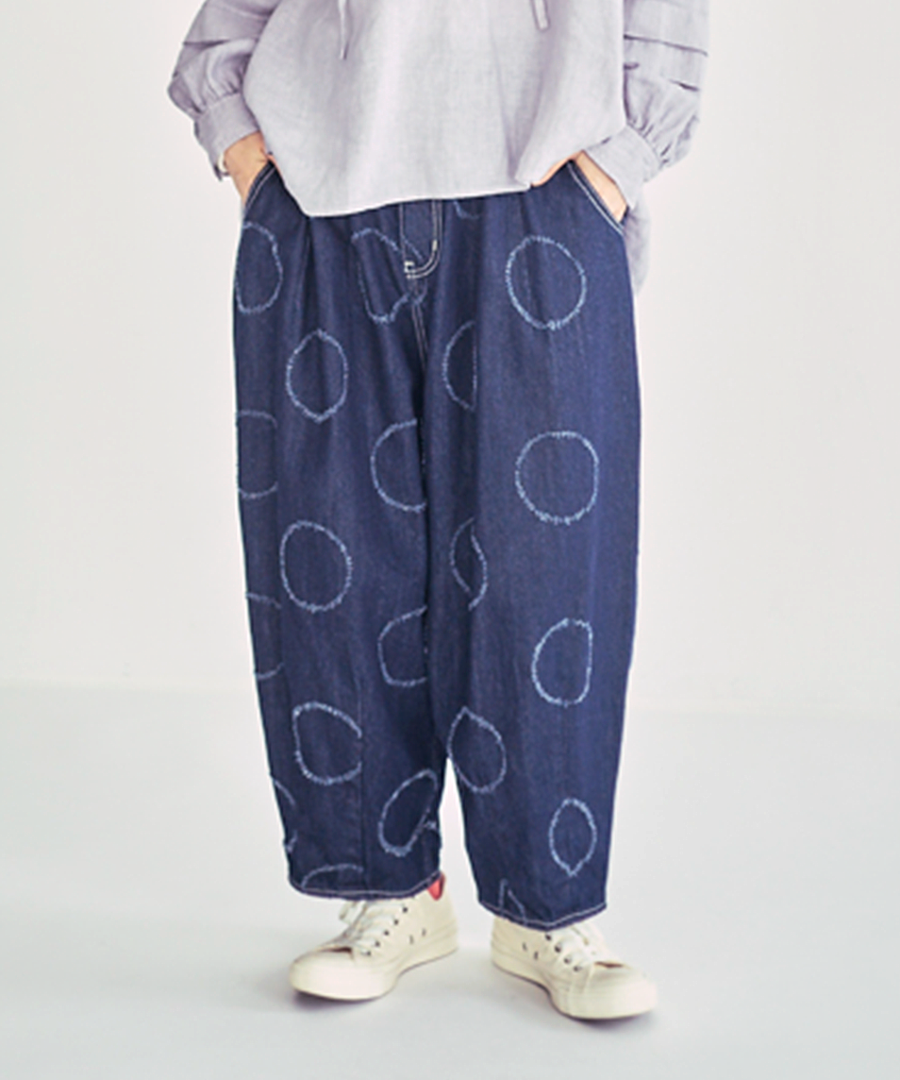 腰回りをゆったりカバーしつつ、裾に向かってゆるやかに細くなるコクーンテーパードシルエット。ウエストゴムで楽ちんながら、フロントファスナー仕様で本格的なデニムのルックス。内側の紐で微調整が可能なのも嬉しいポイント。