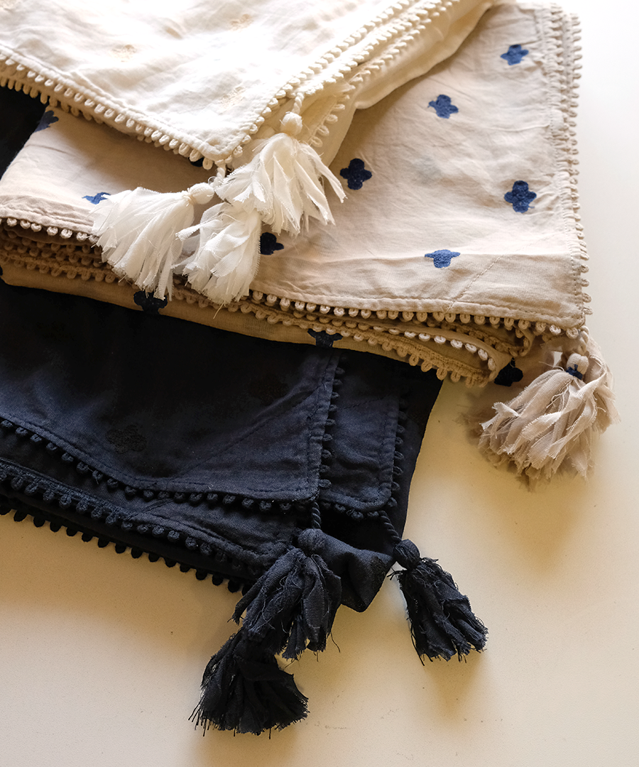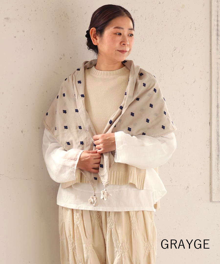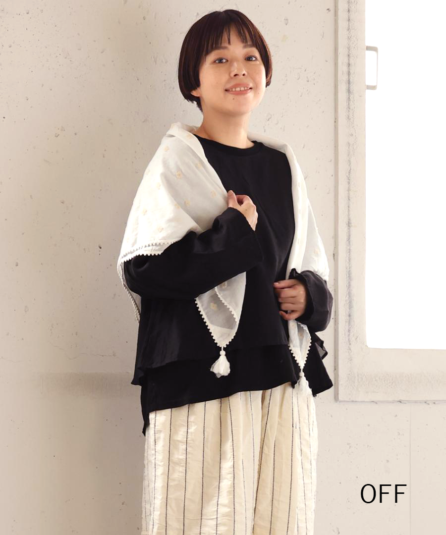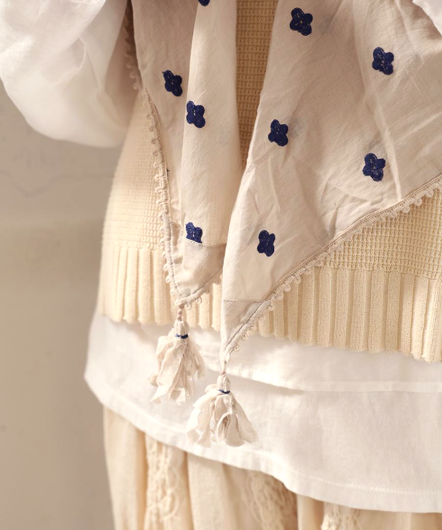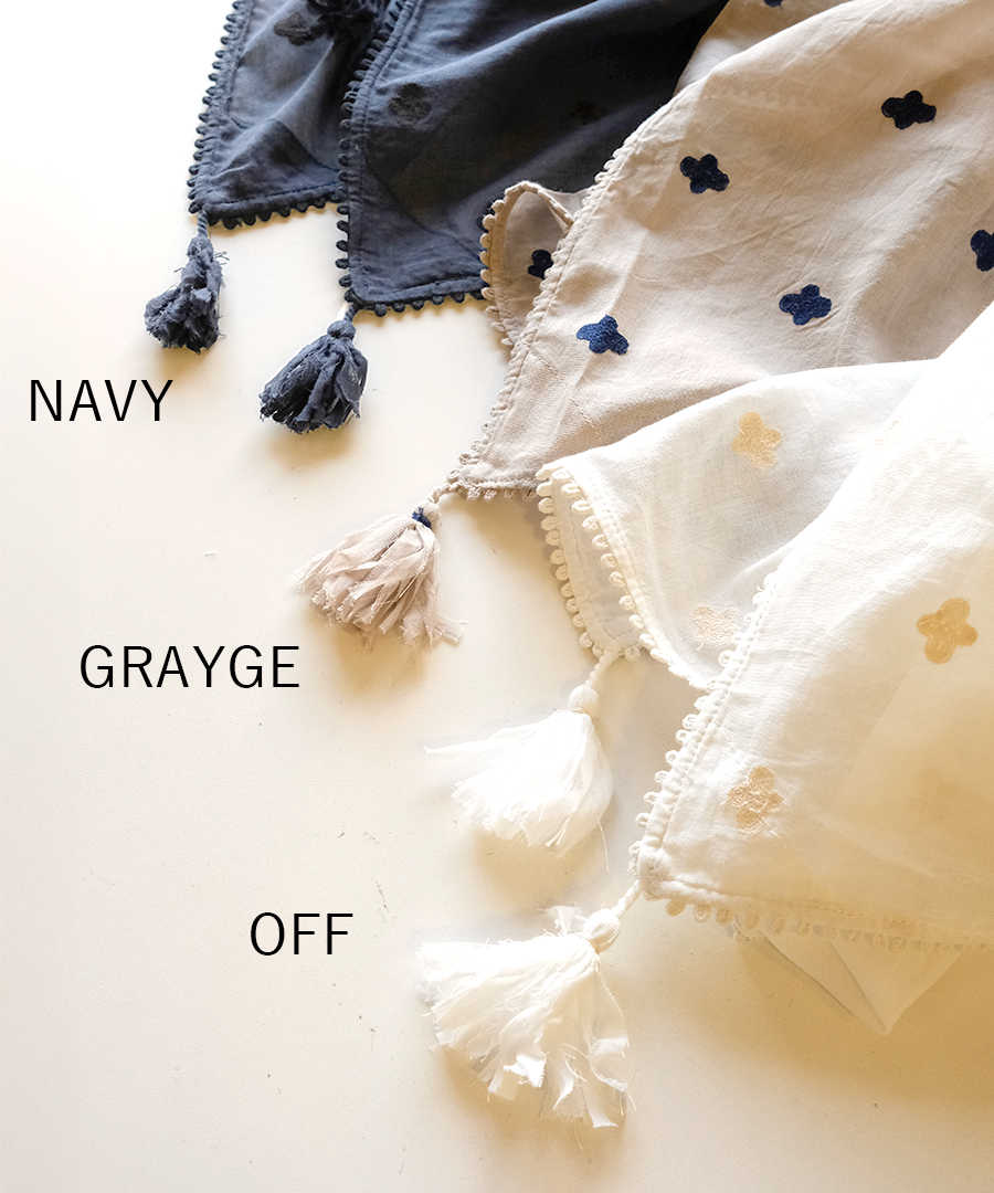 全体に散りばめられた、草花のようなミシン刺繍。繊細で柔らかなデザインが、華やかに見せてくれます。四隅のフリンジが遊び心をプラス。
