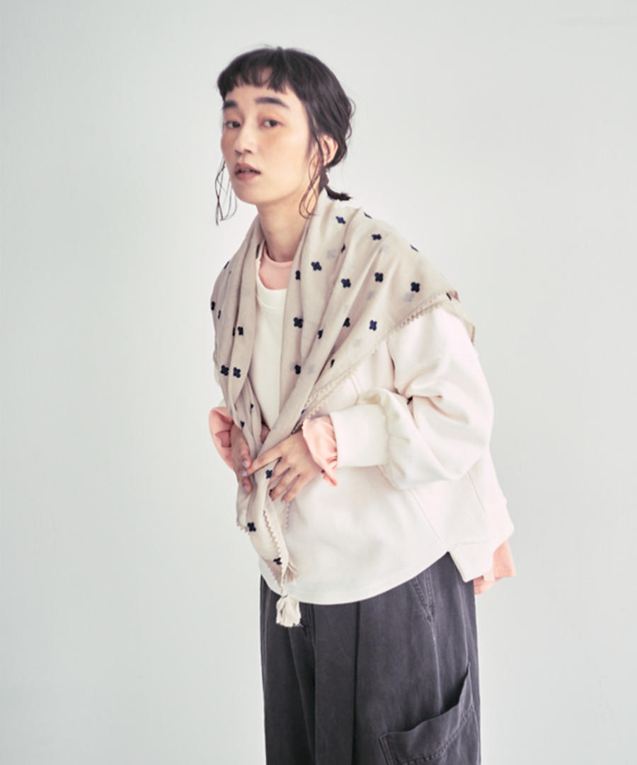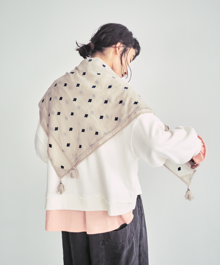 首元に巻くのはもちろん、三角に折って肩に羽織ったり、バンダナのように頭に巻いたり、腰に巻いたり。その日の気分に合わせた使い方が楽しめます。