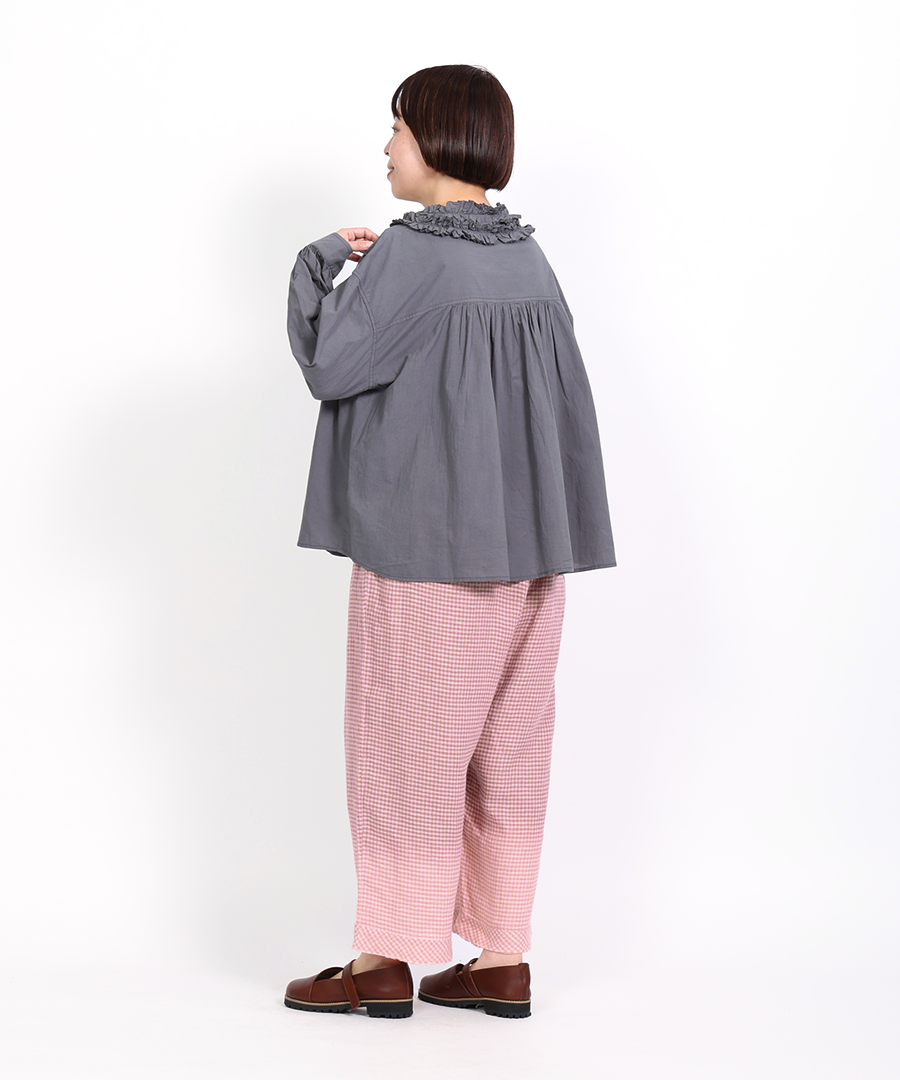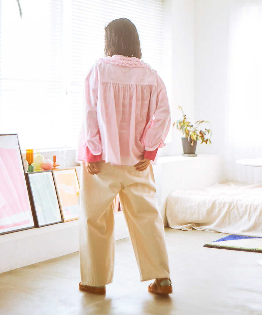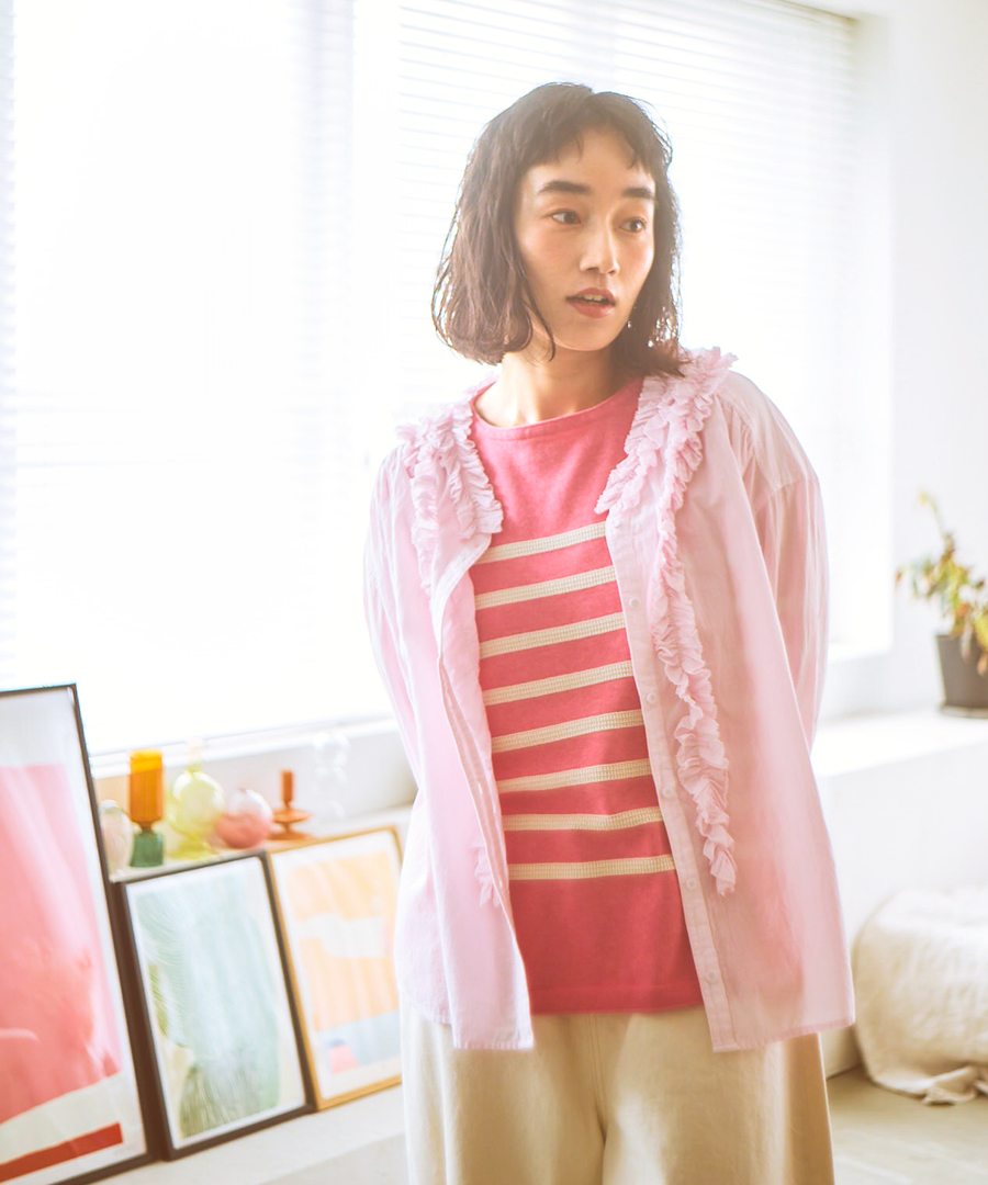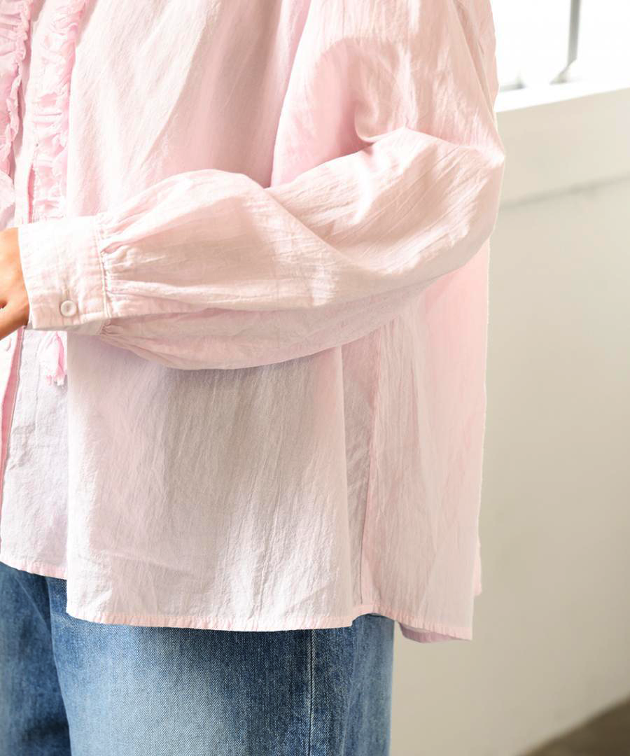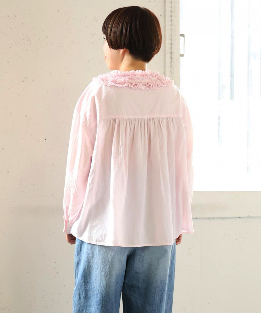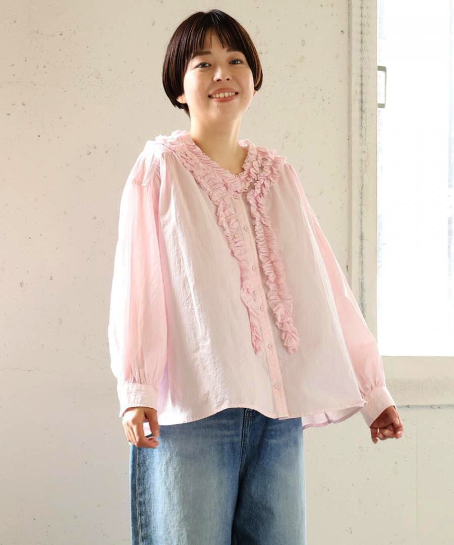 ゆったりとした身幅ながら、驚くほど軽い着心地。一枚で着るのはもちろん、サロペットやニットのインナーとして襟元のフリルを覗かせるレイヤードスタイルもおすすめです。甘めのブラウスにあえてワークパンツやデニムを合わせる、大人のミックススタイルを楽しんで。