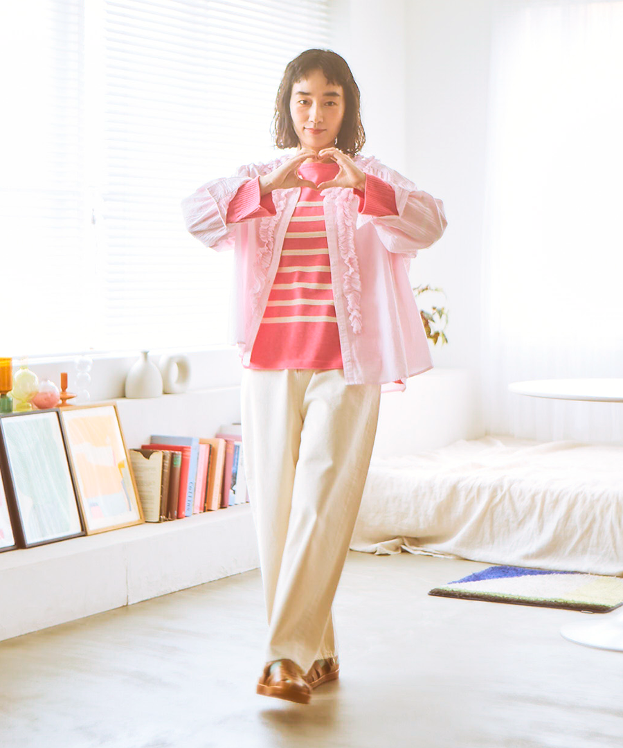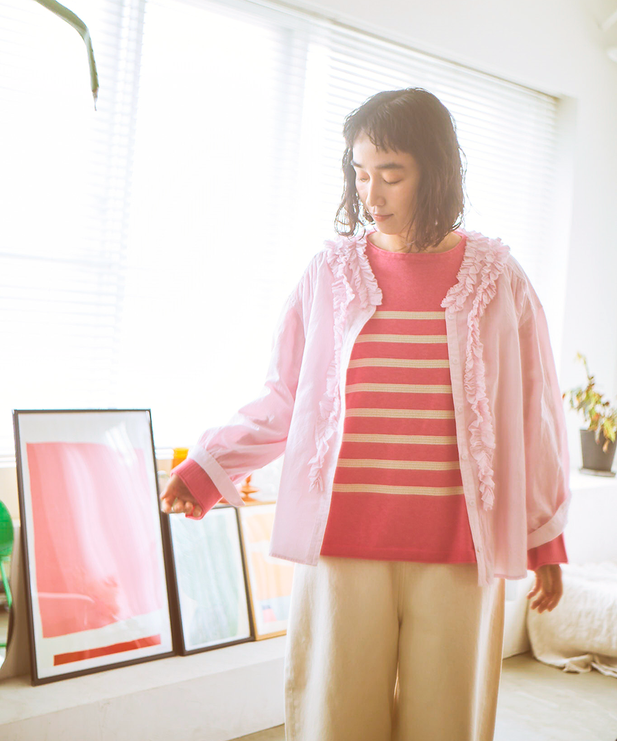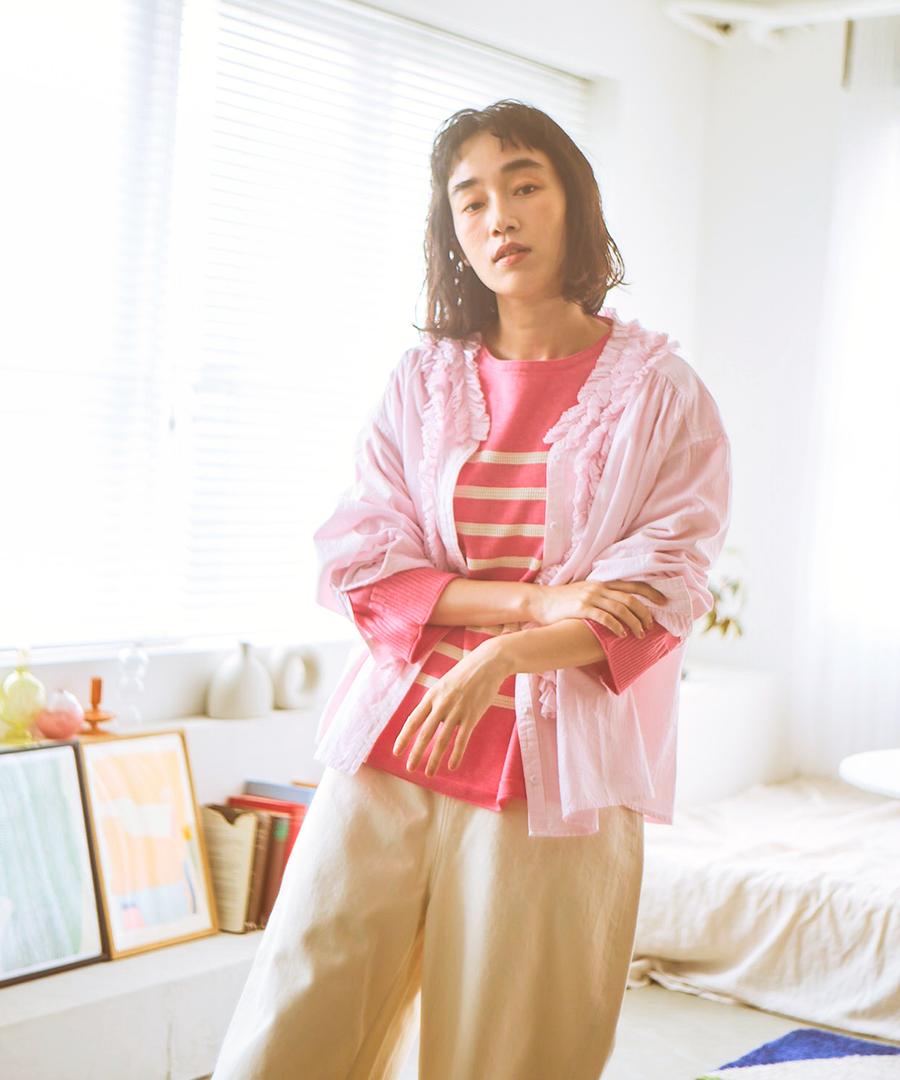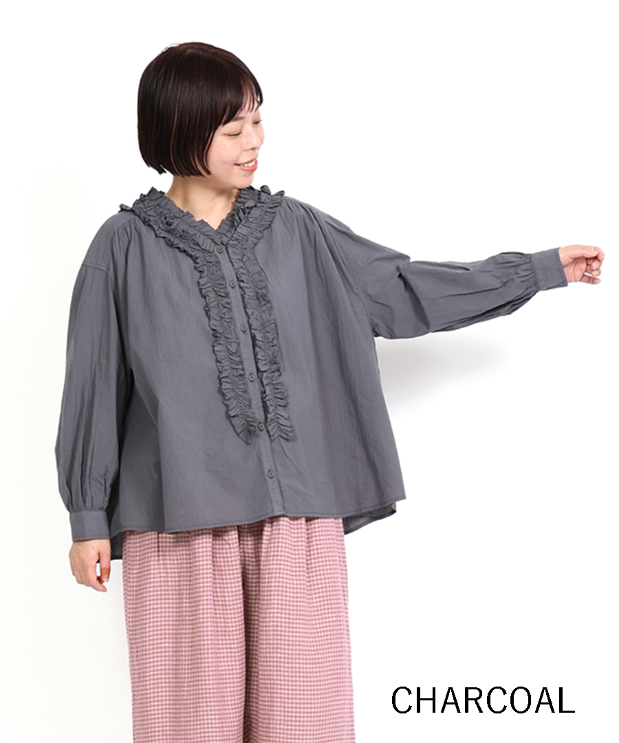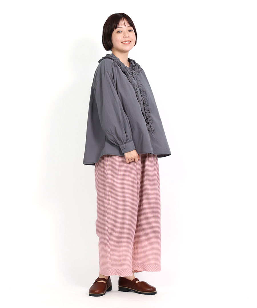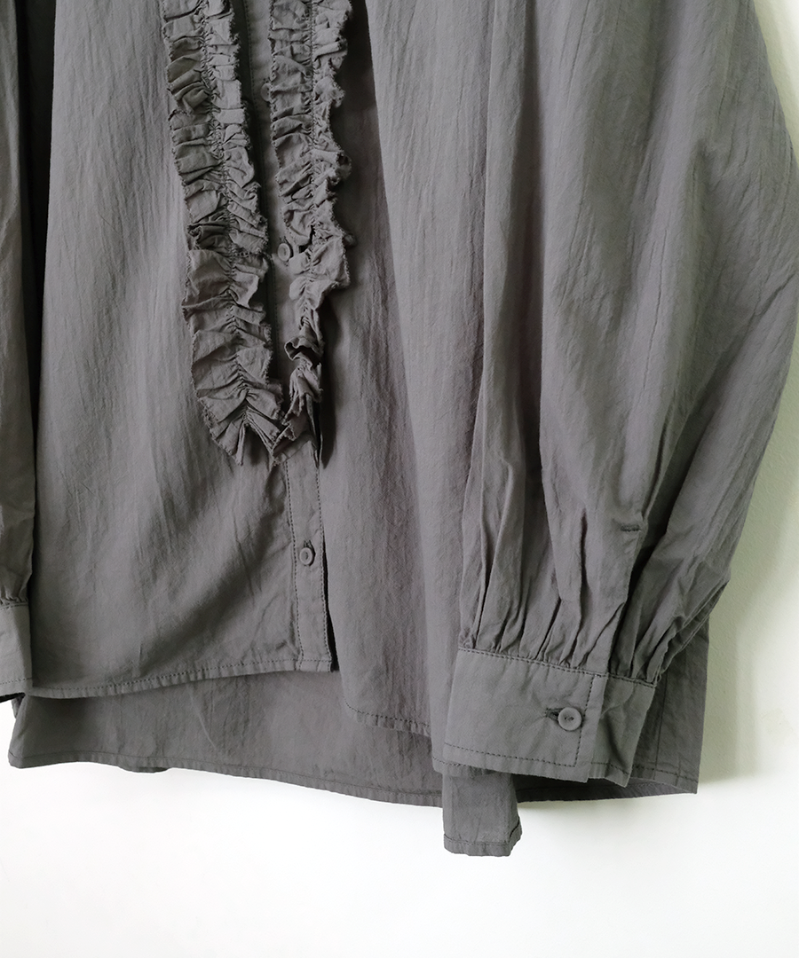 ゆったりとした身幅ながら、驚くほど軽い着心地。一枚で着るのはもちろん、サロペットやニットのインナーとして襟元のフリルを覗かせるレイヤードスタイルもおすすめです。甘めのブラウスにあえてワークパンツやデニムを合わせる、大人のミックススタイルを楽しんで。