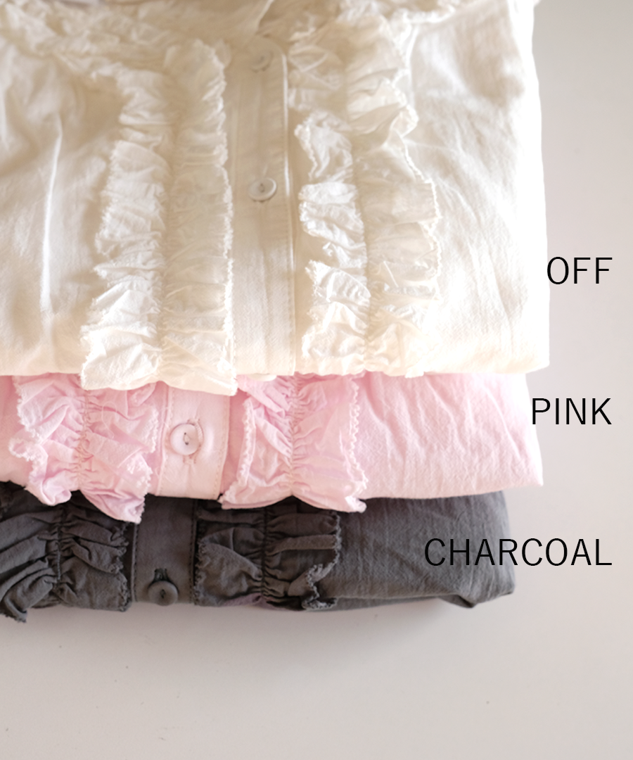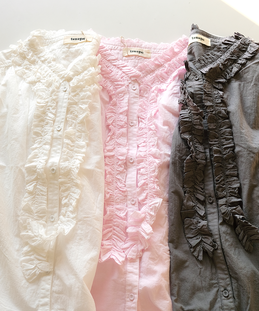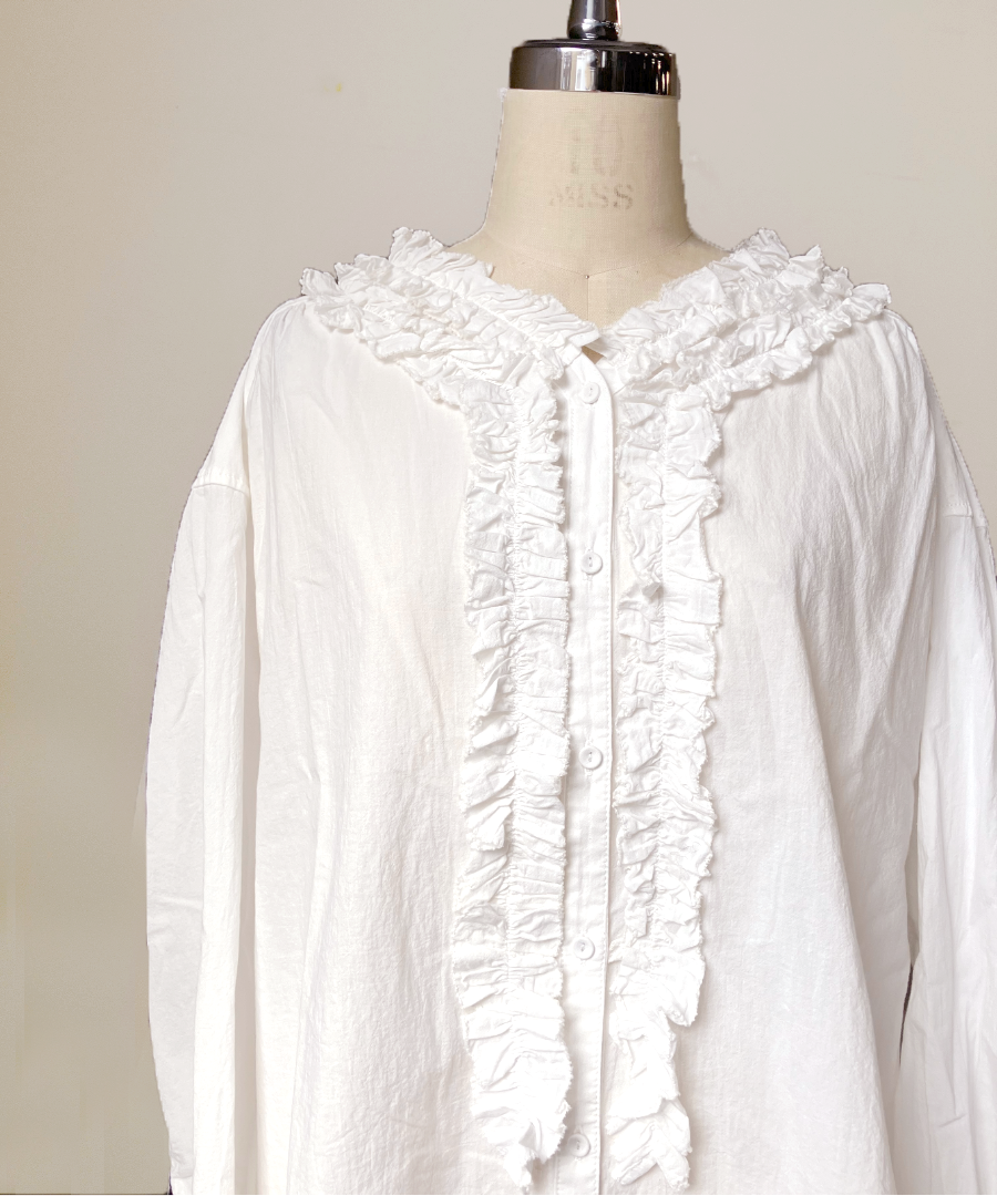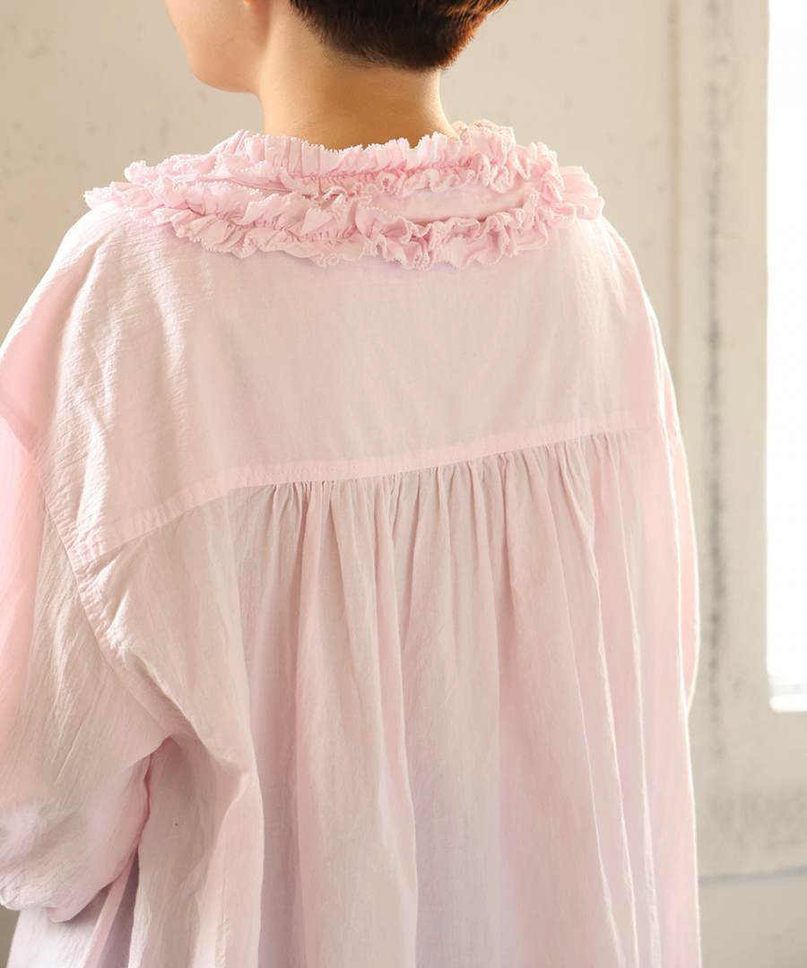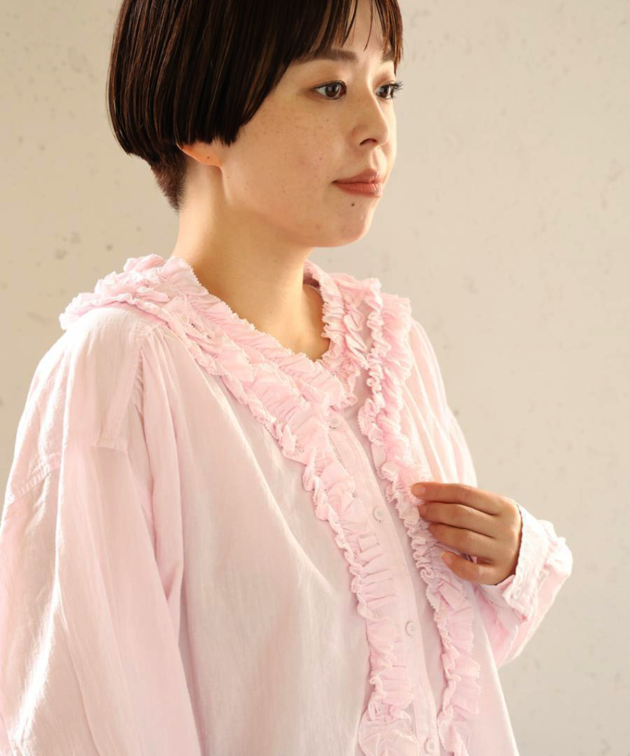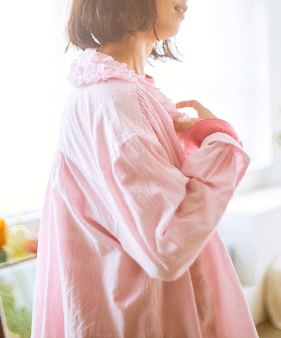 襟元にたっぷりと寄せられたフリルが、お顔周りを華やかに演出。ふわふわコットンの柔らかなシワ感でナチュラルな雰囲気に落とし込んでいます。