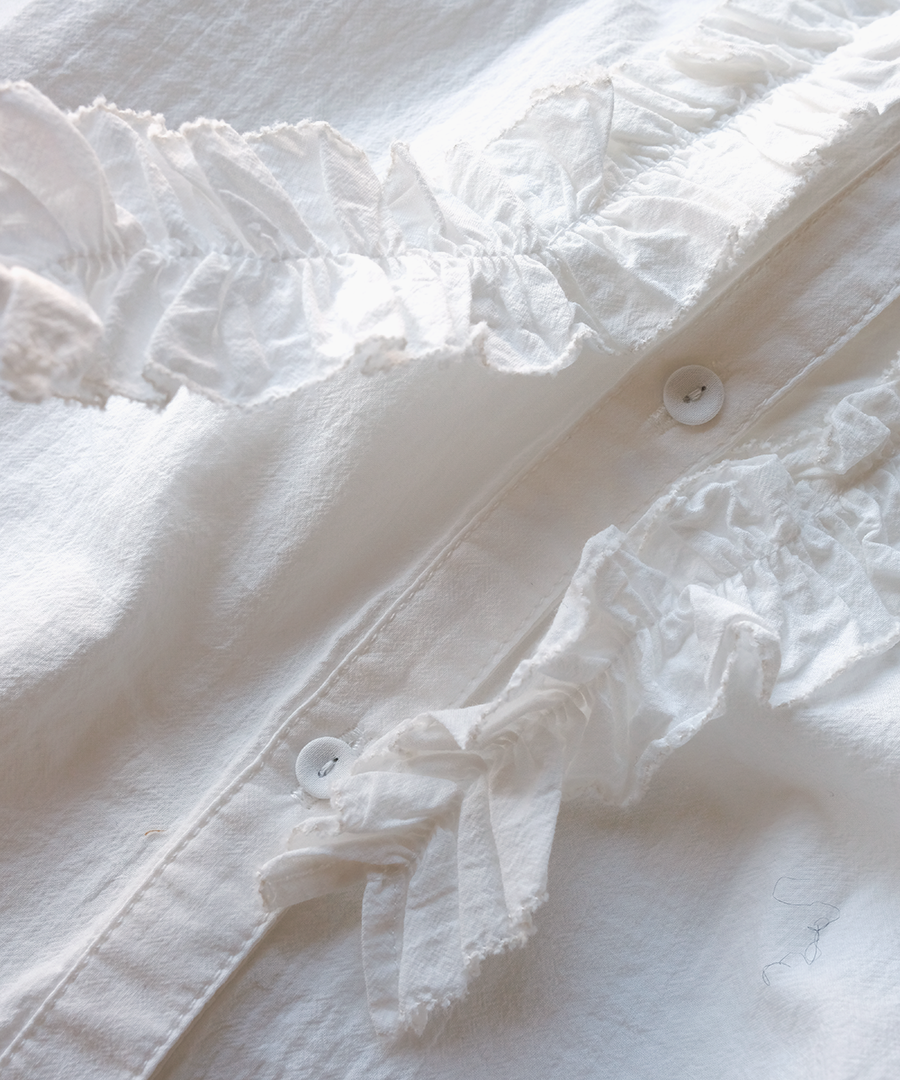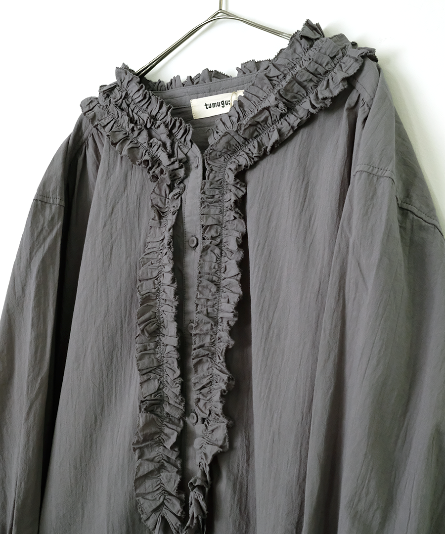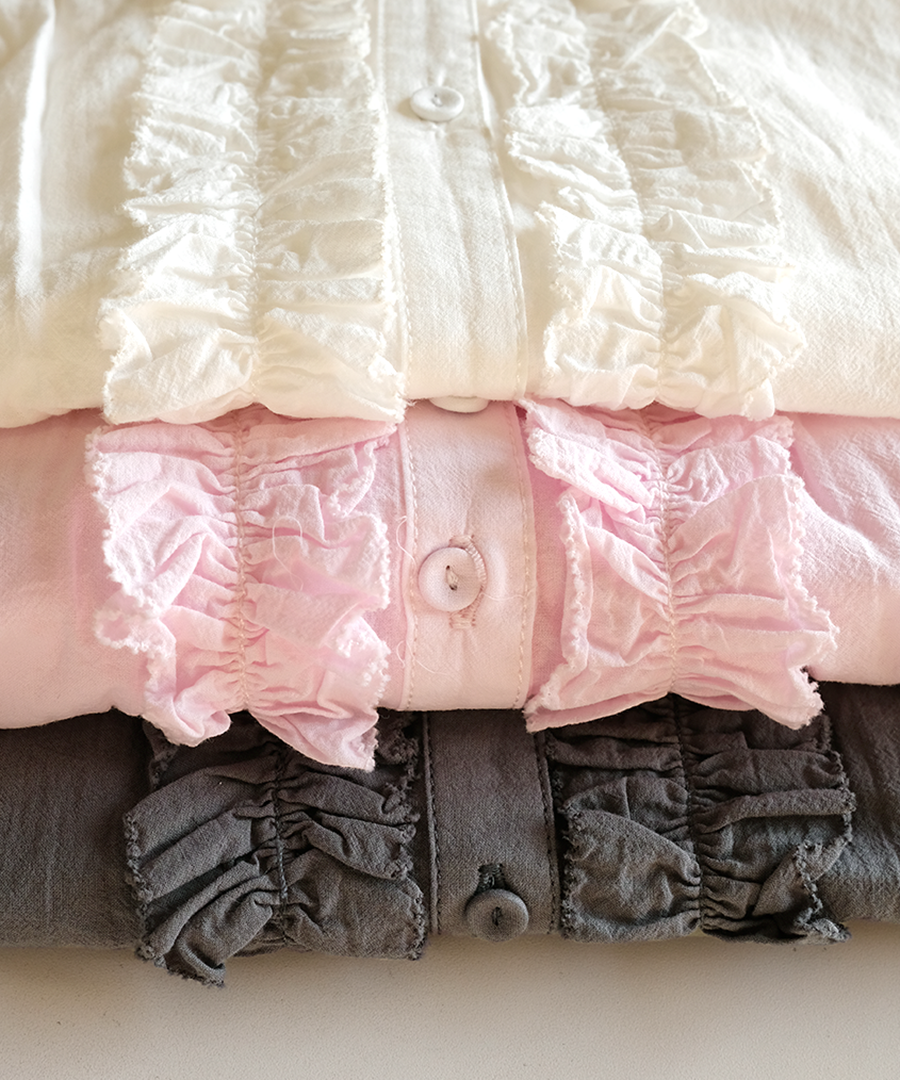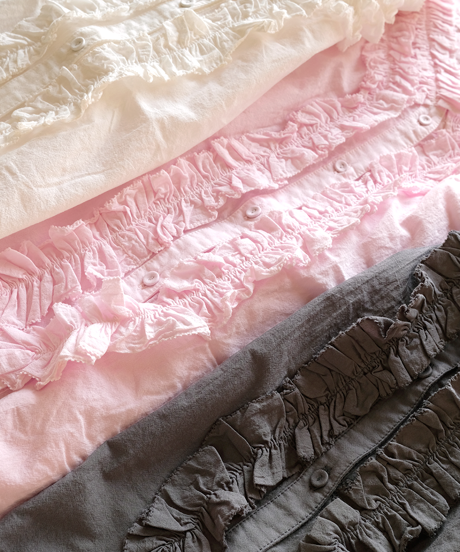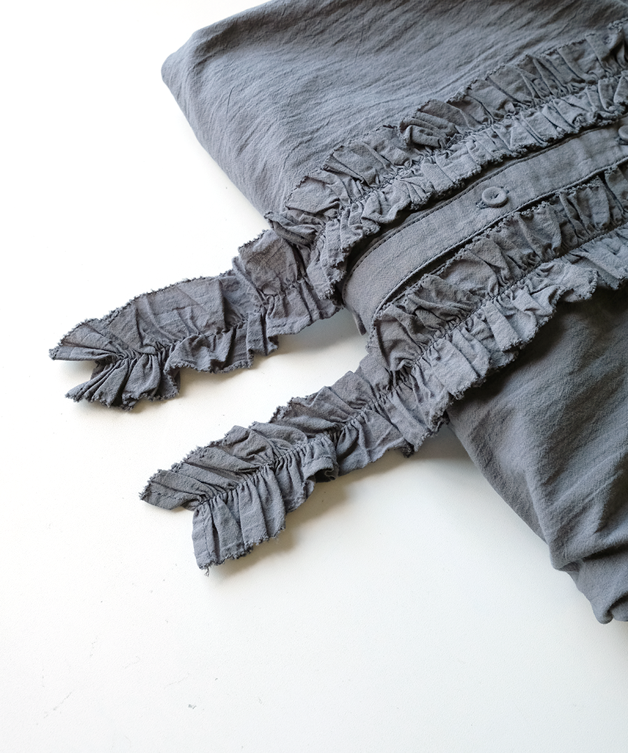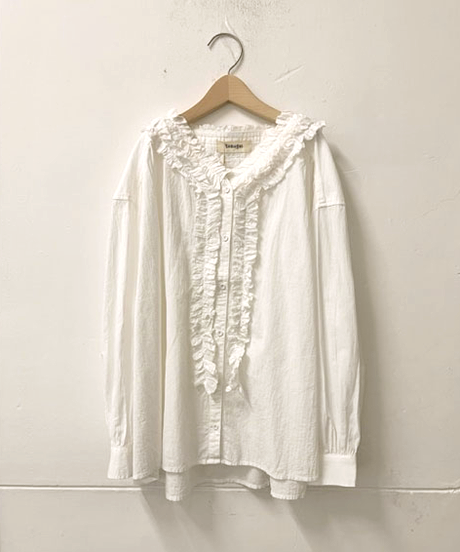 襟元にたっぷりと寄せられたフリルが、お顔周りを華やかに演出。ふわふわコットンの柔らかなシワ感でナチュラルな雰囲気に落とし込んでいます。