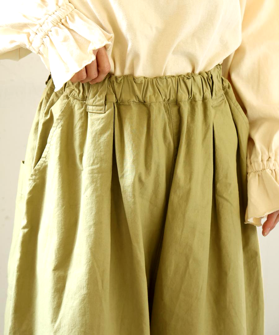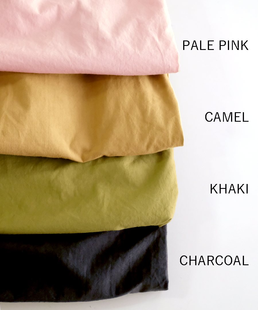 カジュアルなワーク感のあるツイル生地に製品染めならではのニュアンスカラーが、装いにやさしい表情を添えてくれます。
