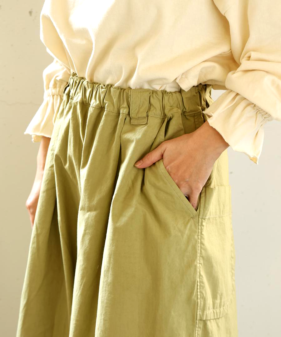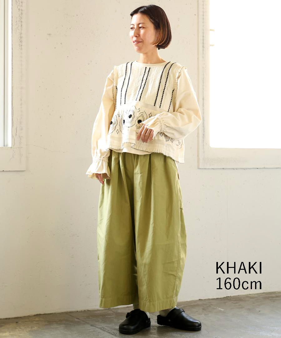 ウェストは総ゴム仕様(内側に調整紐付き)で締め付け感のないリラックスした穿き心地。股上が深く、ワイドなフォルムで裾に向かってストンと落ちるシルエット。気になる部分を自然にカバーしながらきれいに見せてくれます。