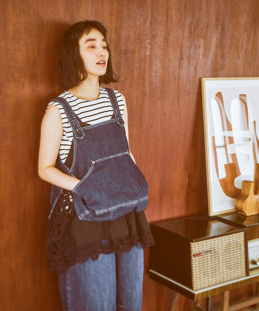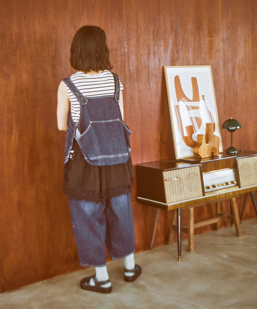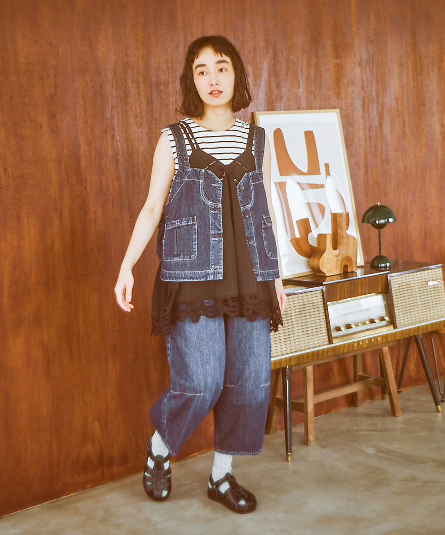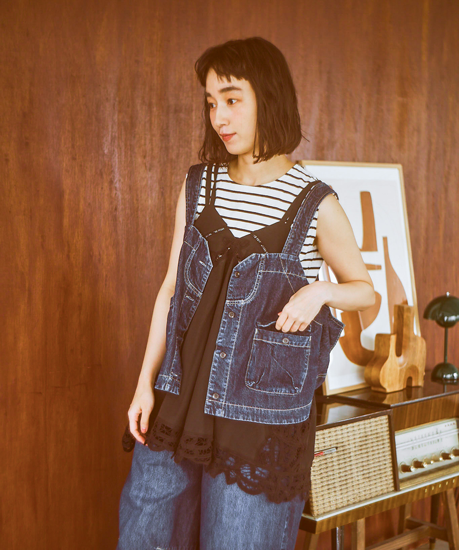 こすり加工を施すことで肌なじみがよく、ヴィンテージ感のある仕上がりになっています。コンパクトな丈感なので、ワンピースやカットソーに重ねるだけで、まるでビスチェを合わせているような旬のレイヤードスタイルが完成します。