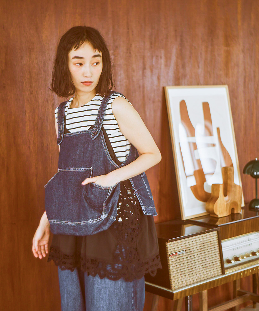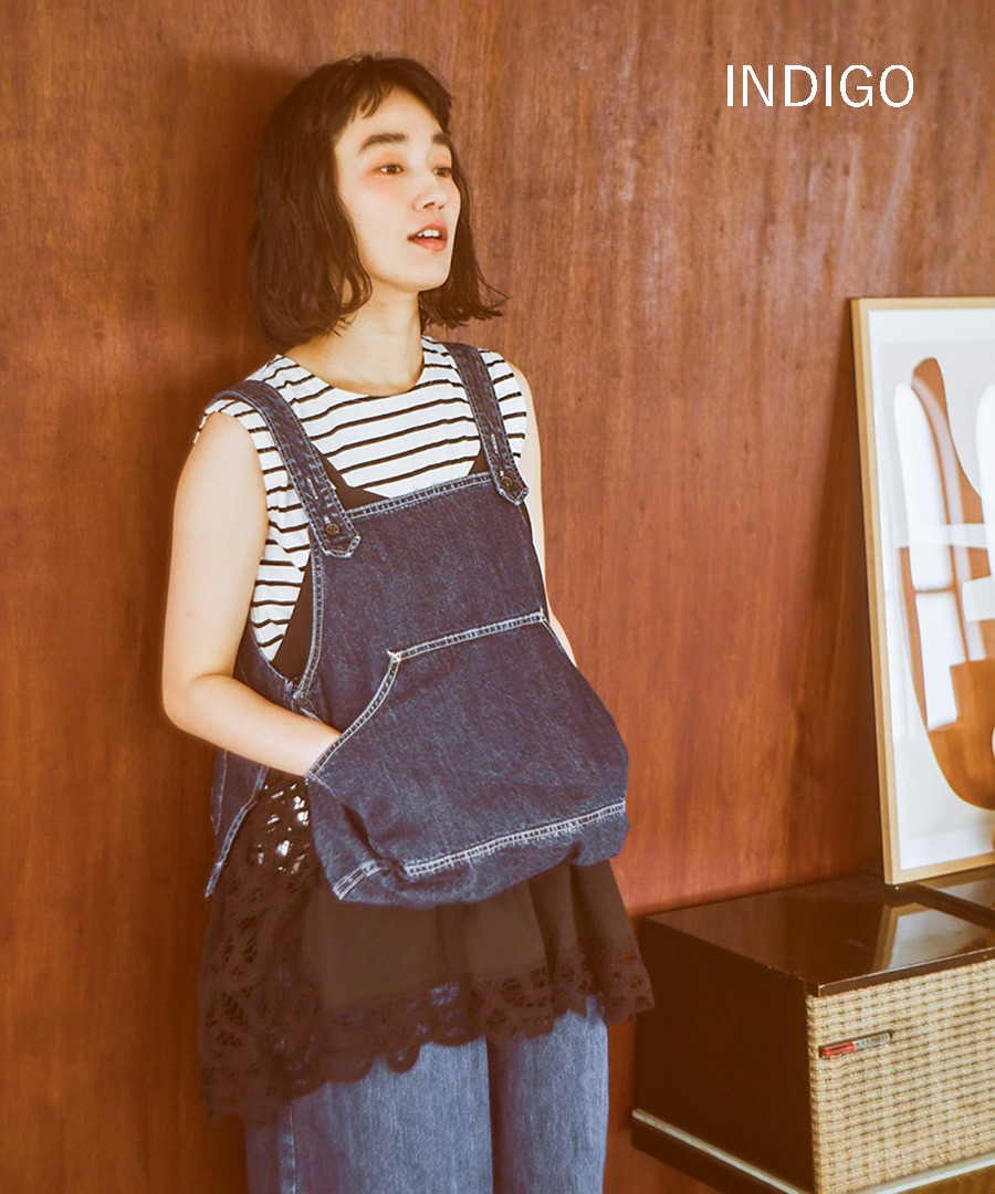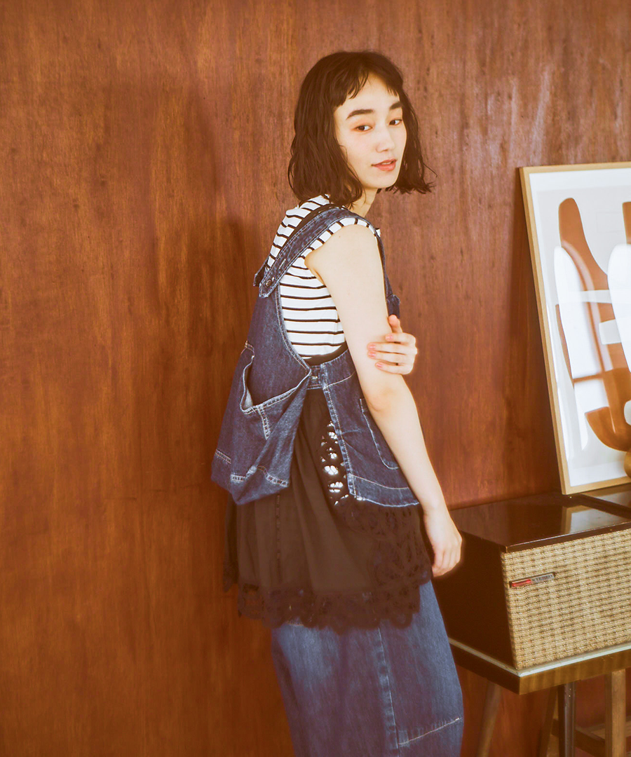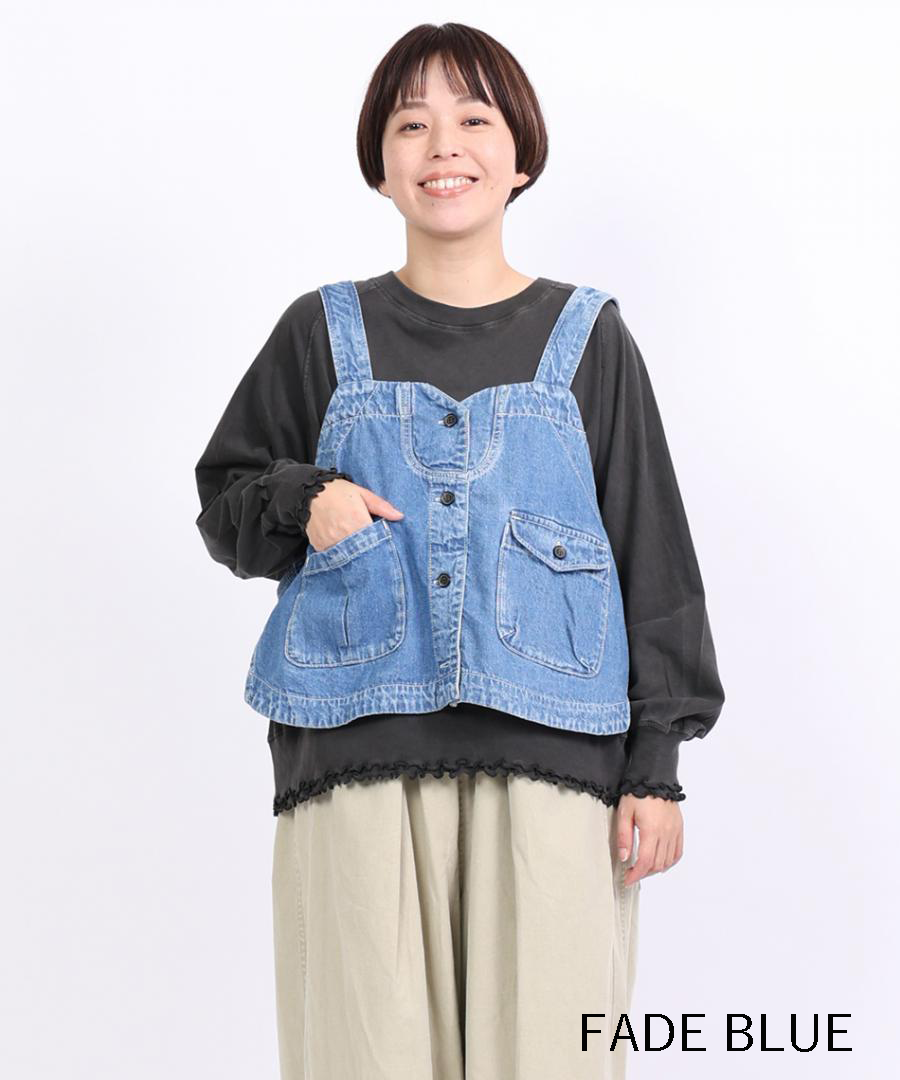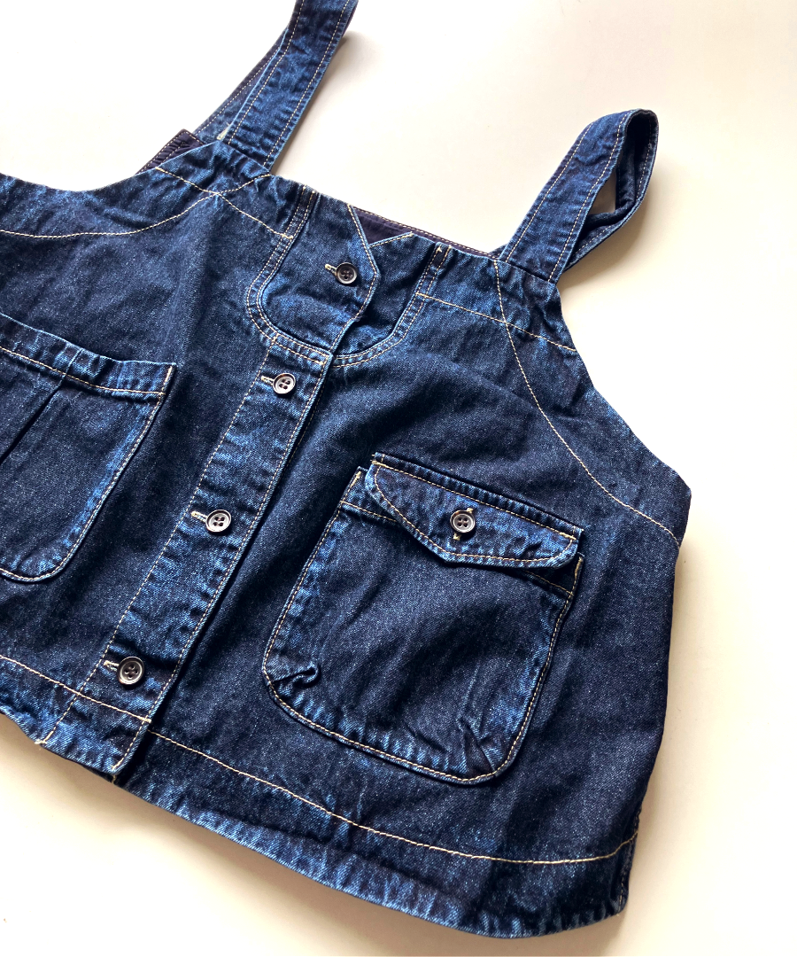 こすり加工を施すことで肌なじみがよく、ヴィンテージ感のある仕上がりになっています。コンパクトな丈感なので、ワンピースやカットソーに重ねるだけで、まるでビスチェを合わせているような旬のレイヤードスタイルが完成します。