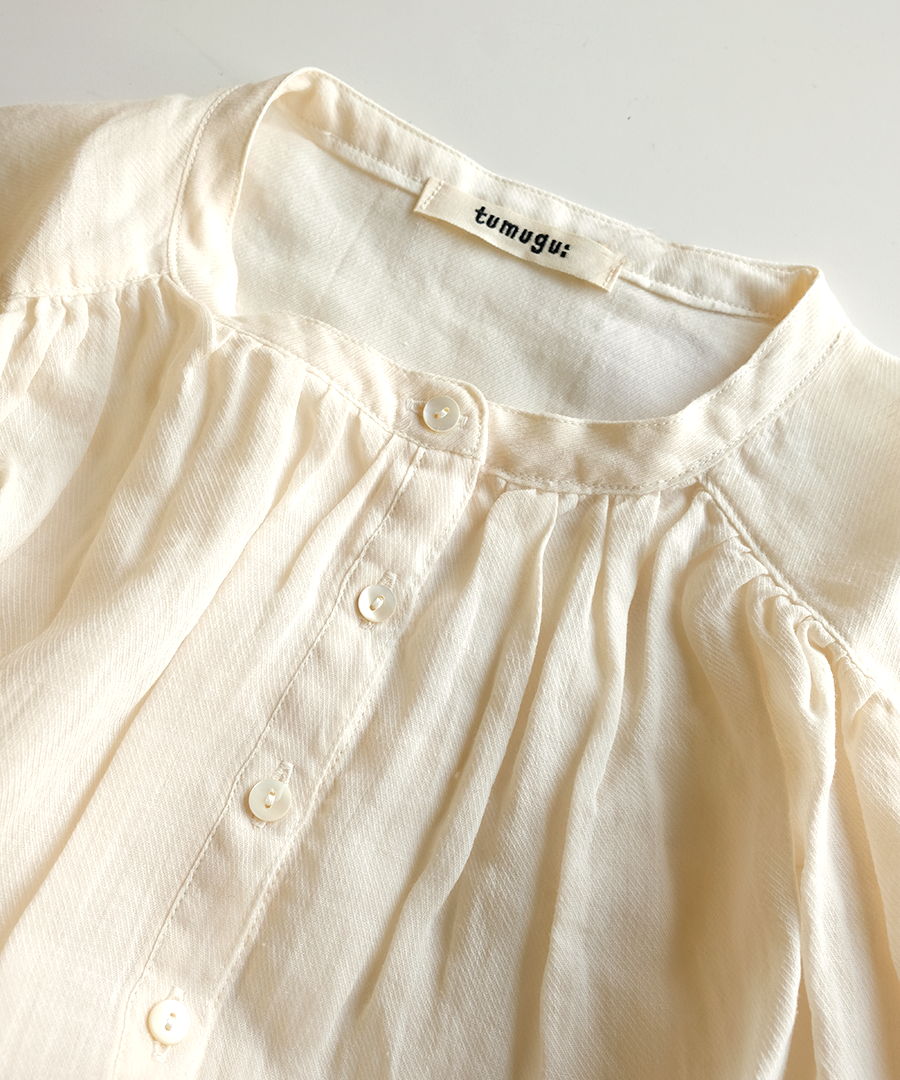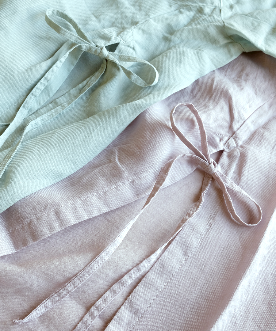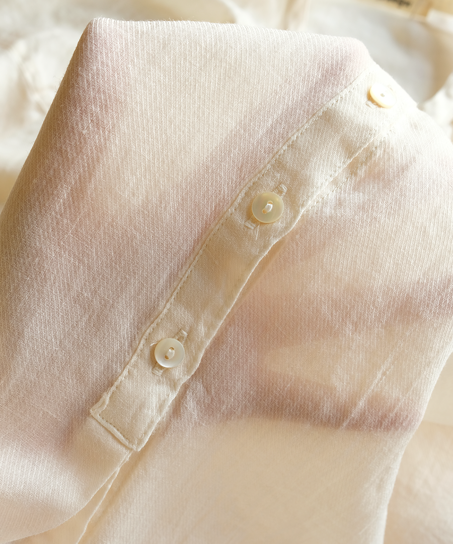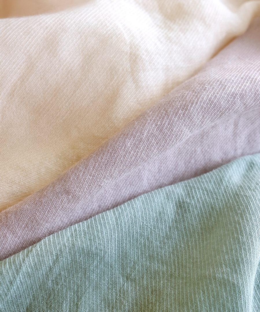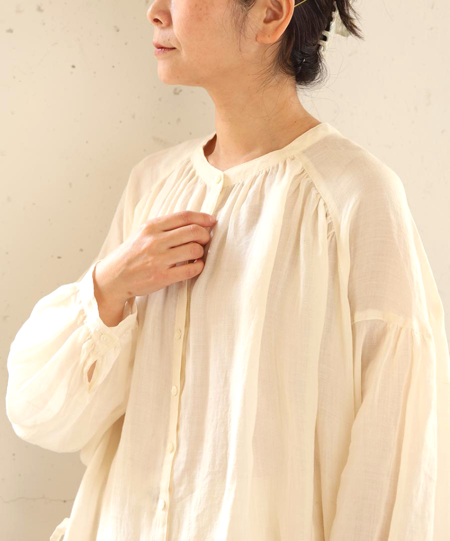 斜めの畝が浮かび上がる綾織により、光の当たり方で上品な陰影が生まれます。繊細に織り上げられた生地は、程よい透け感があり、見た目にも涼やか。インナーとの色の重なりを楽しめるのも魅力です。