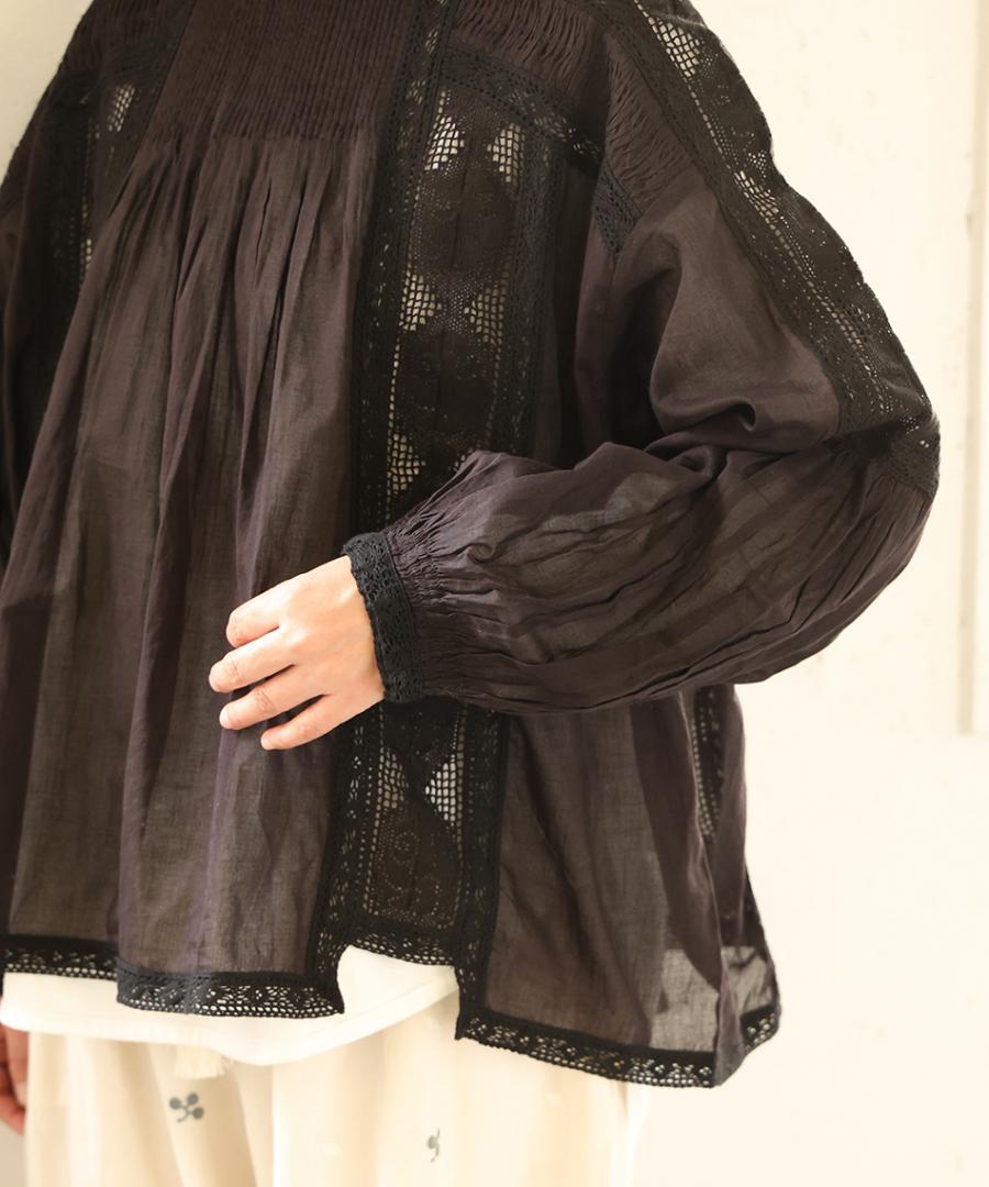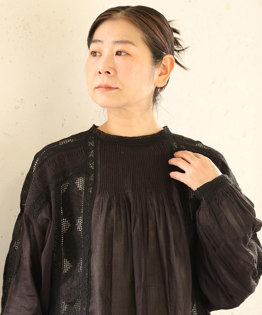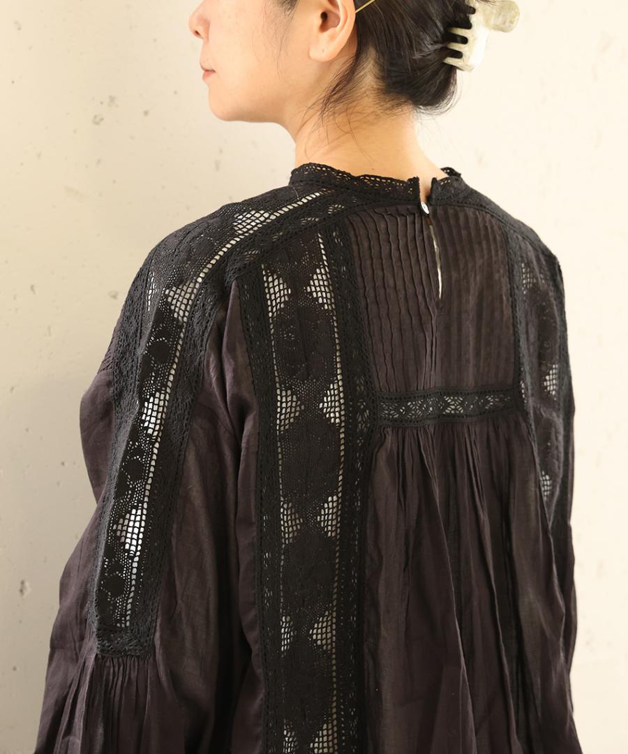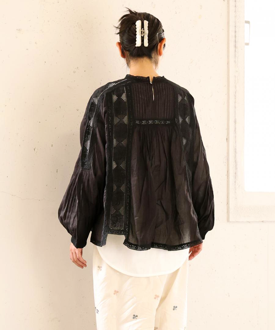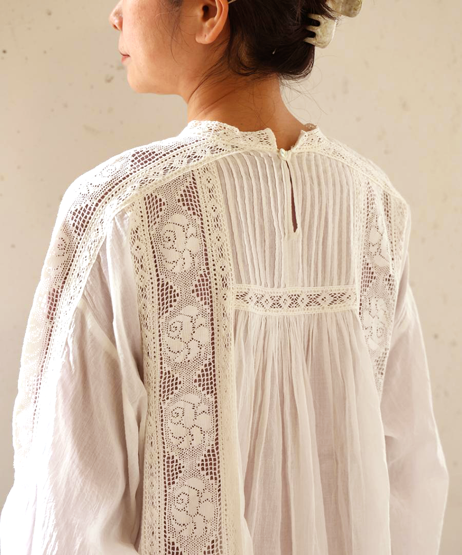 身頃や袖に贅沢にあしらわれたレースが印象的。クラシカルな花をモチーフにしたレースは、インナーとのレイヤードでその繊細な模様がより美しく浮かび上がります。胸元や背中の細かなピンタックが、ボリュームを程よく抑えつつ、立体的なシルエットを美しく保ちます。