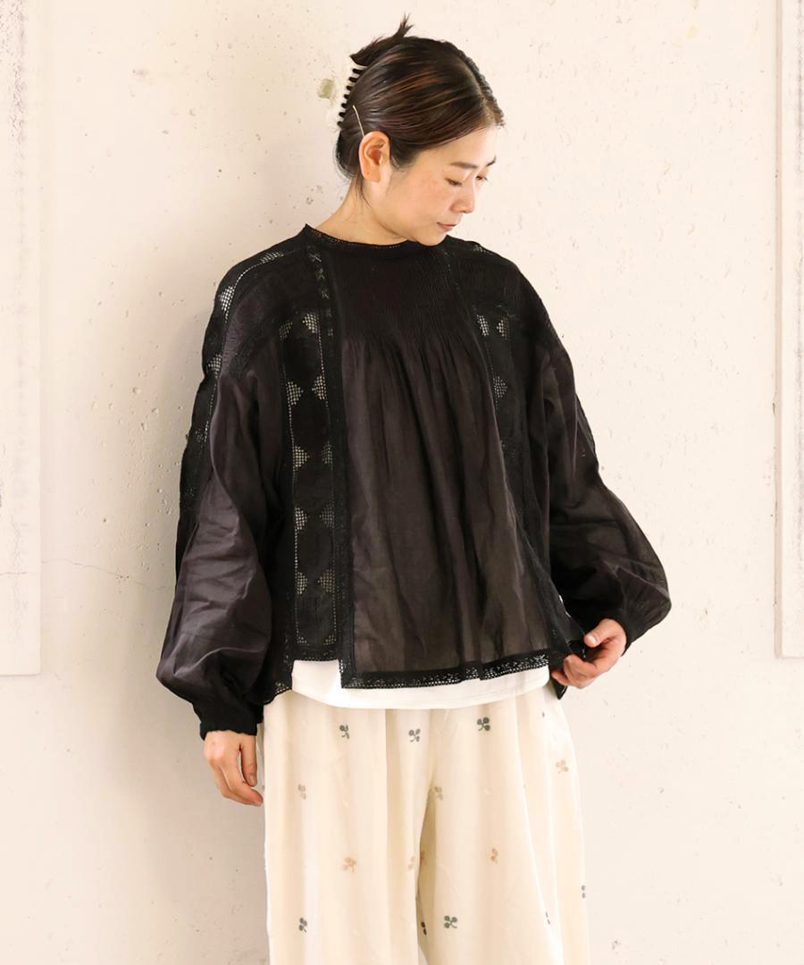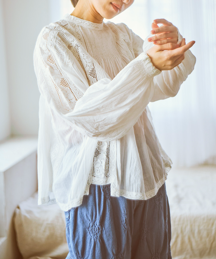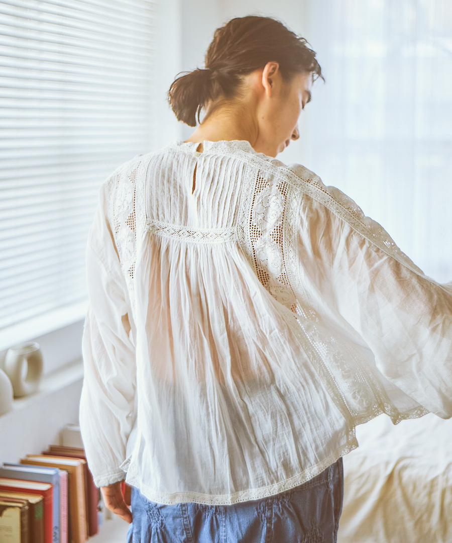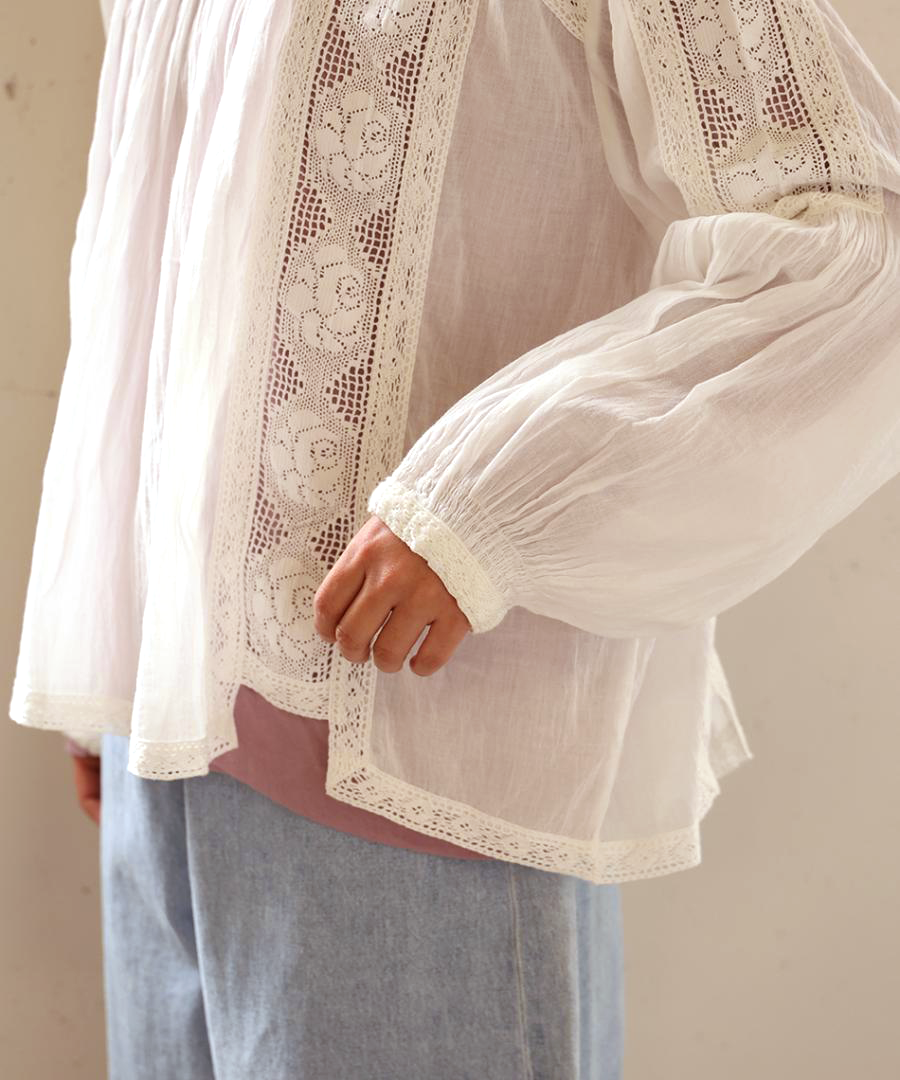 肩からたっぷりと生地を使った袖は、ぽわんと空気を含んだシルエットに。袖口のレース使いが、手元を可憐に彩ります。袖口をきゅっとたくし上げると、より立体感のあるボリューム感に。