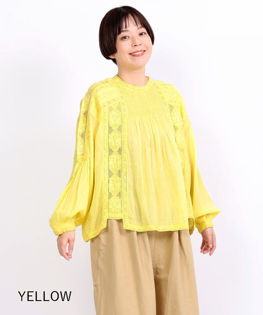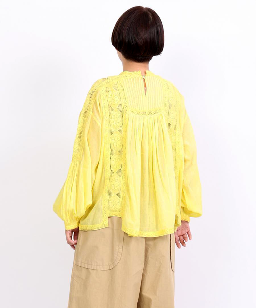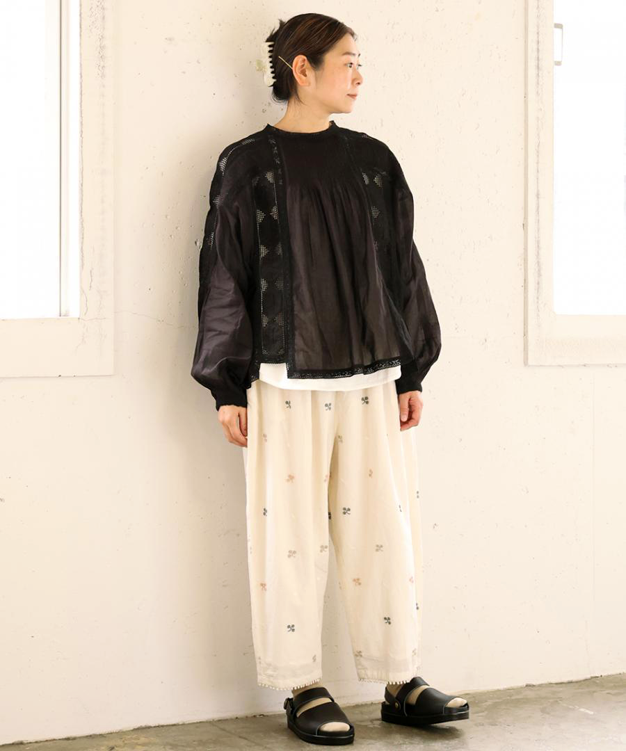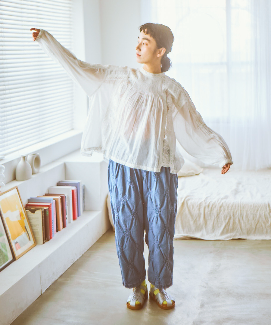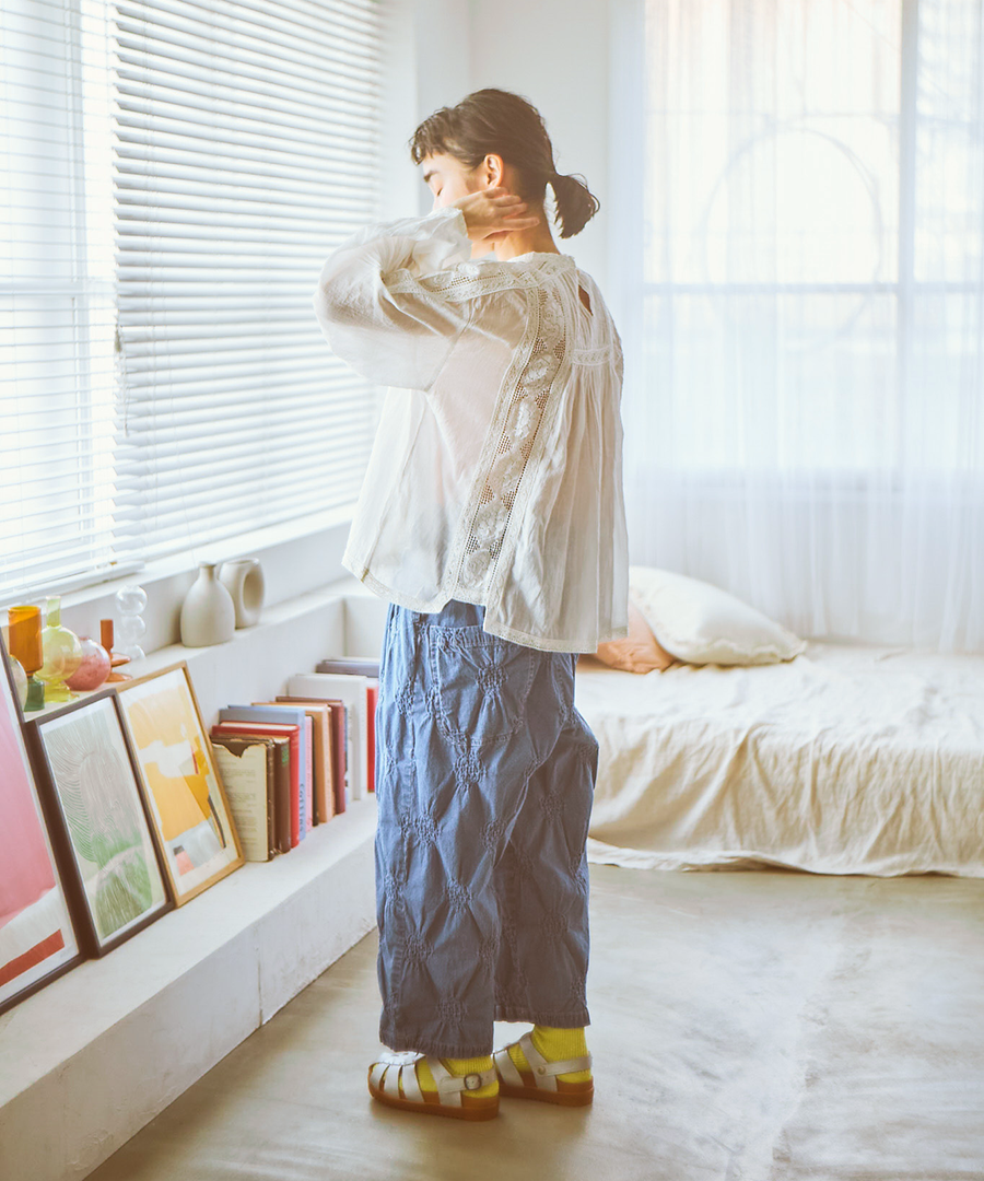 肩からたっぷりと生地を使った袖は、ぽわんと空気を含んだシルエットに。袖口のレース使いが、手元を可憐に彩ります。袖口をきゅっとたくし上げると、より立体感のあるボリューム感に。