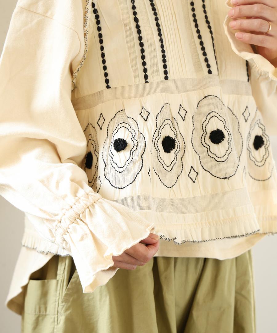 刺繍の上から表地のみを部分的に手作業でカットし、メッシュを透かした贅沢な仕様。立体的な表情と繊細な透け感のコントラストが、大人の着こなしに洗練された華やぎを添えます。繊細なピンタックやくるみボタンなど、クラシカルなディテールを詰め込みました。