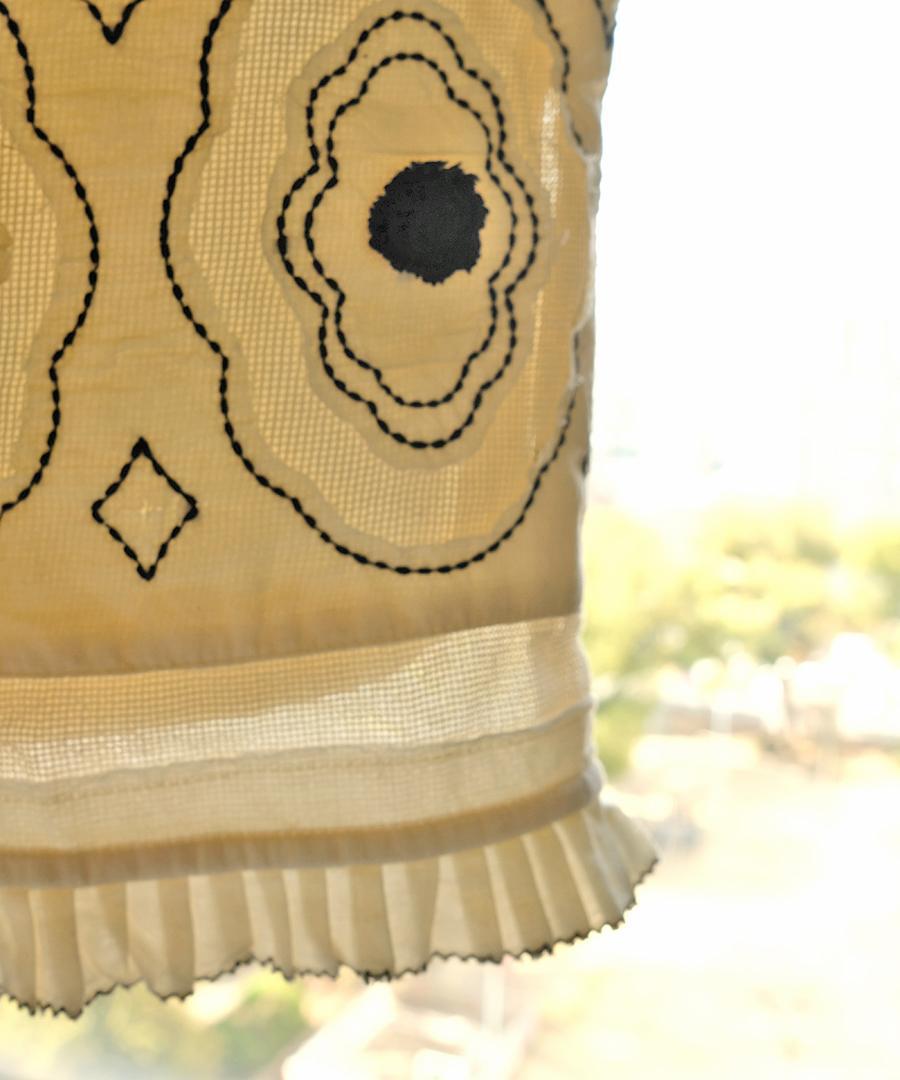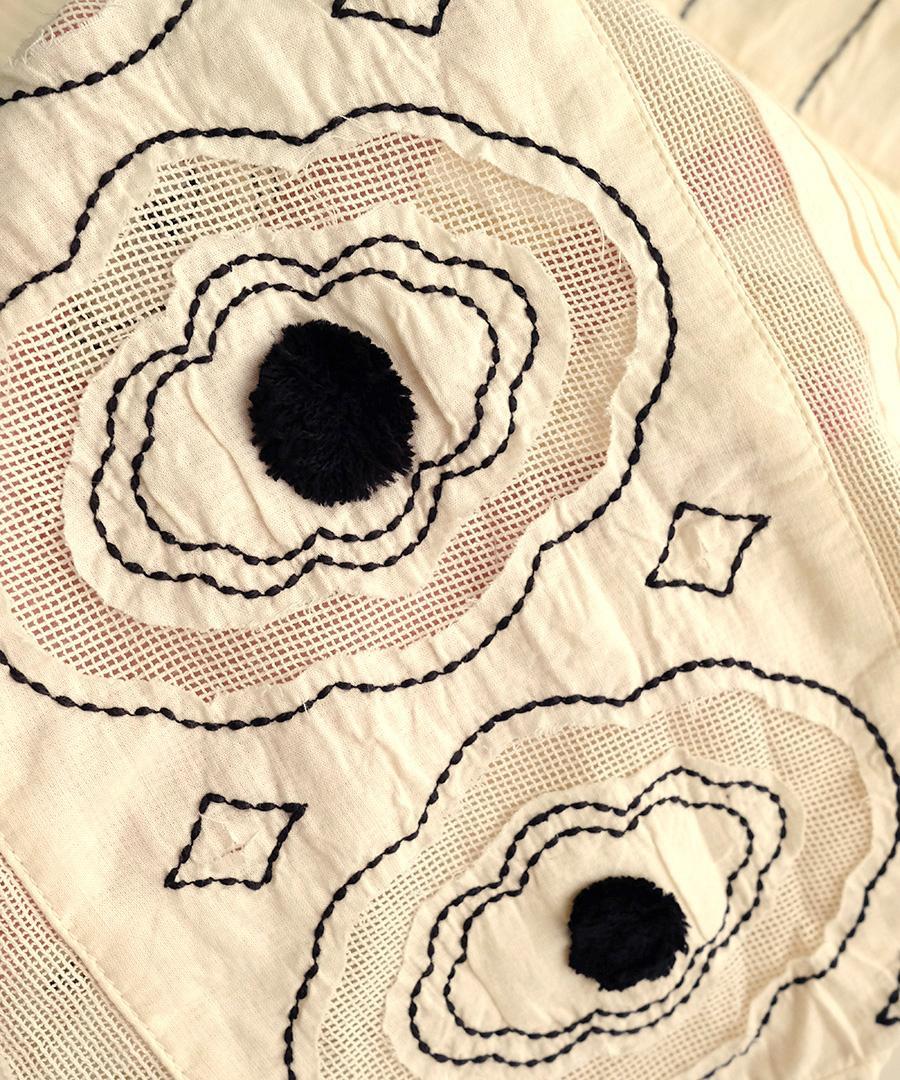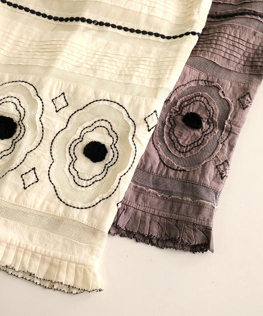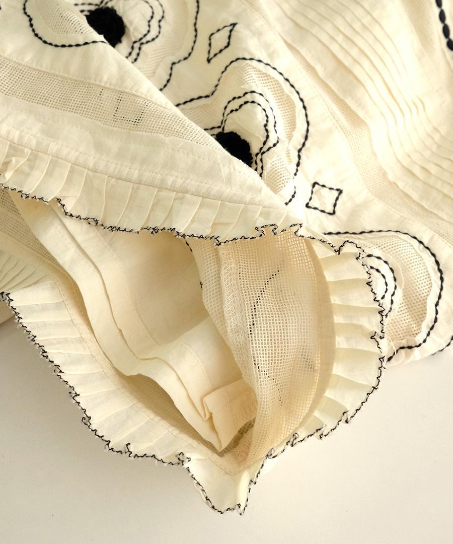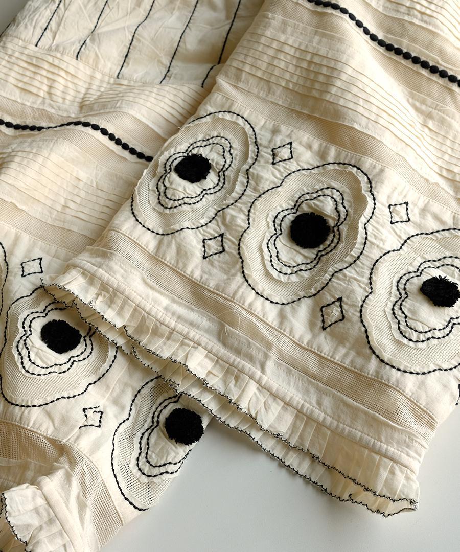 裾のメッシュ切り替え、繊細な刺繍、ピンタックにさりげないフリンジ。刺繍の上から表地のみを部分的にハンドカットし、中のメッシュを透かした贅沢な仕様。繊細な職人技による、立体的な表情と軽やかな抜け感が魅力です。