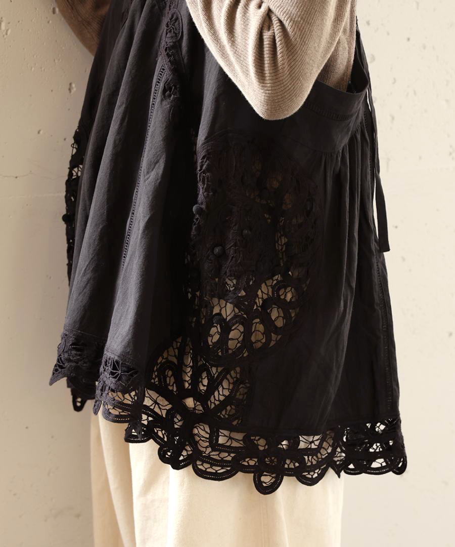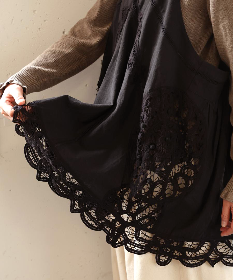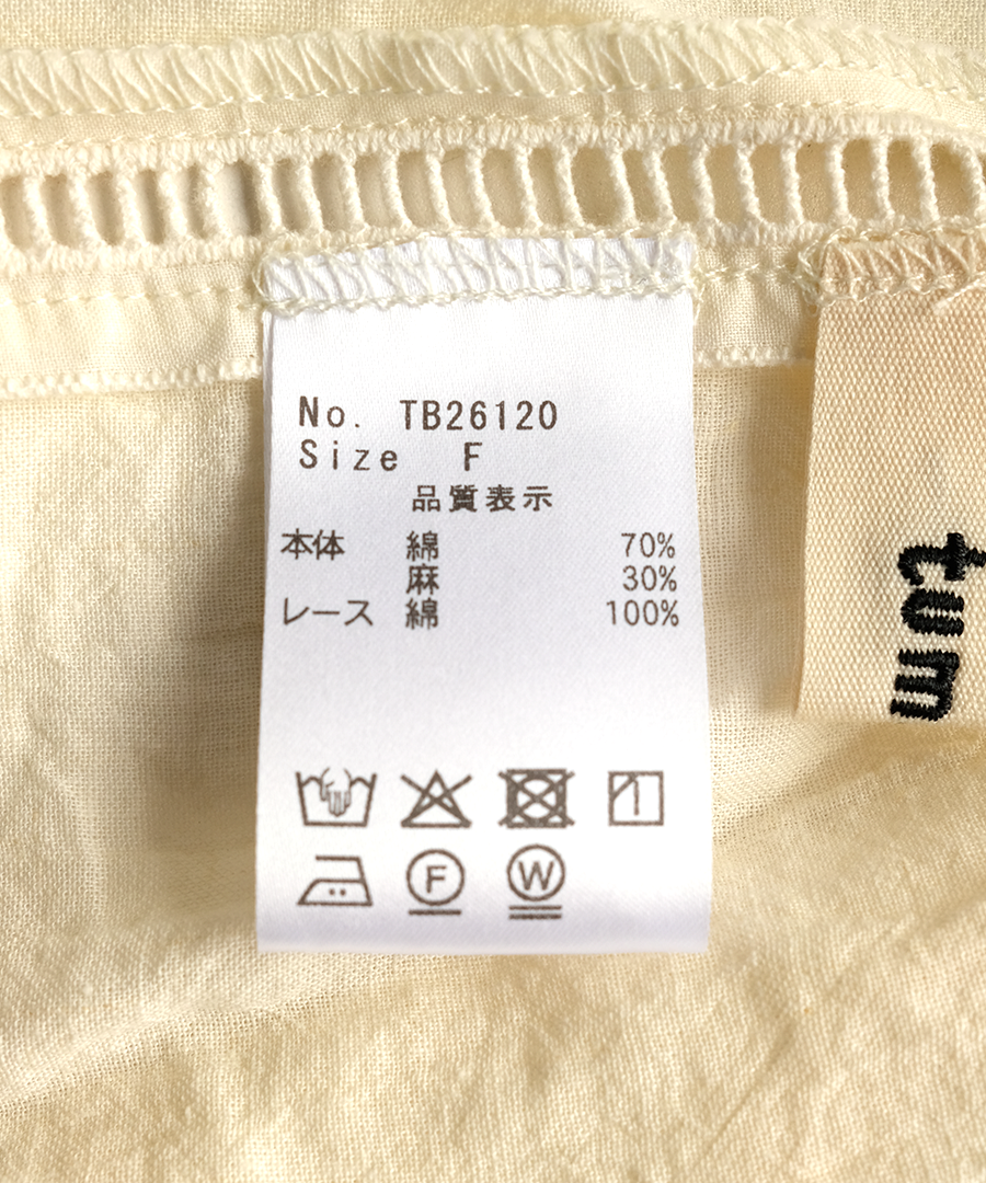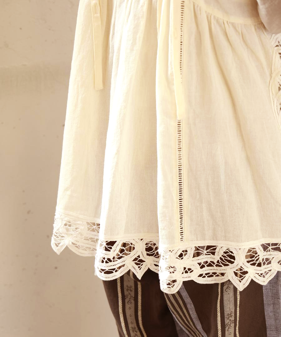 この製品はバテンレースを贅沢に使用しています。非常に繊細な素材のため、着用時や洗濯の際の引っ掛けには十分ご注意ください。着用時の摩擦やバッグ等の引っ掛けにより、飾りの脱落や糸のほつれが生じる恐れがあります。万が一、レースの糸が浮き出した場合は、引っ張らずに、針などで裏側に引き込んでください。お洗濯は、色落ちや変色を防ぐため、蛍光増白剤の入っていない洗剤を使用し、飾りを守るためにも必ず単独で裏返してネットに入れ、優しく手洗いしていただくことをおすすめします。また、レースの立体感を保つため、アイロンをかける際は、低温~中温で必ず当て布をし浮かせるように優しくスチームを当ててください。