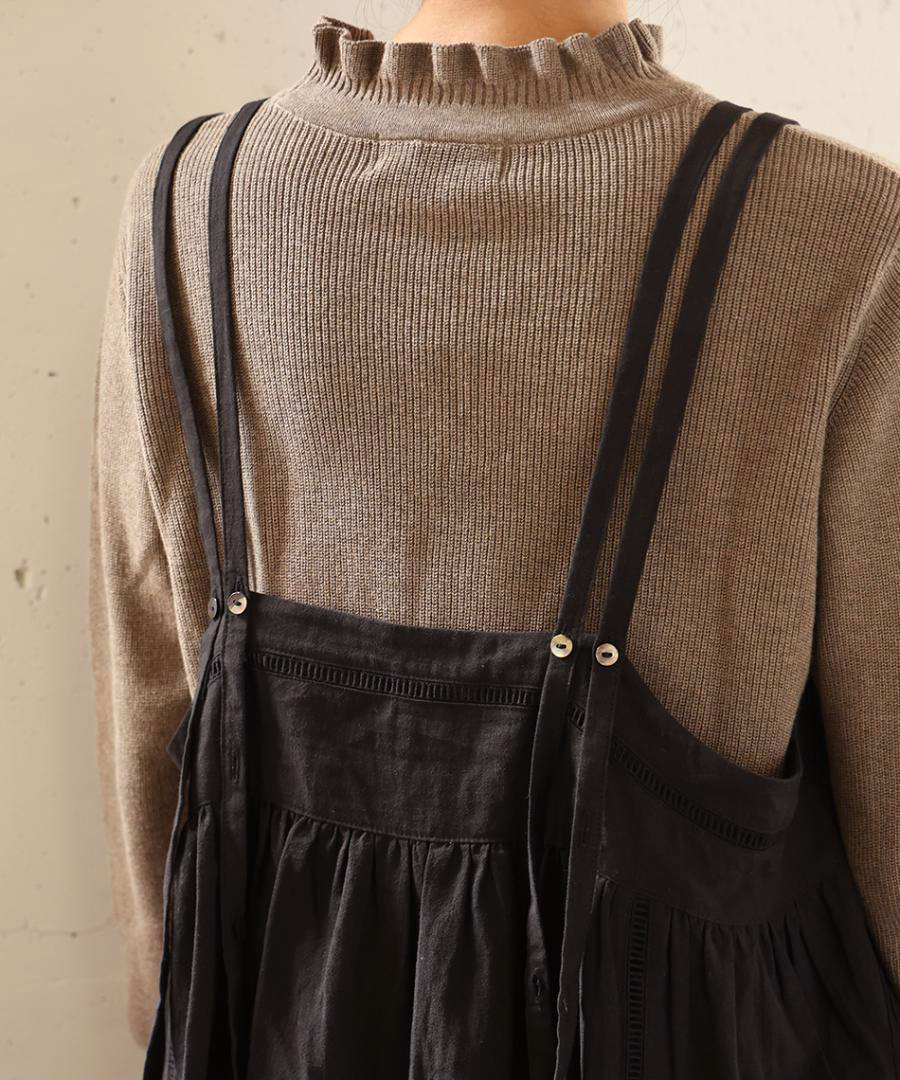 「キャミソールデザイン」と、「スクエアデザイン」を楽しめる前後2WAY仕様。ボタン側の切り替えからふんわり広がるAラインシルエットでカラダのラインを優しくカバーしてくれます。肩紐はボタンで3段階調整でき、インナーの厚みに合わせたベストなバランスが可能。脇が大きく開いているので、ゆったりと重ねていただけます。