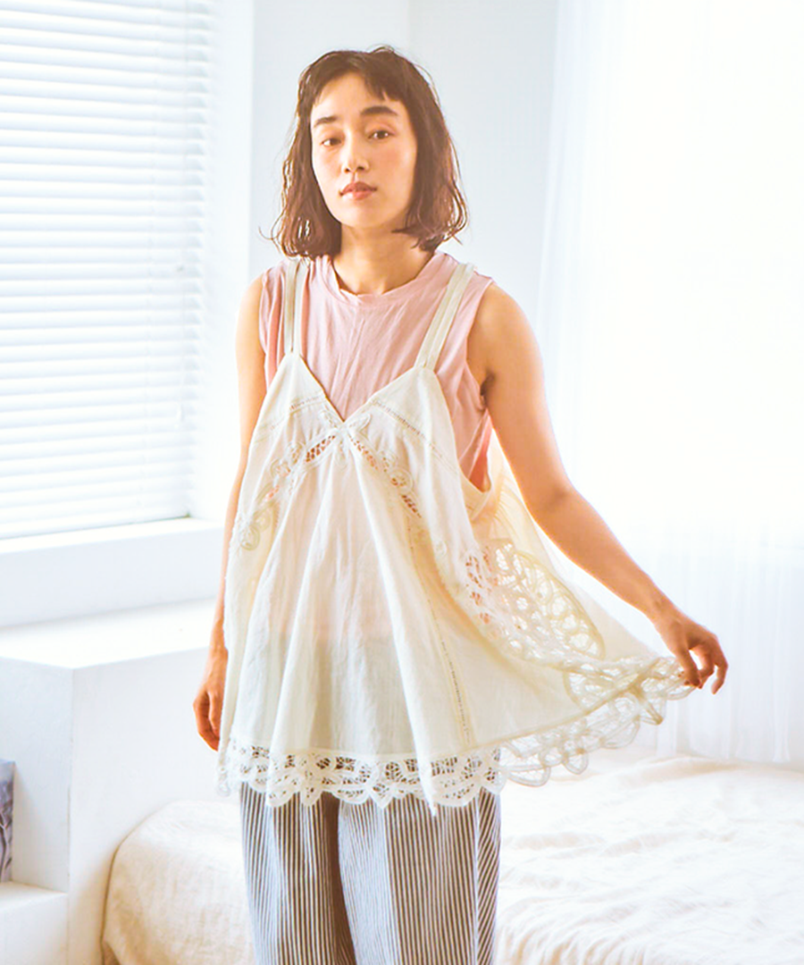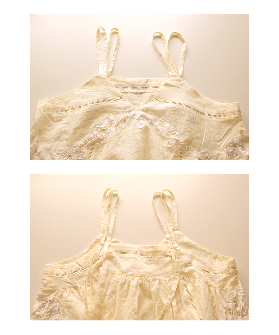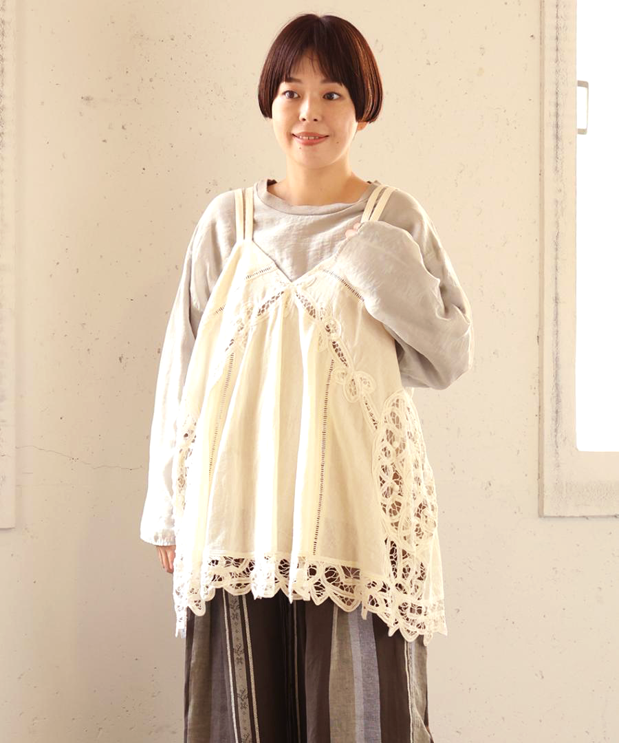 オリジナル柄のバテンレースを惜しみなくあしらった、2wayキャミソール。コットンリネンの粗野な風合いと、繊細なレースワークが魅力です。