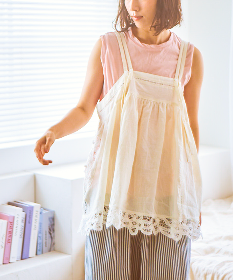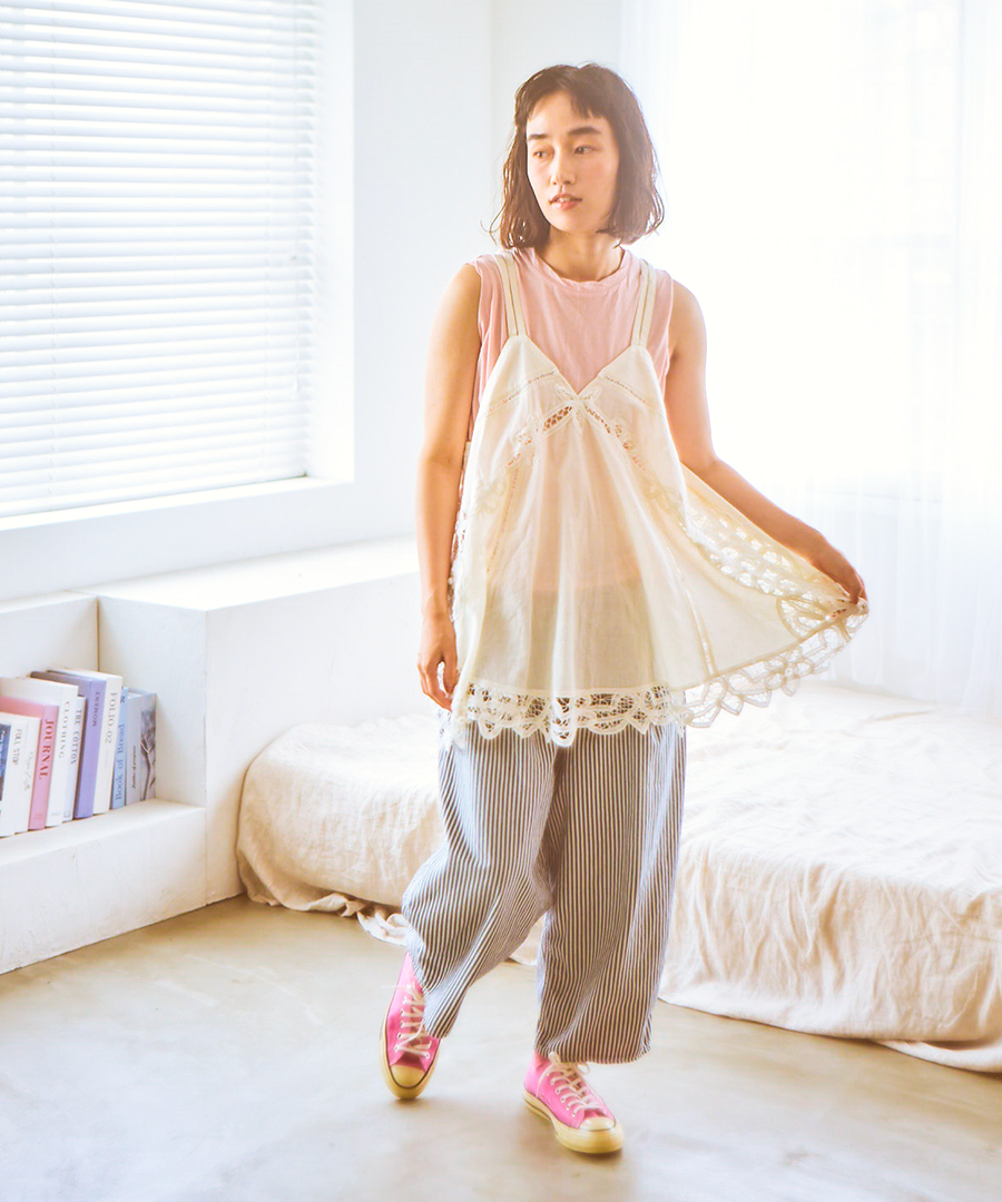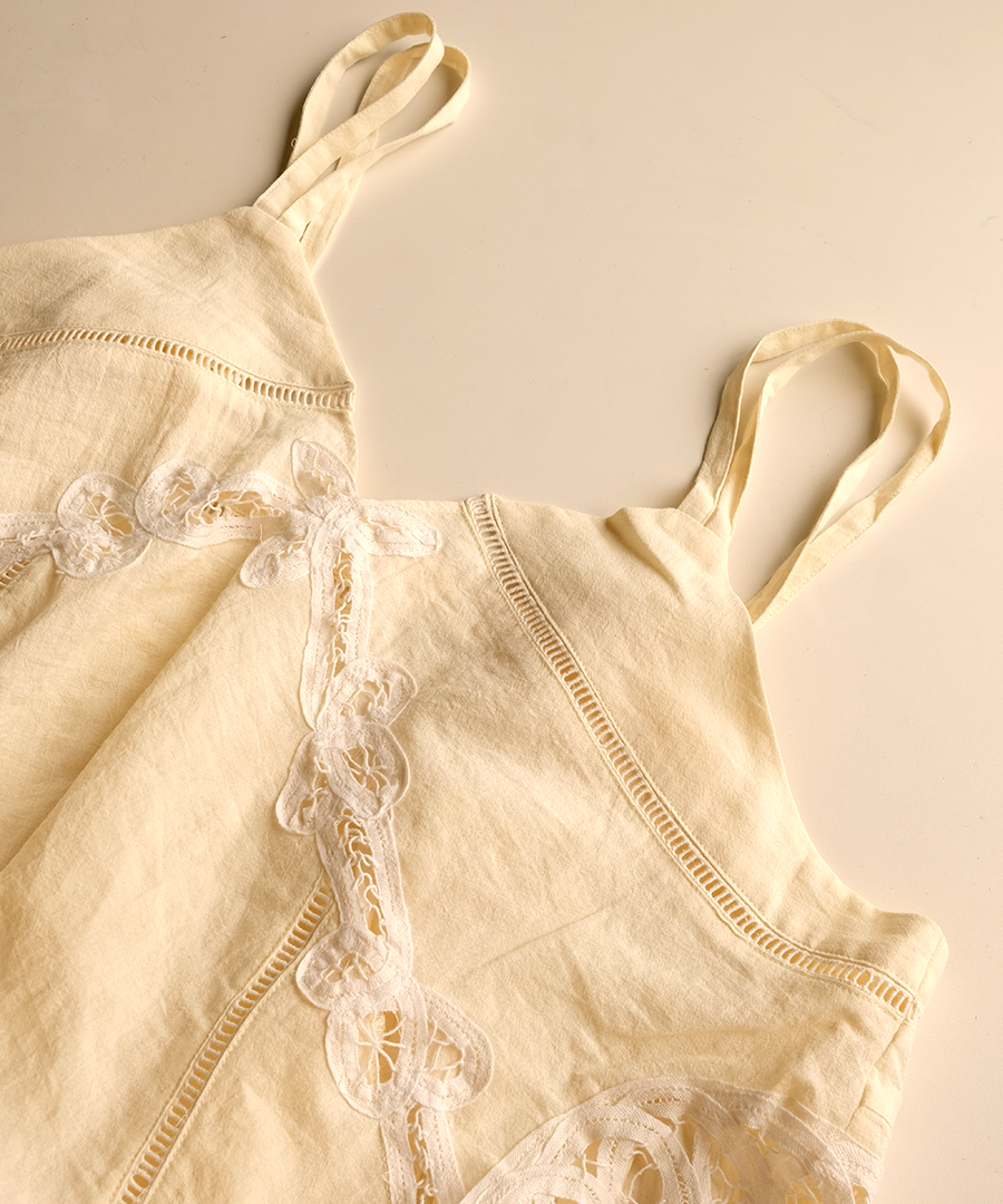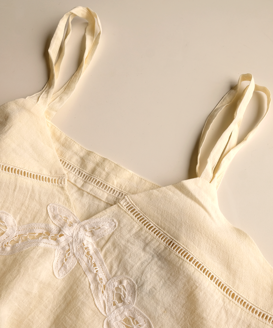 オリジナル柄のバテンレースを惜しみなくあしらった、2wayキャミソール。コットンリネンの粗野な風合いと、繊細なレースワークが魅力です。