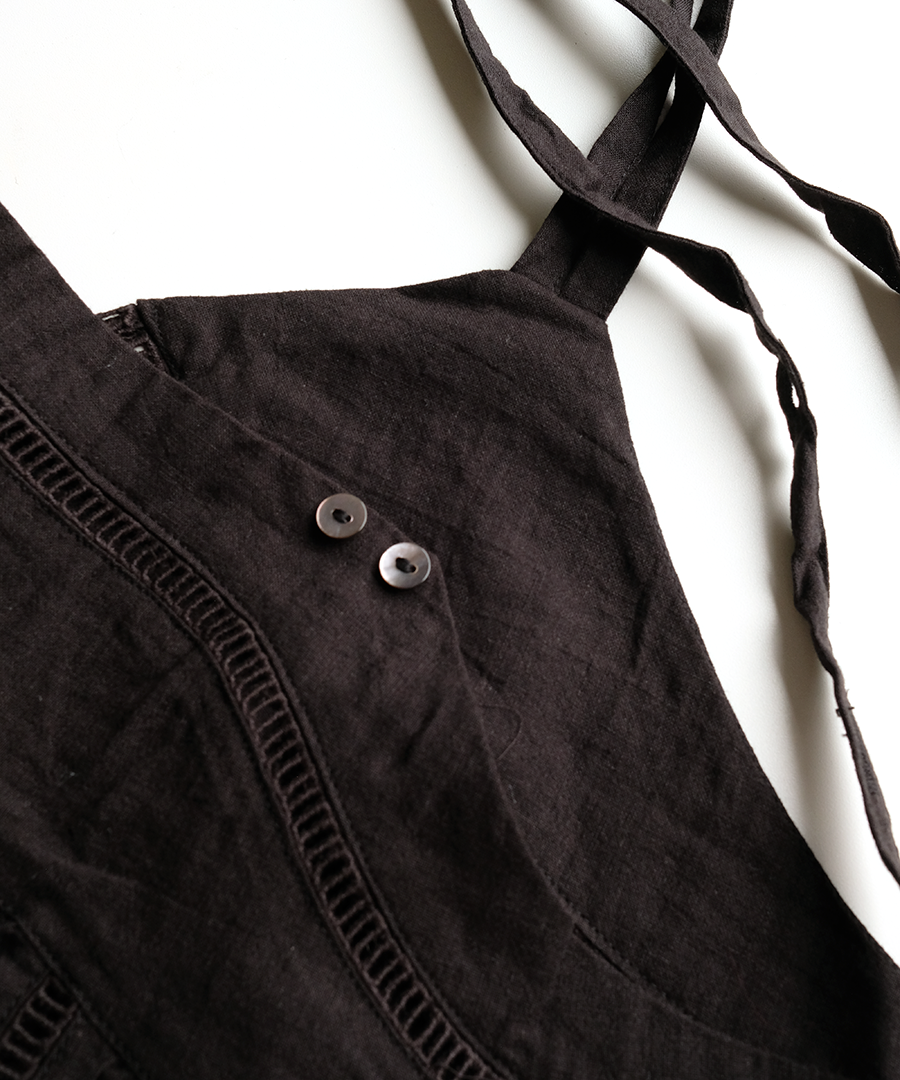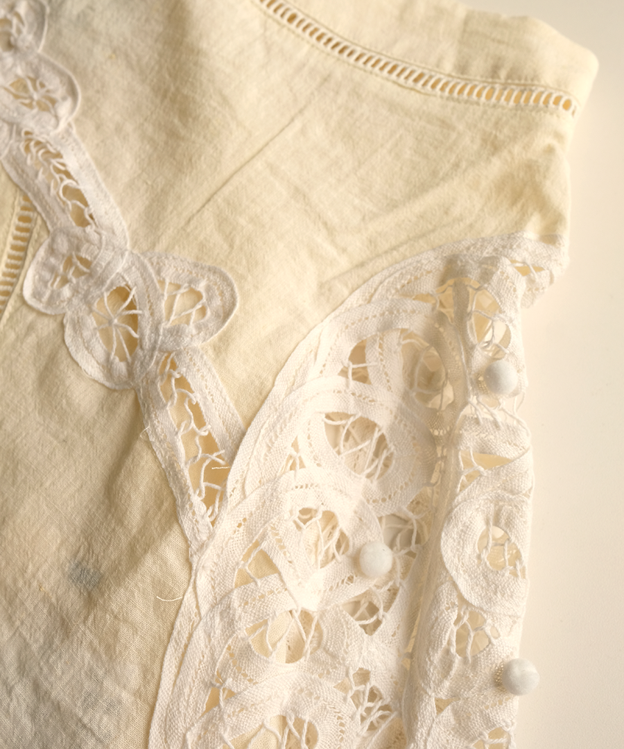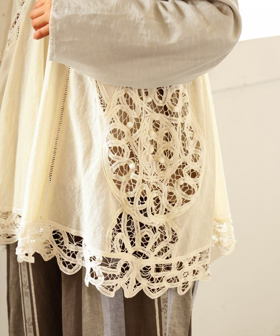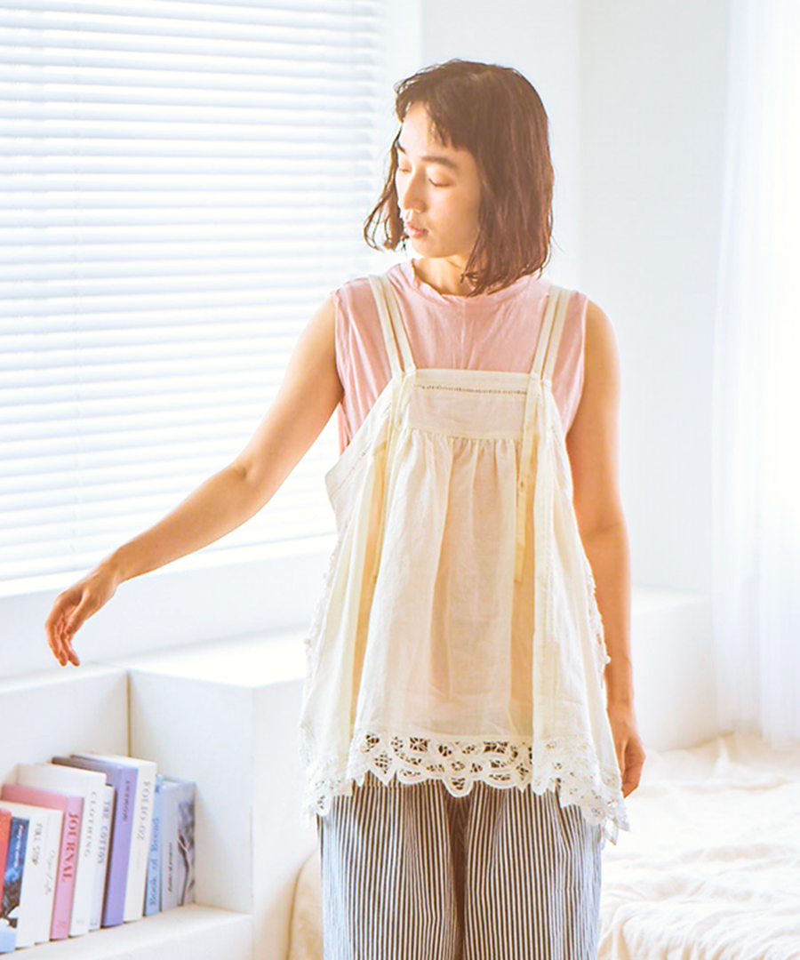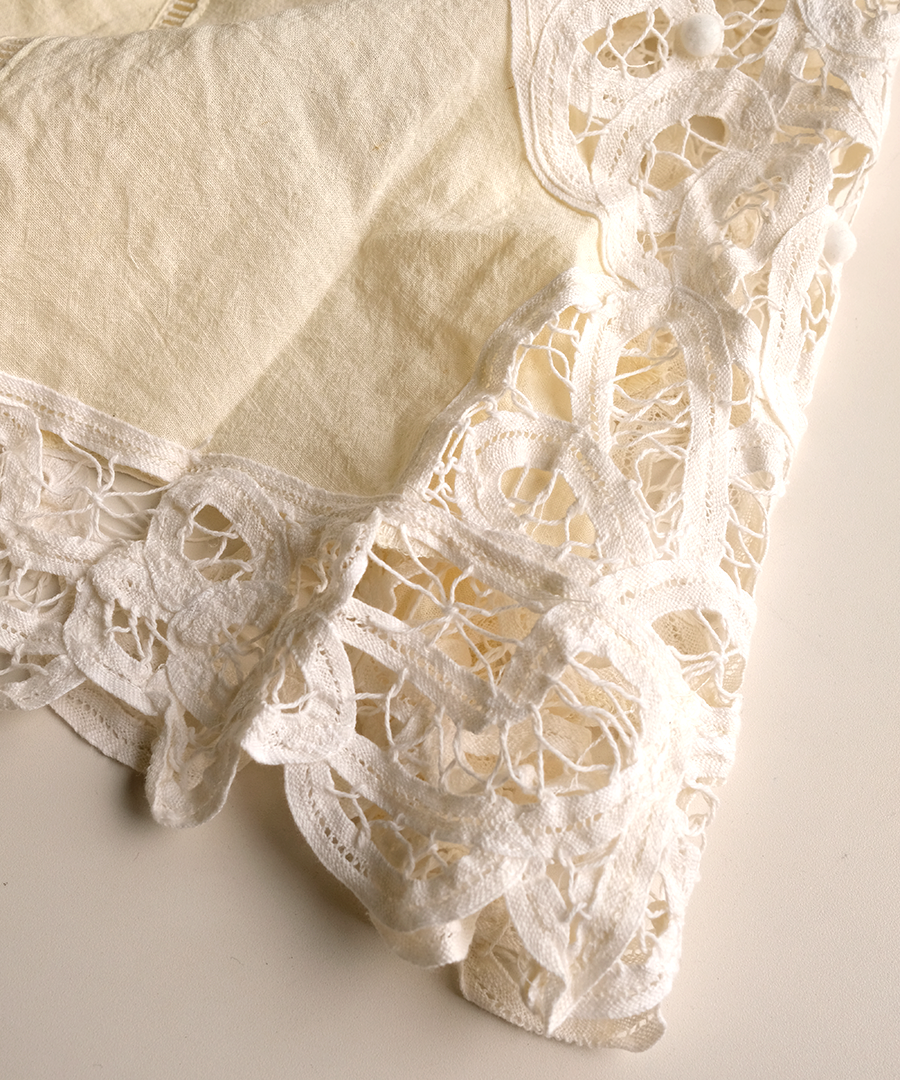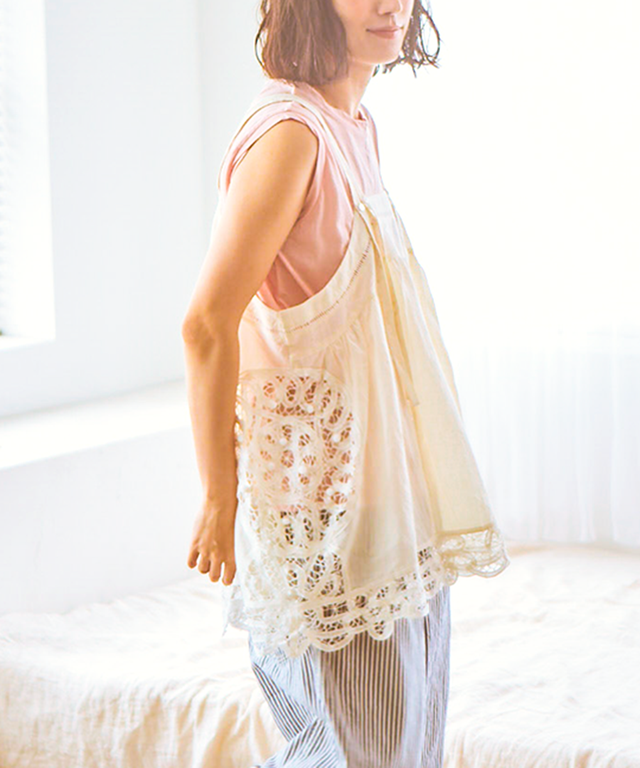 ※天然素材の生地と手仕事のレースを組み合わせているため、光の当たり方と時間帯によってレースの色が白く見えたり馴染んだり、変化して見えることがあります。時間帯や場所によって少しずつ表情が変わる、素材特有の自然な風合いとしてご理解ください。