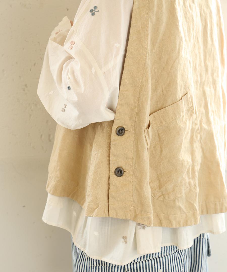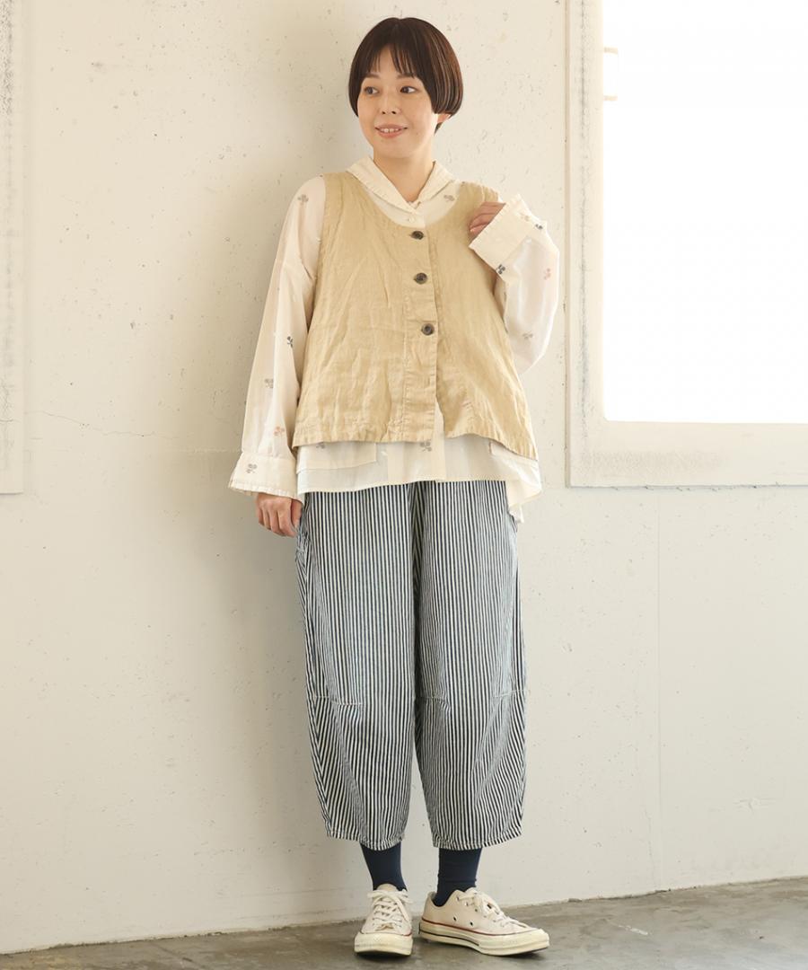 吸湿・速乾性に優れたリネンは、夏は涼しく冬は重ね着で暖かく、製品染めを施すことで、リネン特有のハリを残しつつ、最初から肌に馴染むようなくったりと柔らかな表情と洗いざらした、ナチュラルなしわ感のある風合いです。