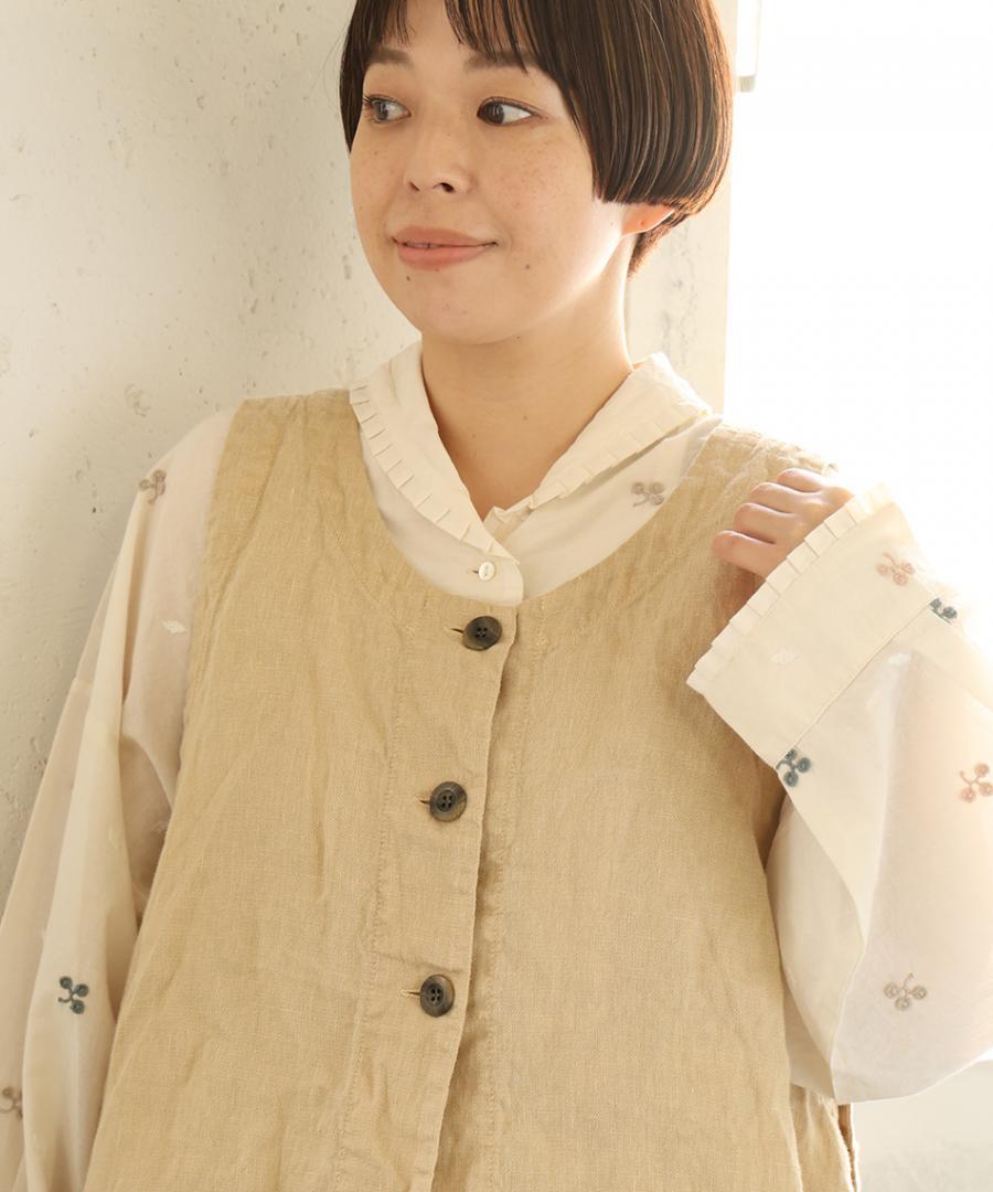 裾に向かって緩やかに広がるフレアーシルエット。脇周りを広めに取っているため、ボリューム袖やワンピースの上にも、もたつかずに重ねられます。