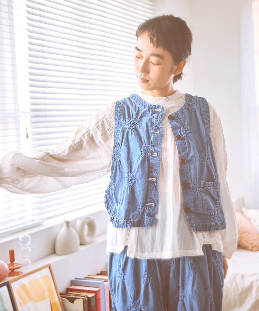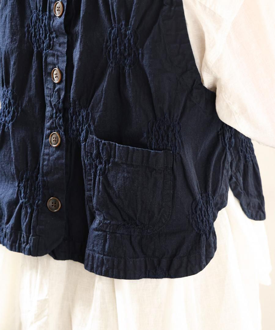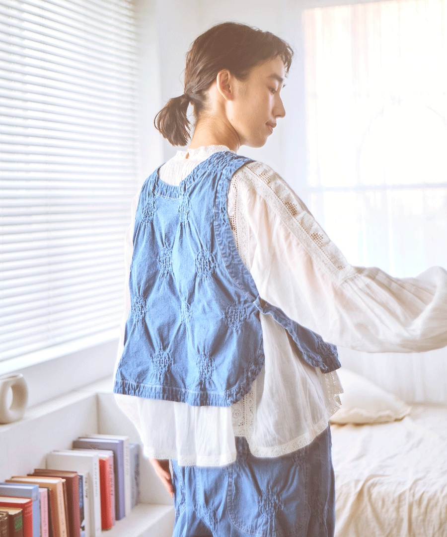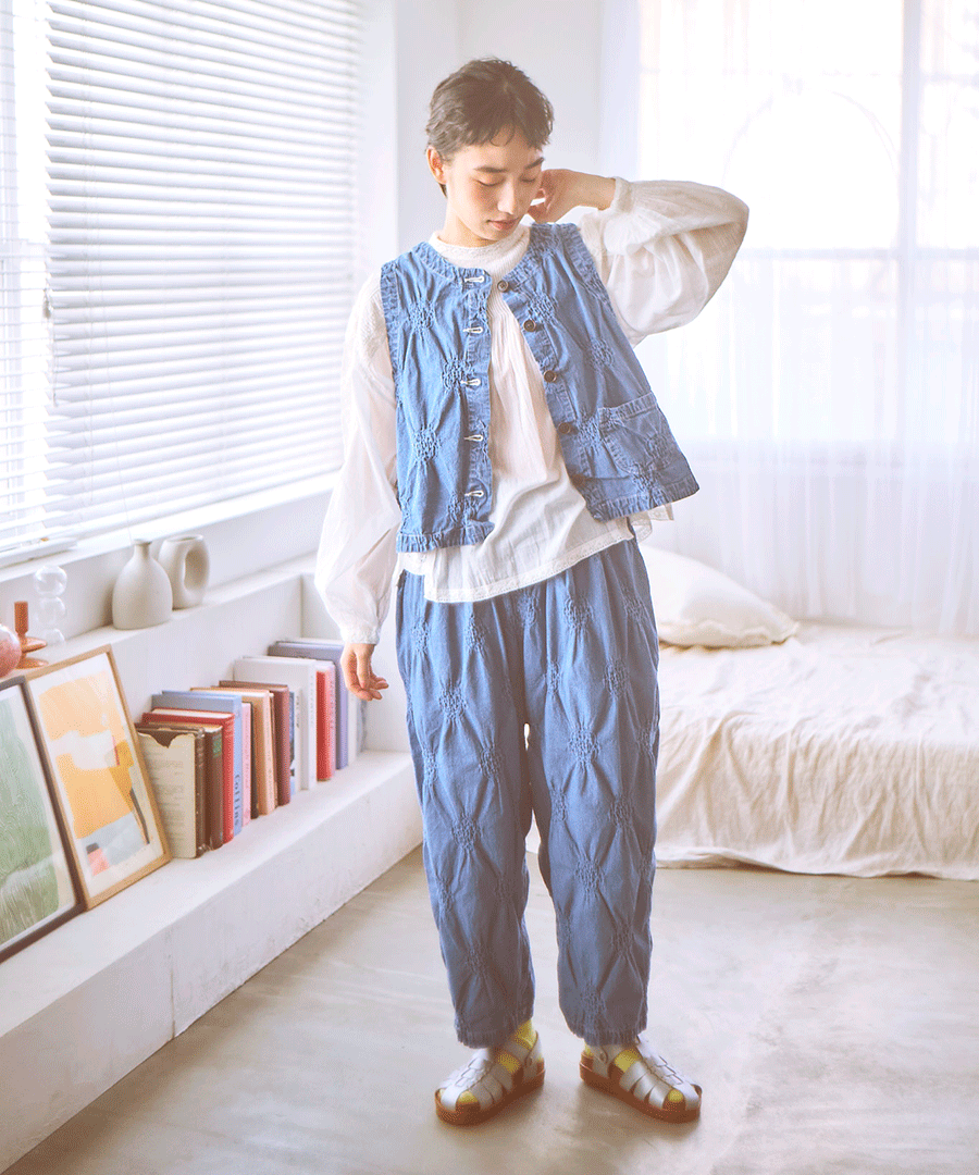 ぽこぽことした立体的な浮き出し模様が目を惹く、パフジャガード生地を使用した2wayベスト。デニムのような風合いを、ジャガード特有の凹凸感でモダンに仕上げた一着。