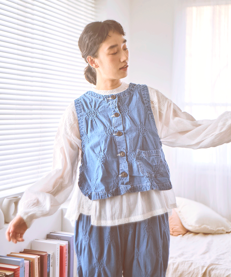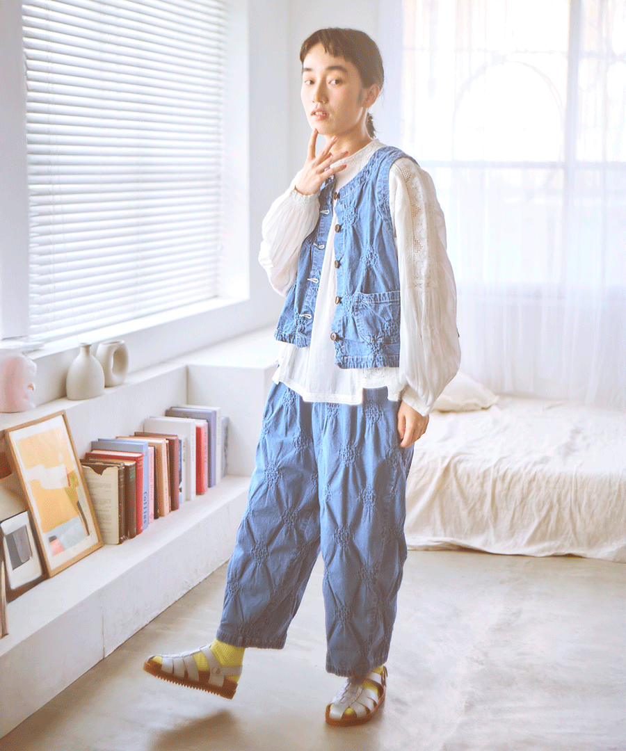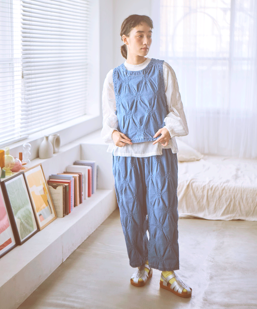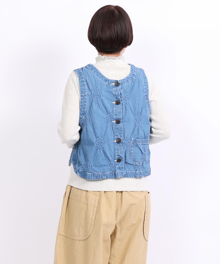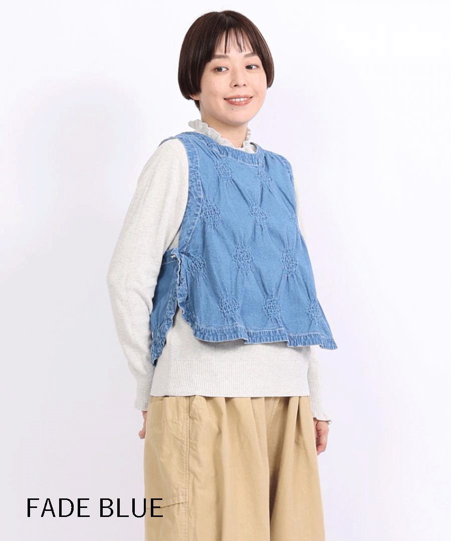 ぽこぽことした立体的な浮き出し模様が目を惹く、パフジャガード生地を使用した2wayベスト。デニムのような風合いを、ジャガード特有の凹凸感でモダンに仕上げた一着。
