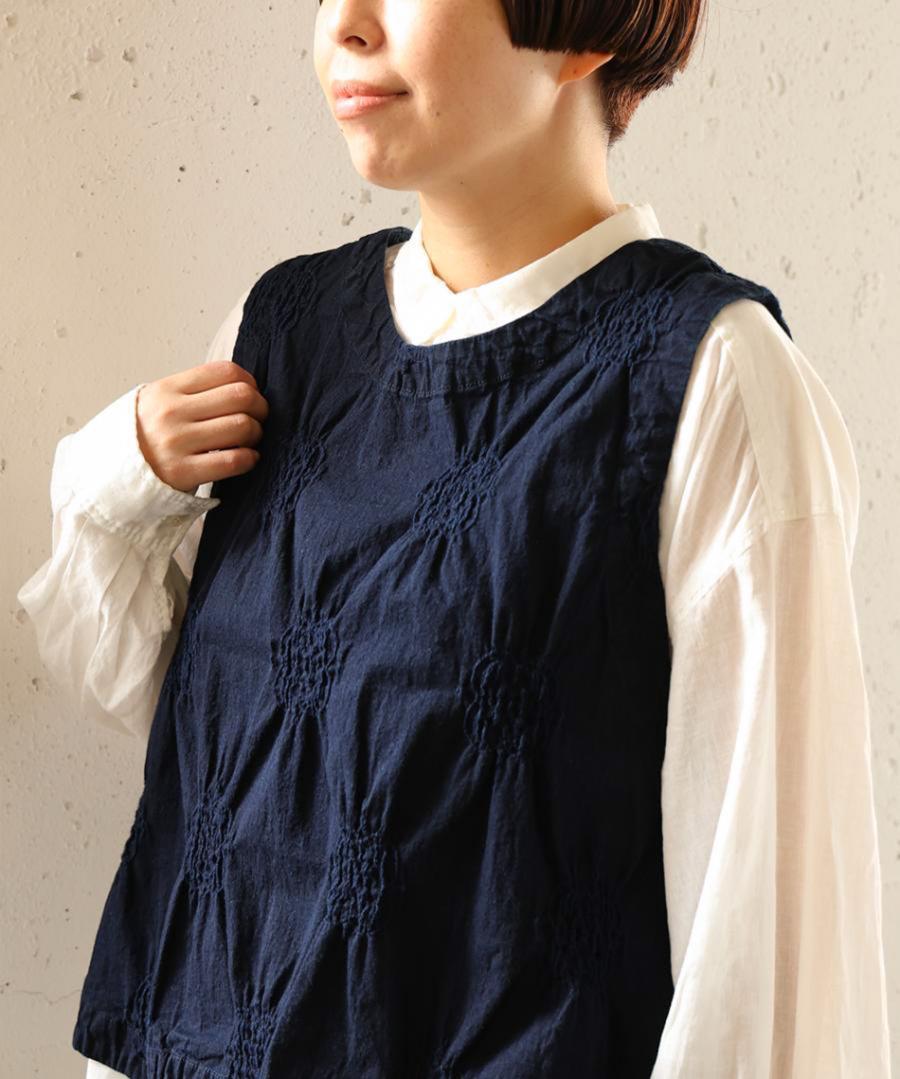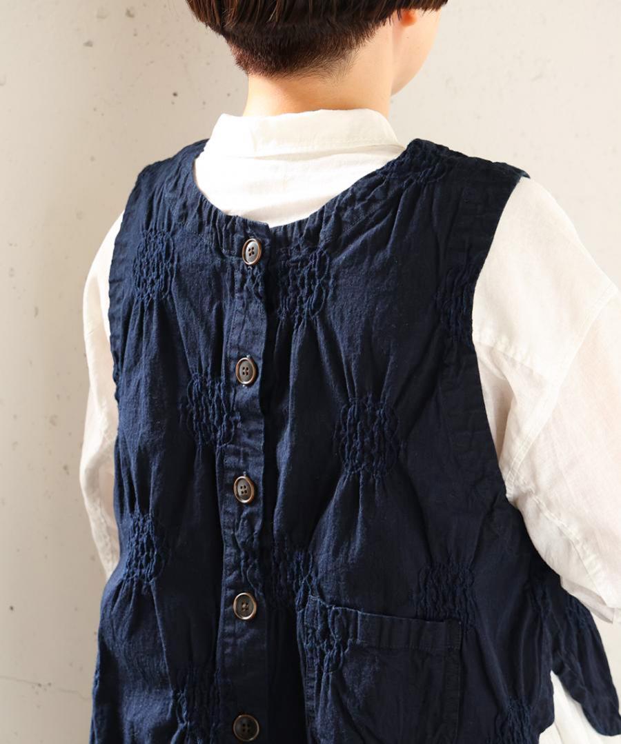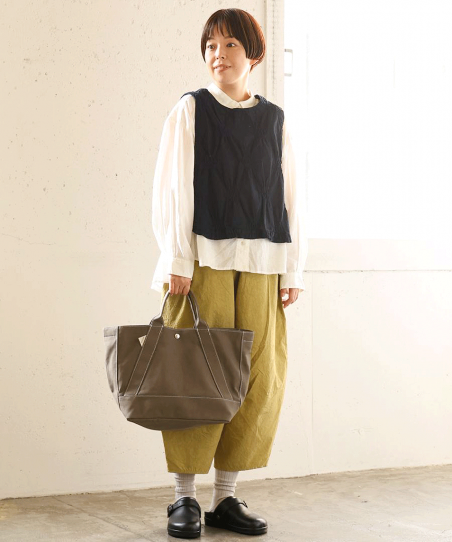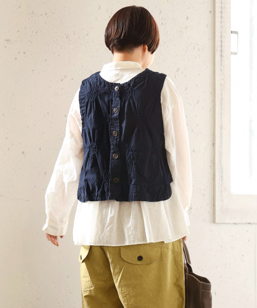 見た目はすっきりコンパクトながら、アームホール(AH)を広めにとり、脇も大きく開いているのでゆったり。ボリューム袖のブラウスや厚手のカットソーにも重ねられます。同シリーズのパンツとのセットアップもおすすめ。