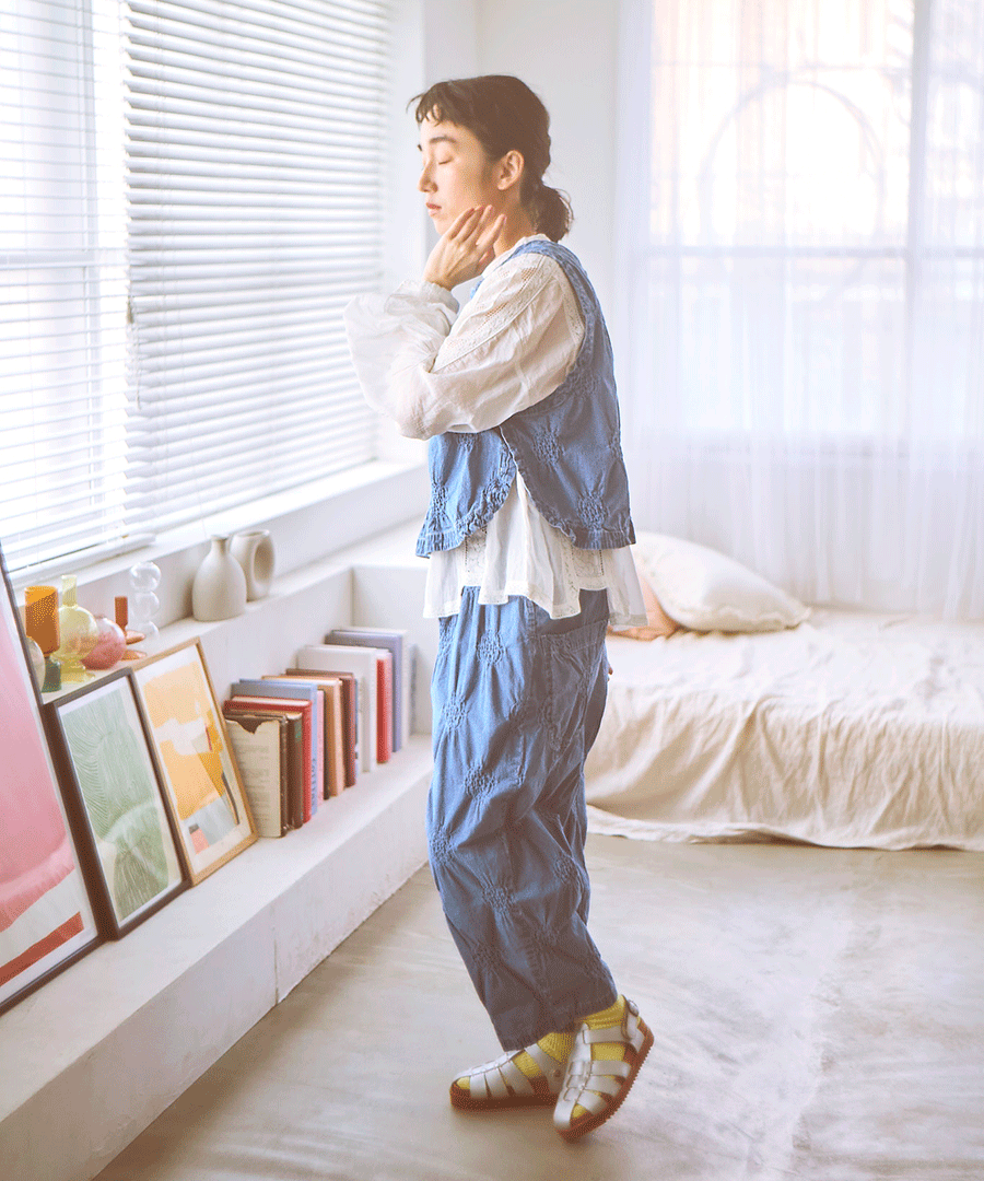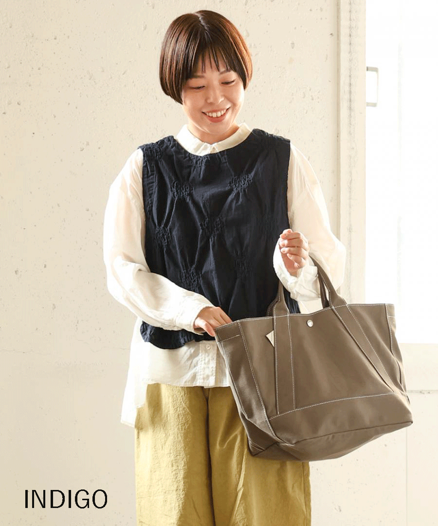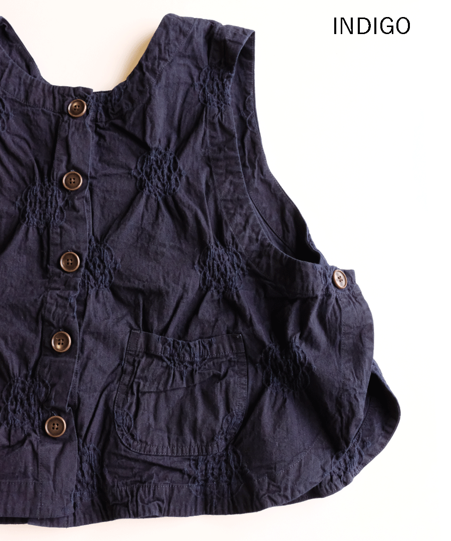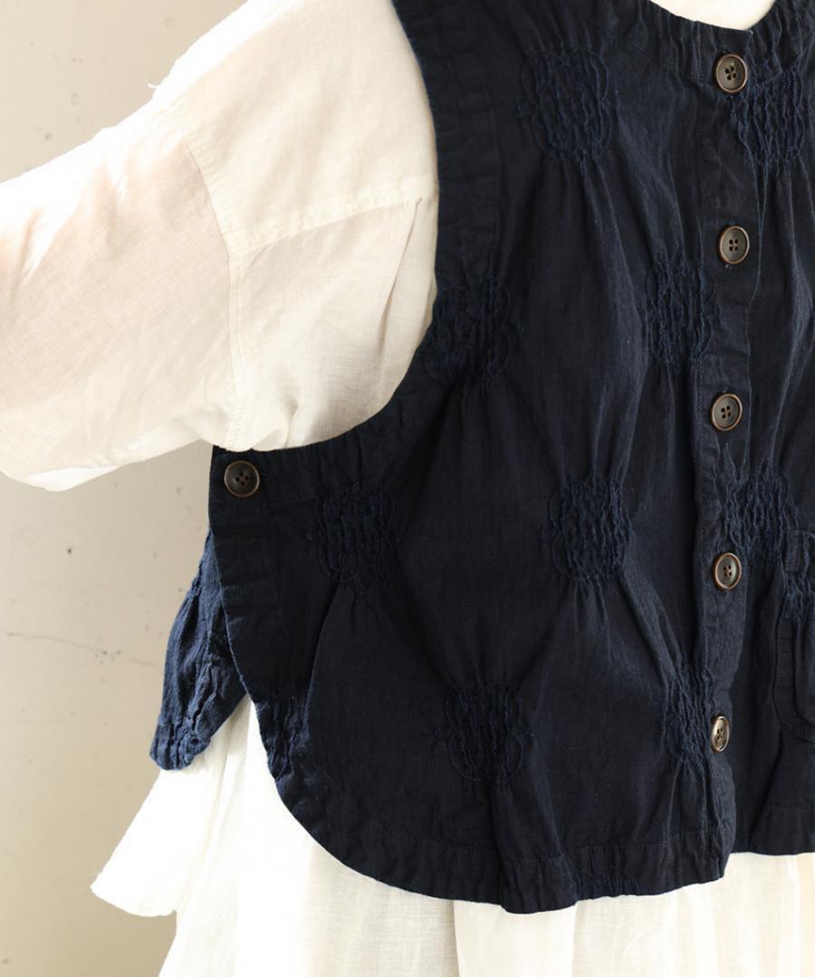 見た目はすっきりコンパクトながら、アームホール(AH)を広めにとり、脇も大きく開いているのでゆったり。ボリューム袖のブラウスや厚手のカットソーにも重ねられます。同シリーズのパンツとのセットアップもおすすめ。