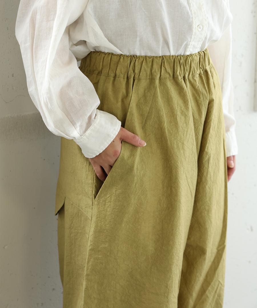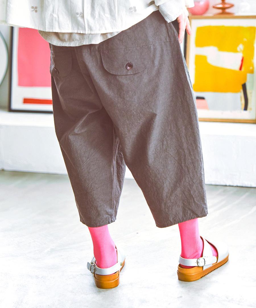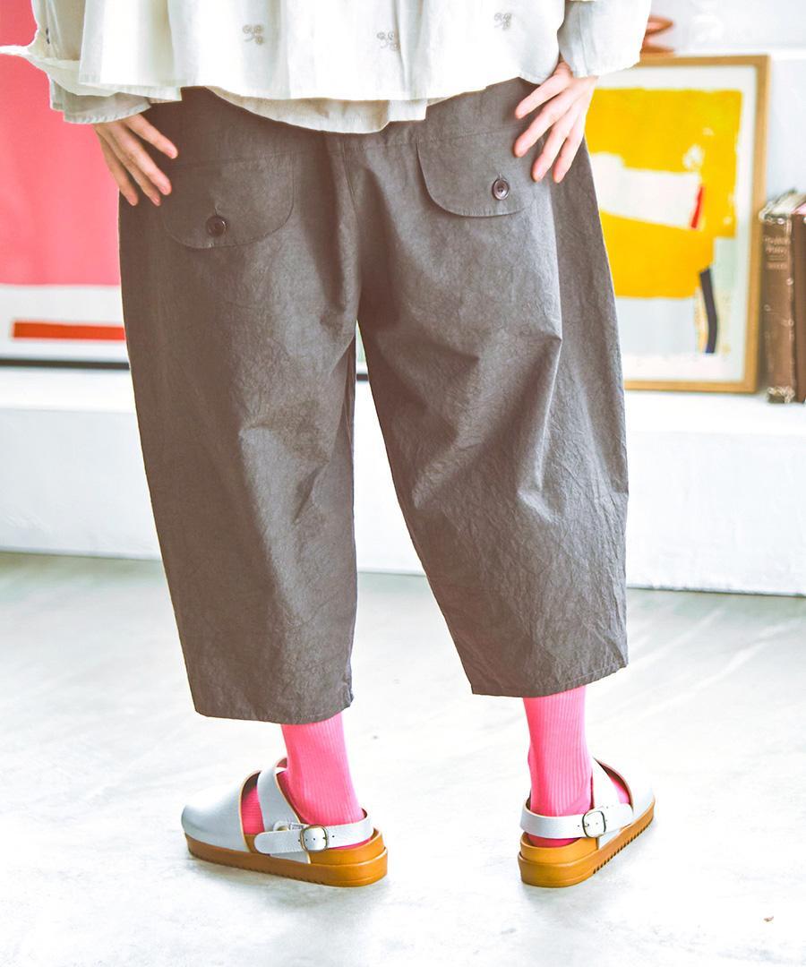 ゆとりのある8分丈シルエットは、体のラインを拾いにくく、足さばきも軽やか。少し下に配置されたバックポケットが視線を下げ、後ろ姿にもさりげないアクセントをプラスします。