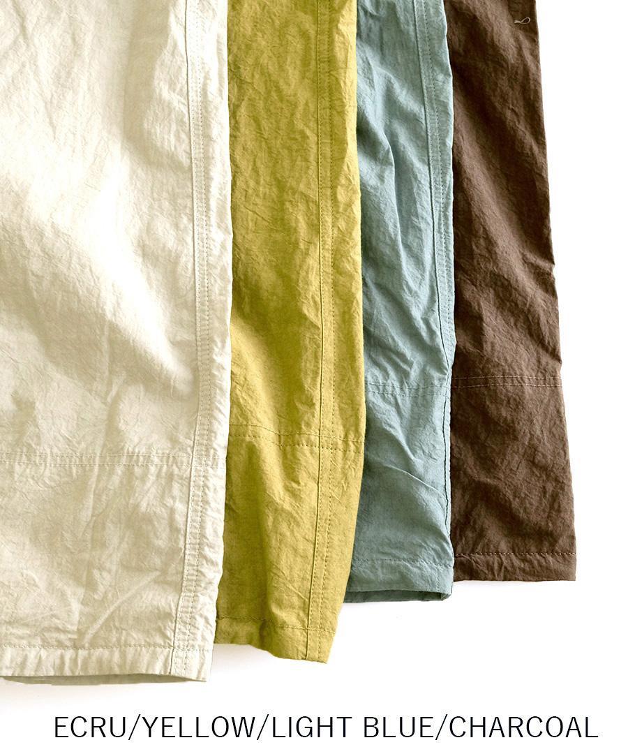 ワイドでストンと落ちるリラックスシルエットでカラダのラインを拾わないのも嬉しいポイント。高密度ながら、とても軽い風合いで肌離れ良くさらりとした穿き心地です。ベルトループ付きなのでウェストインしてもサマになります。