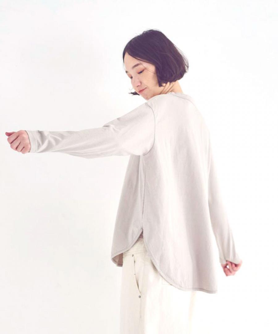 程よい開きのクルーネック、前後差を付けたラウンド裾はもたつかずスッキリ見せて、バックはヒップラインまでカバーしてくれる計算されたシルエット。