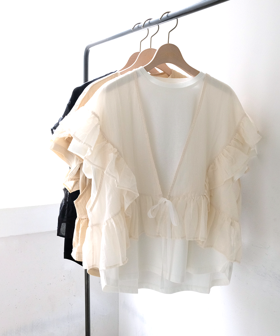 ベーシックなTシャツにほどよい透け感のベストで、1着あるとエアリー感のあるおしゃれで華やかなスタイリングを叶えてくれます。