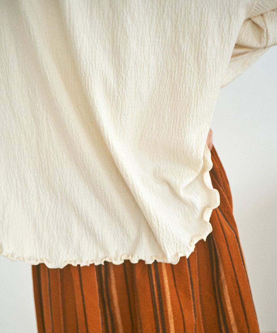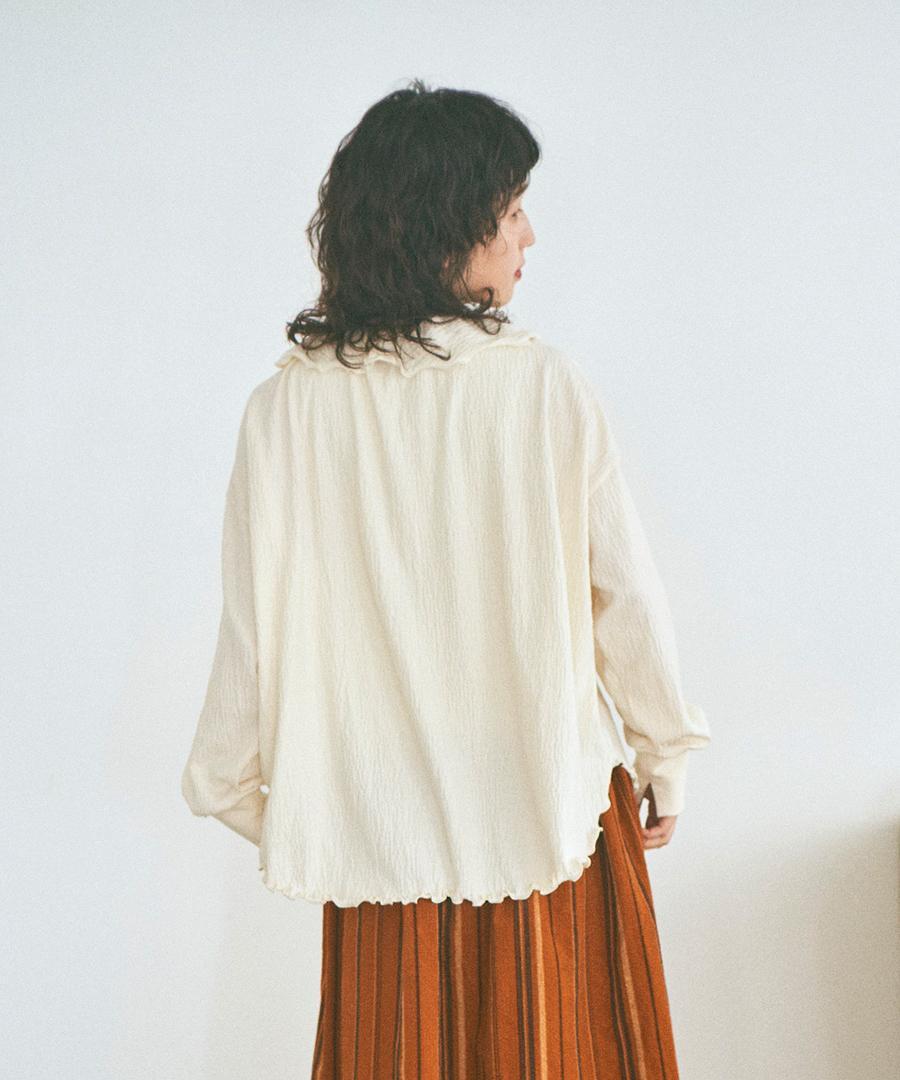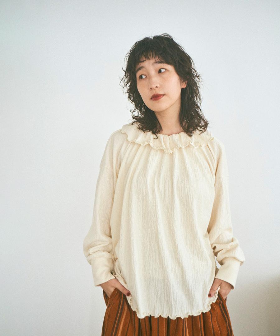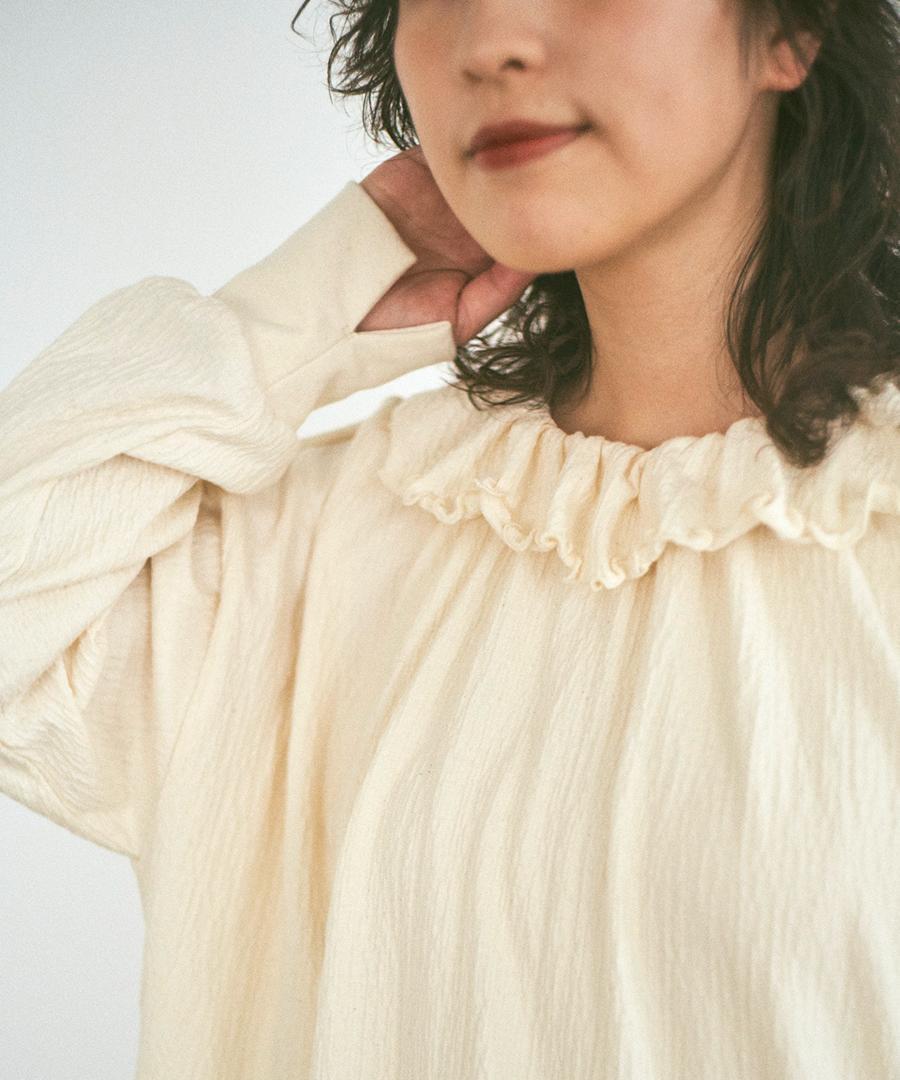 フォールシャーリング天竺素材で仕立てたフリル衿プルオーバー。