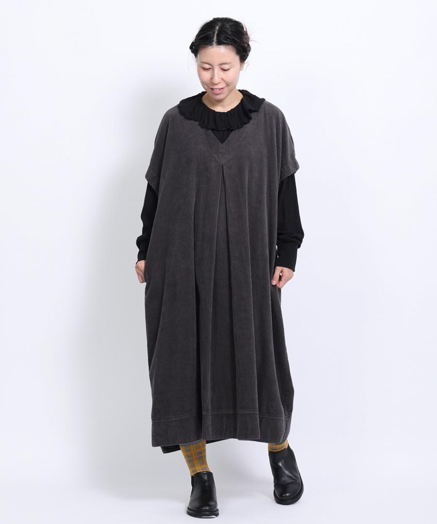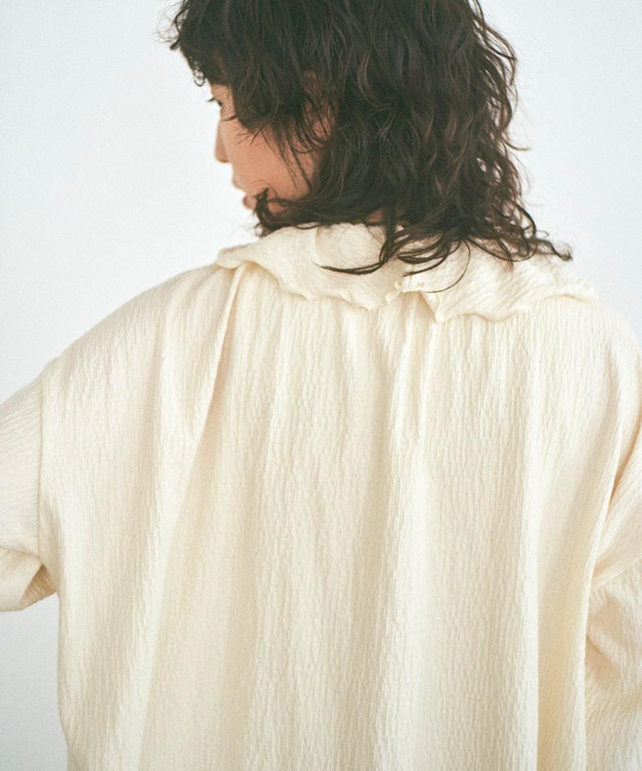 襟元のフリルがさりげなくフェミニンさを演出し、シンプルながらも奥行きのあるデザインに仕上げています。