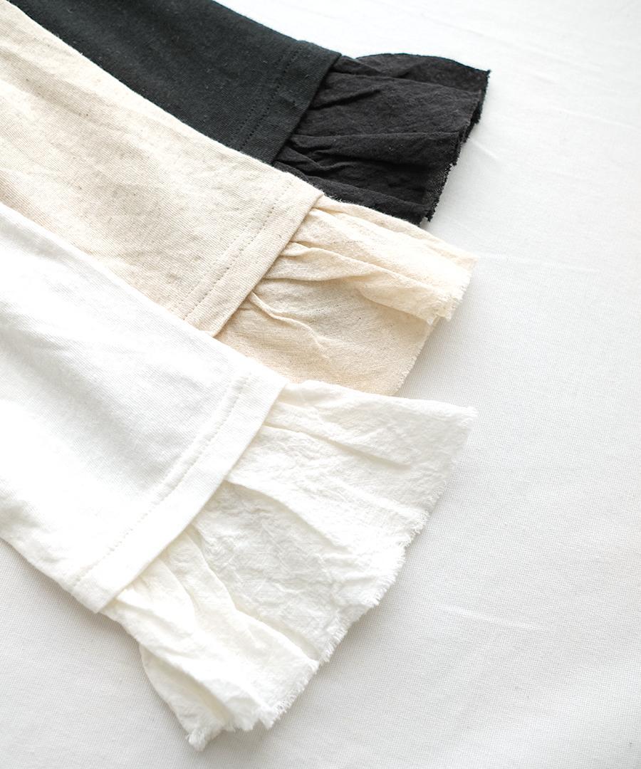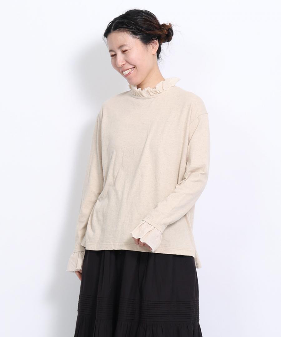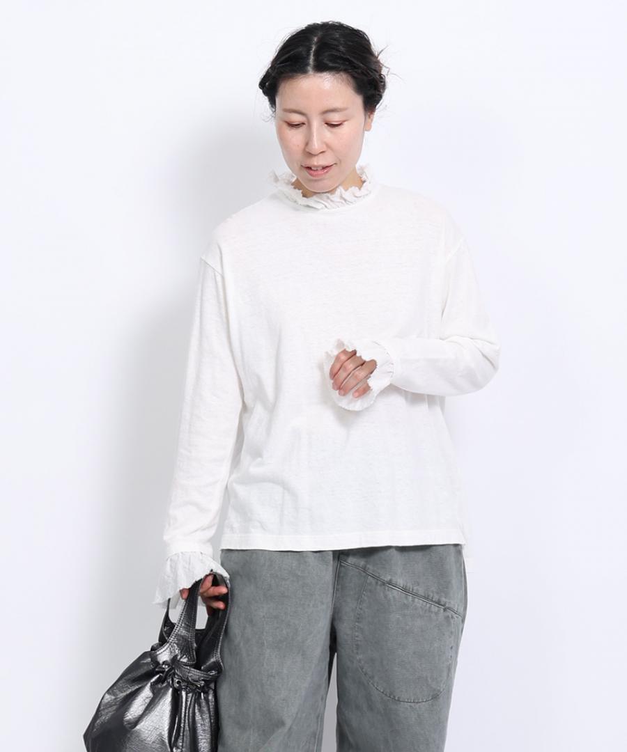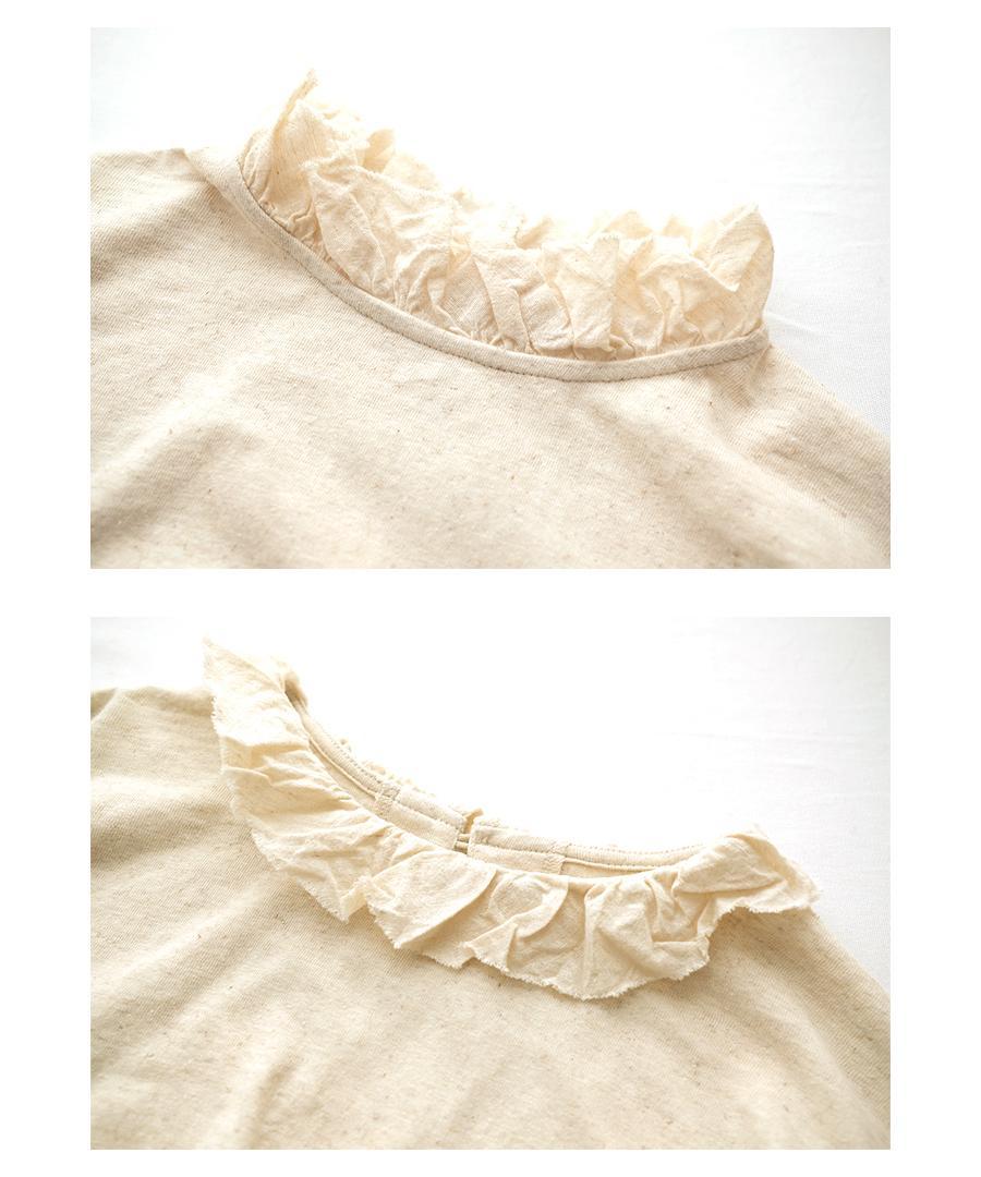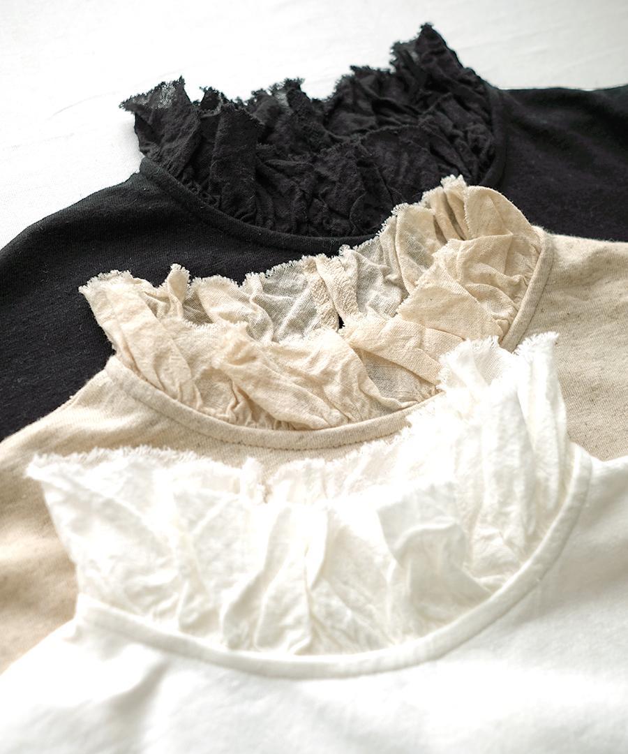 粗野感のあるリネン混のカットソーに、柔らかなガーゼ生地で首元と袖口にフリルをつけました。