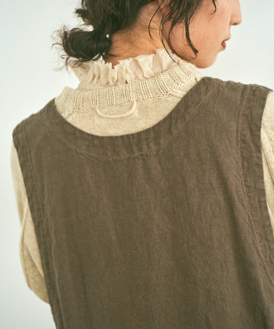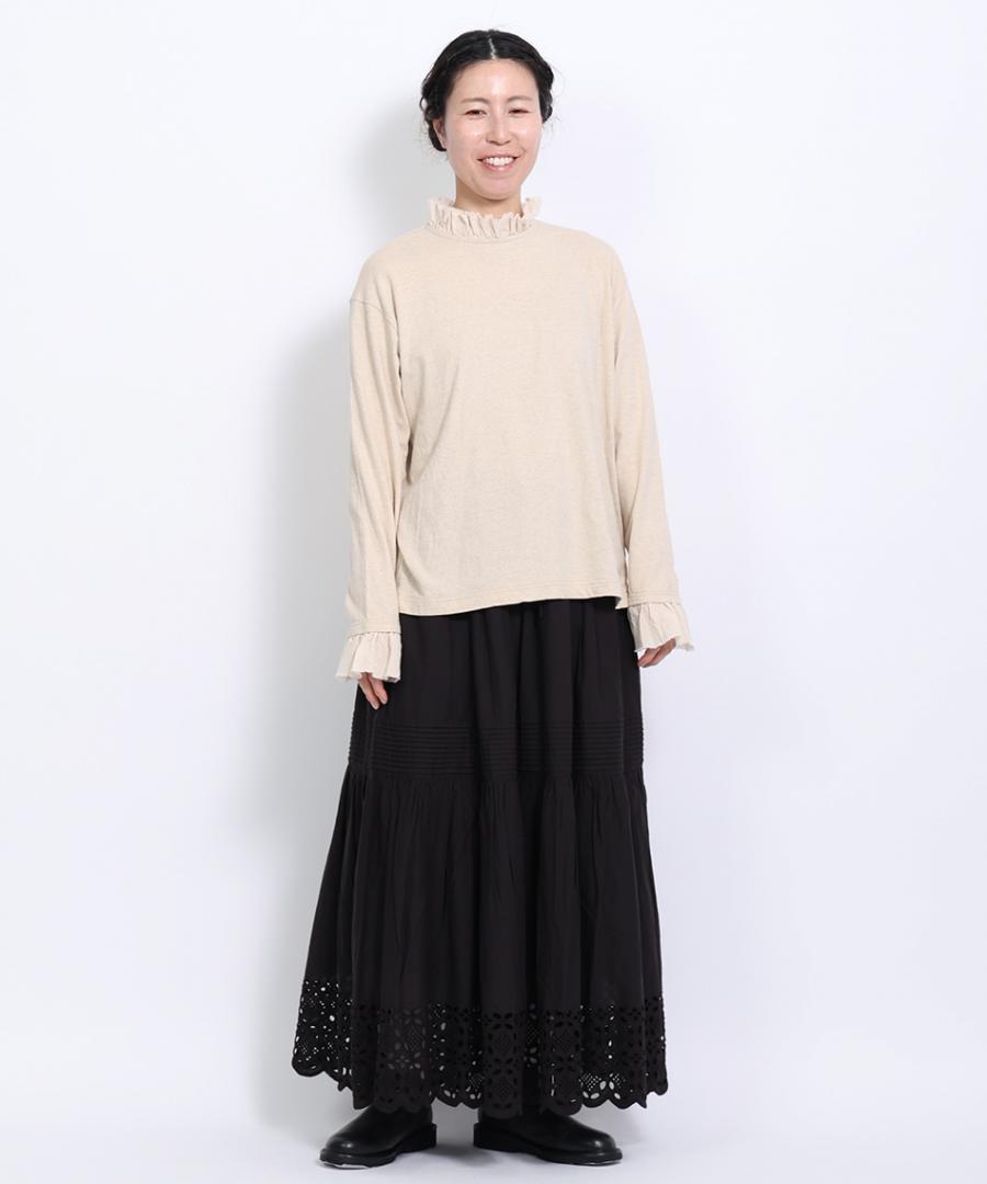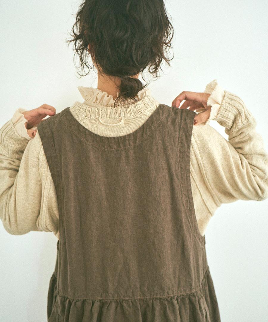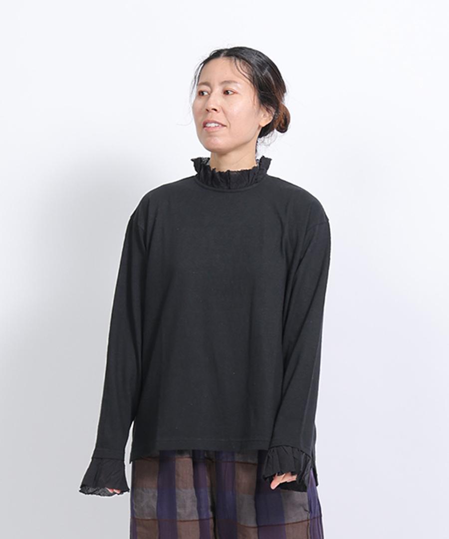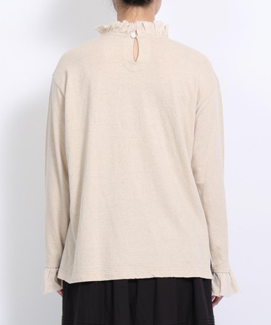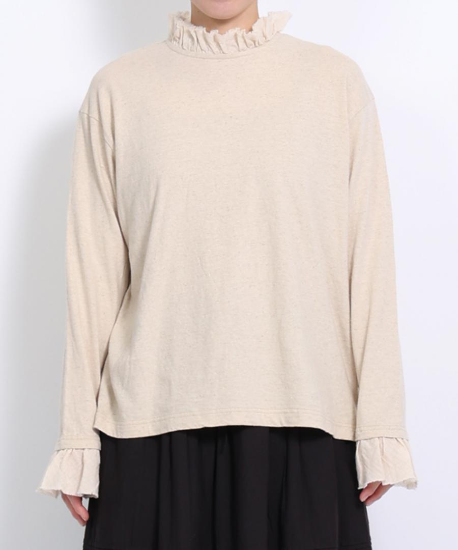 粗野感のあるリネン混のカットソーに、柔らかなガーゼ生地で首元と袖口にフリルをつけました。