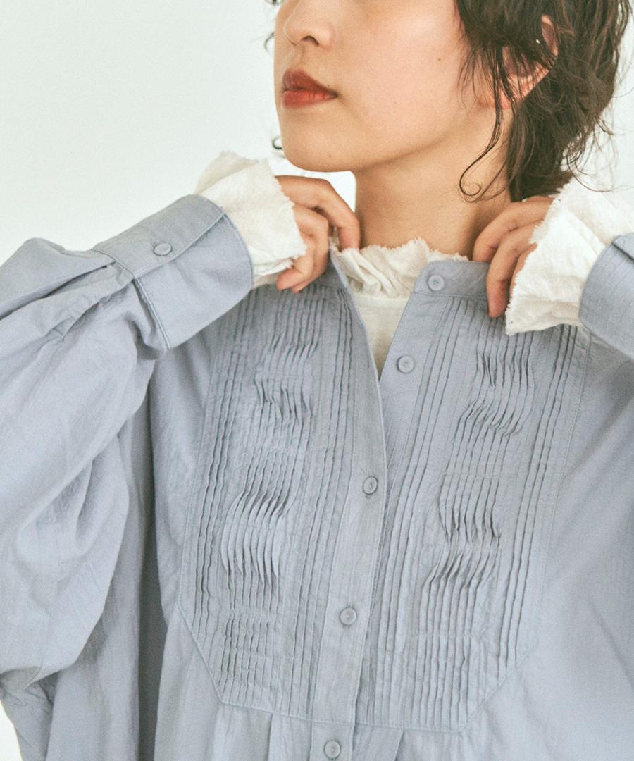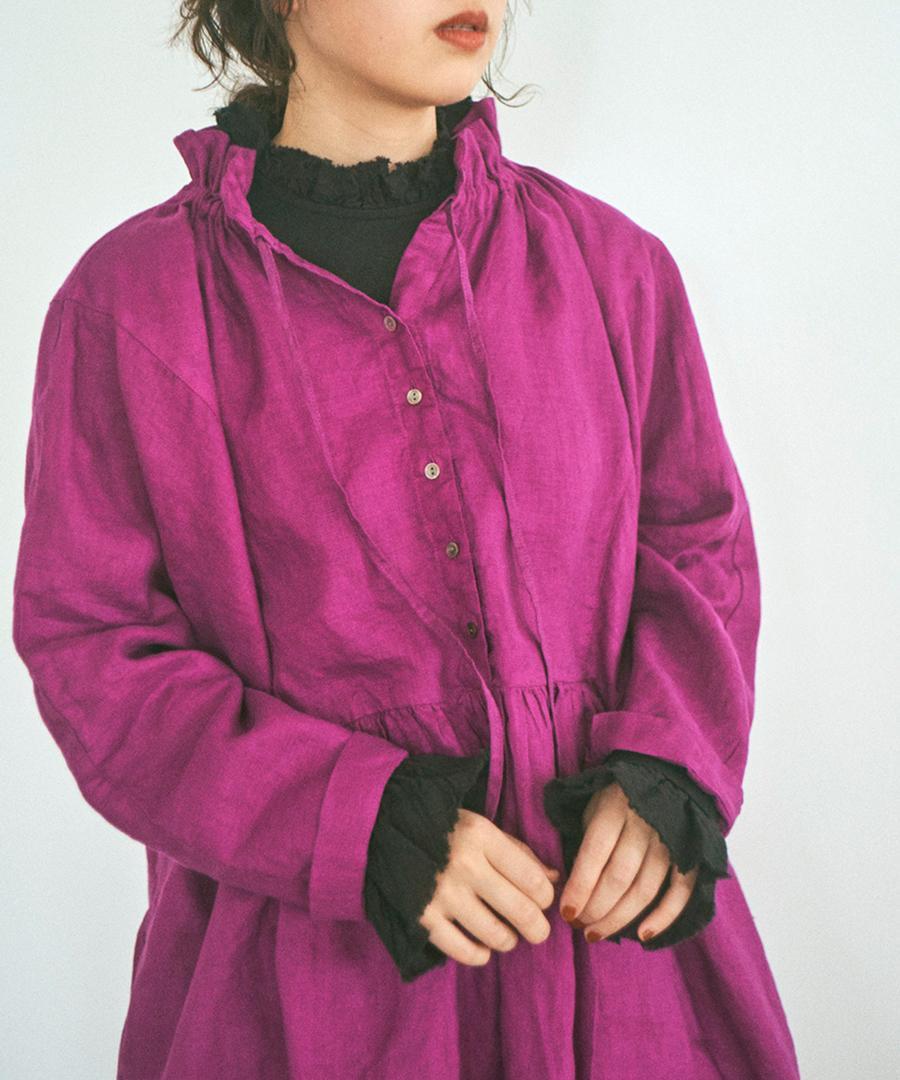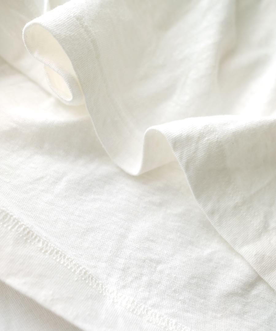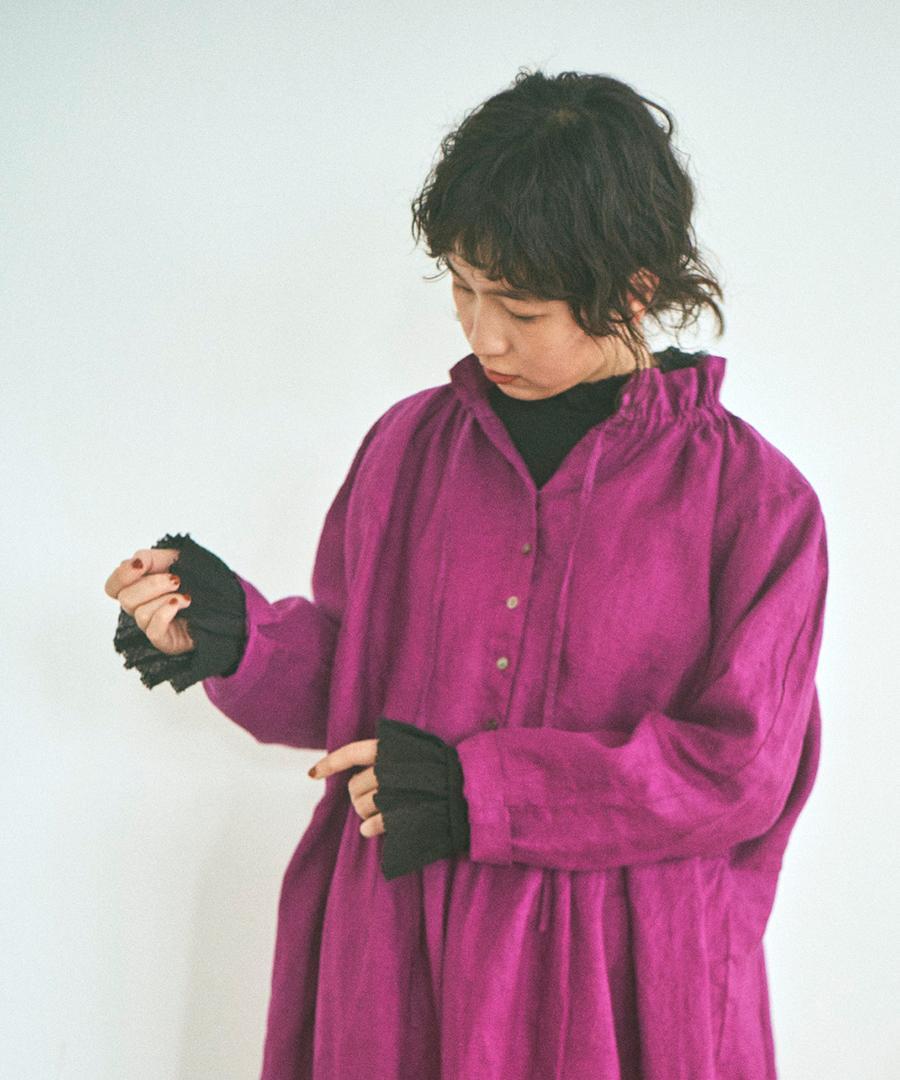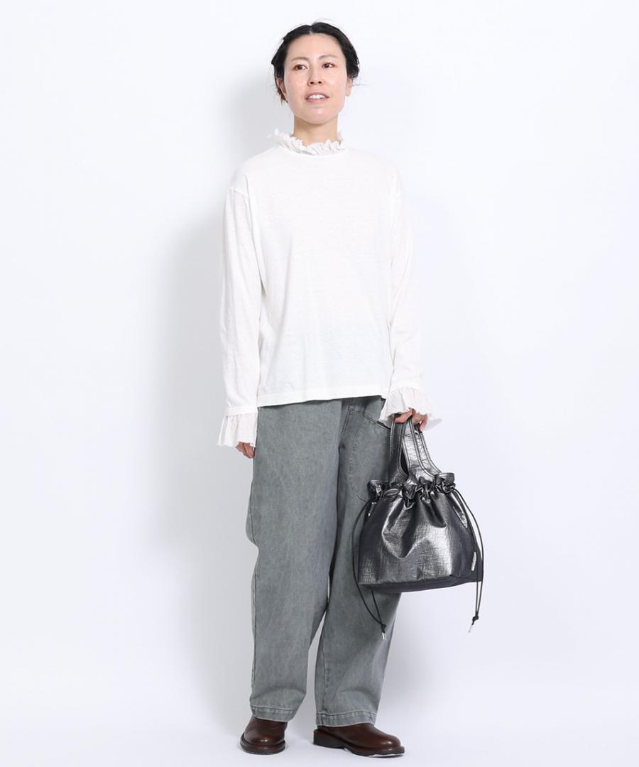 粗野感のあるリネン混のカットソーに、柔らかなガーゼ生地で首元と袖口にフリルをつけました。