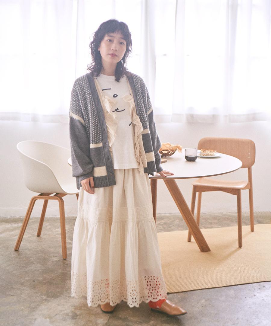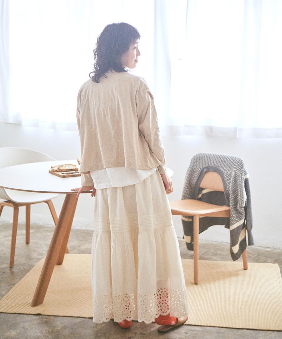 暑い時期はタンクトップに重ねたり、秋から冬にかけてはカーディガンやニットを重ねて。