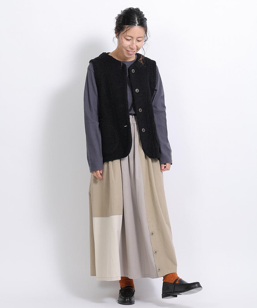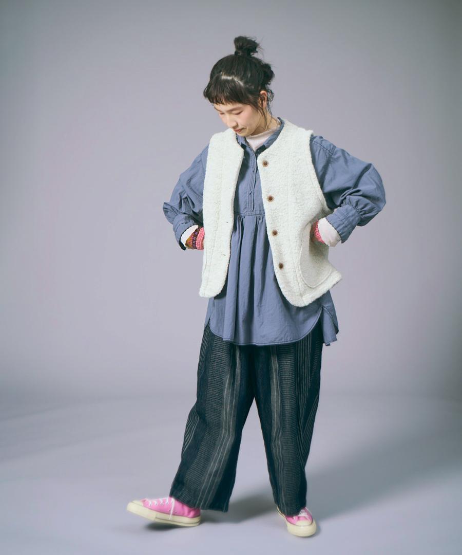 シンプルなデザインながらも天然素材の良さを感じる、日常使いにぴったりなベストです。