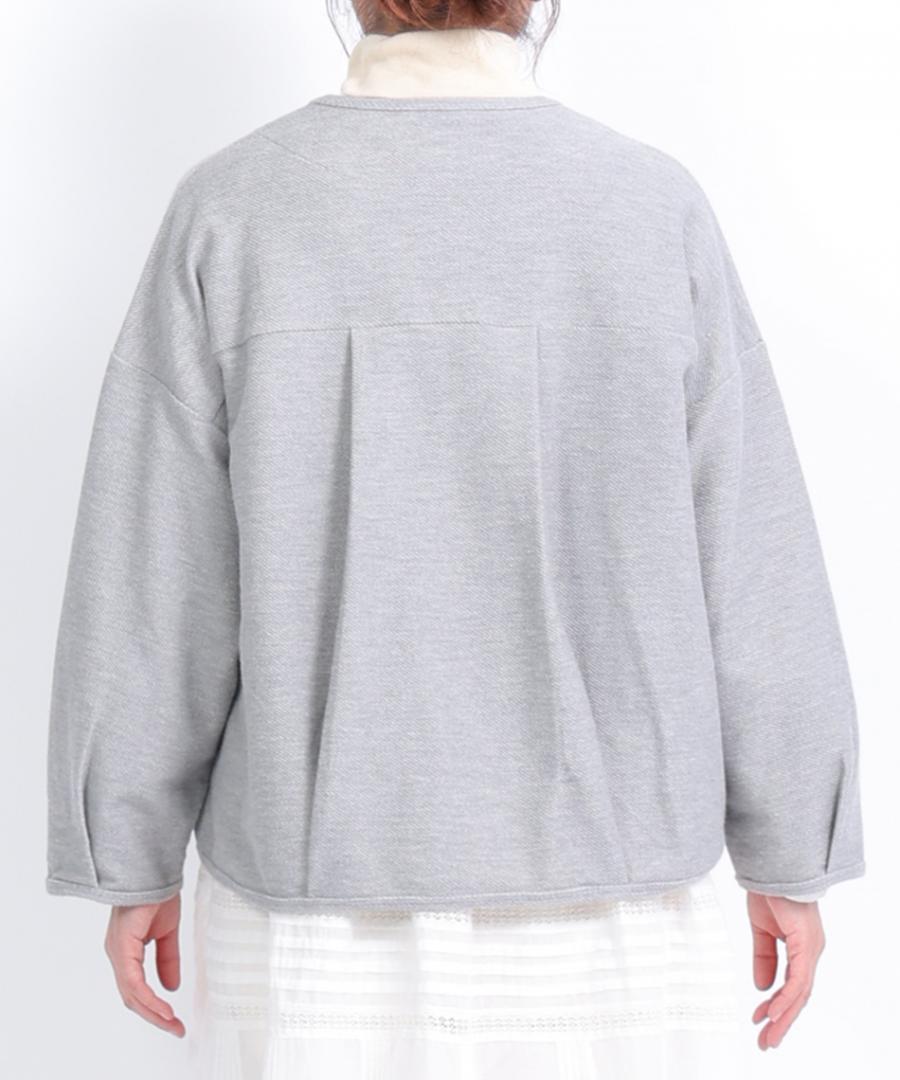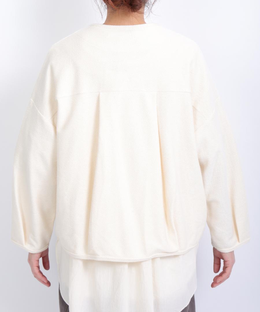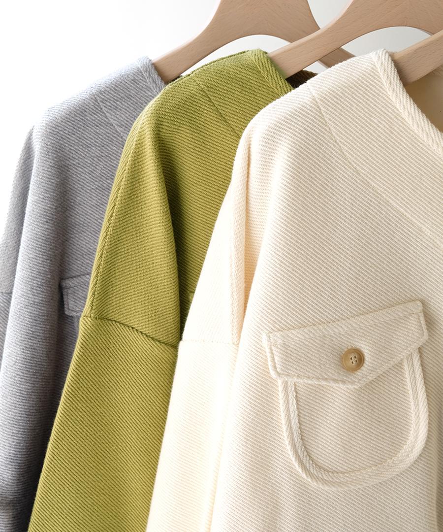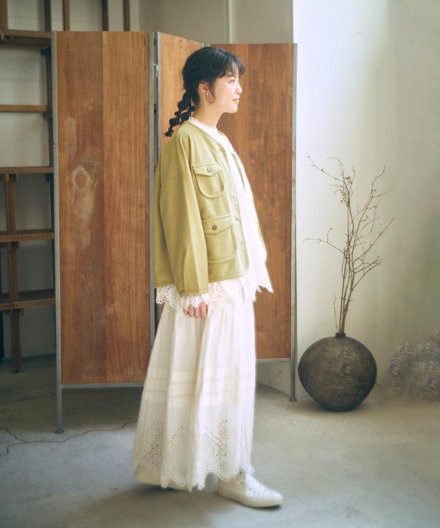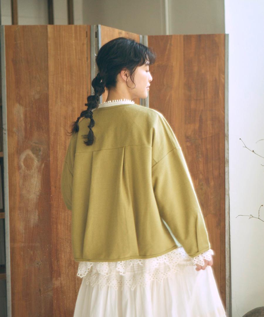 頑丈そうなしっかりと見た目ですが、薄手でとても柔らかなのでカーディガン使いできるのも嬉しいポイントです。上にアウターを重ねていただけますよ。