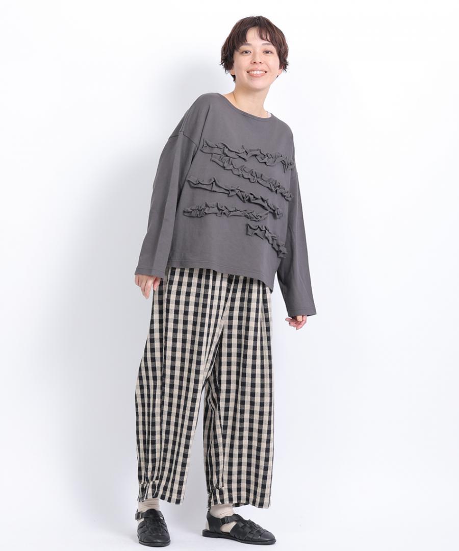 パッチワークワッシャーリネン ギャザーパンツ