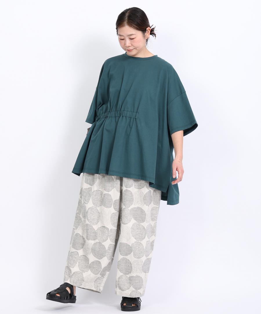 ゆったりとしたフォルムとリボンを結ぶ事で生まれるドレープにより、ウェスト周りをさりげなくカバーしてくれます。袖丈は肘が隠れる5~6分丈で、程よい安心感があります。