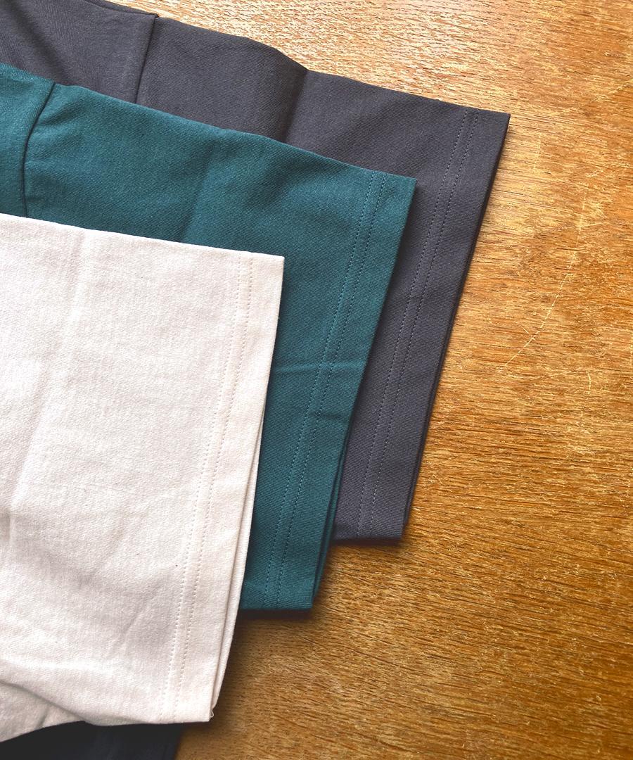 「度詰め」とは、生地の編み目の密度が高いことを意味し、しっかりとした丈夫さと、型崩れしにくいというメリットがあります。